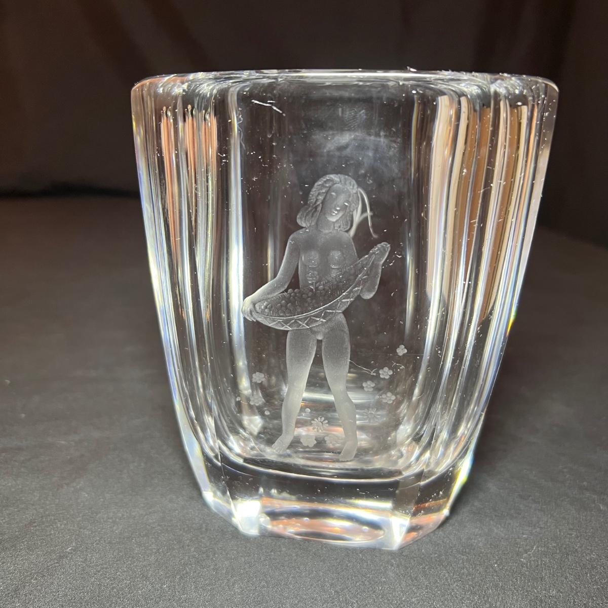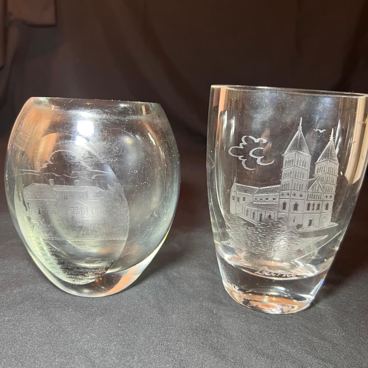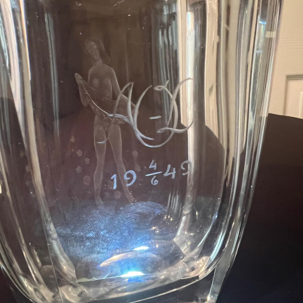 Four glass vases includes a vase with an etched woman has the artists signature and Orrefors. The two vases with etched buildings are possibly also Orrefors but only a signature was found on one, see image. The tallest vase with birds has no marking, it measures 6” x 2.5” x 7”H.
