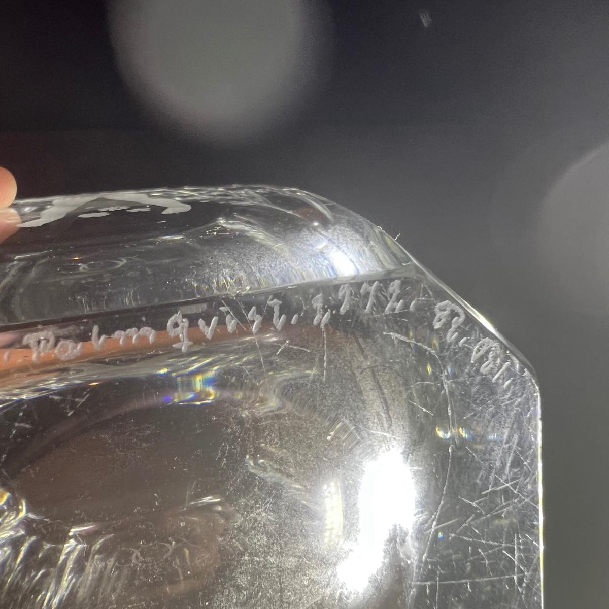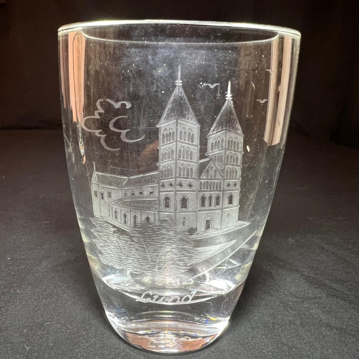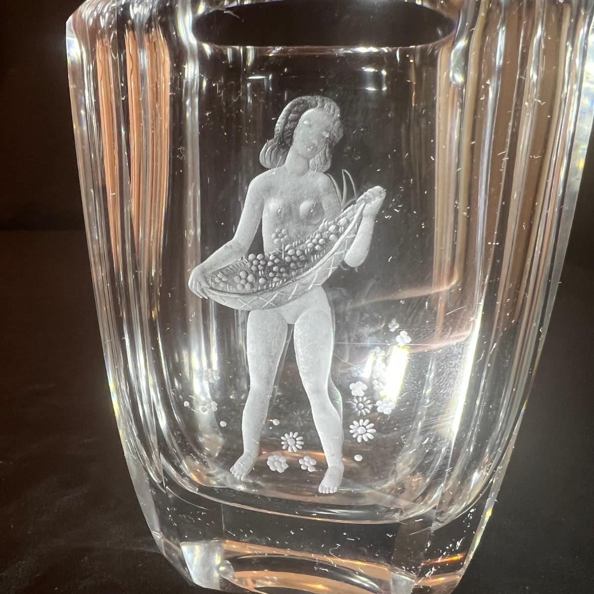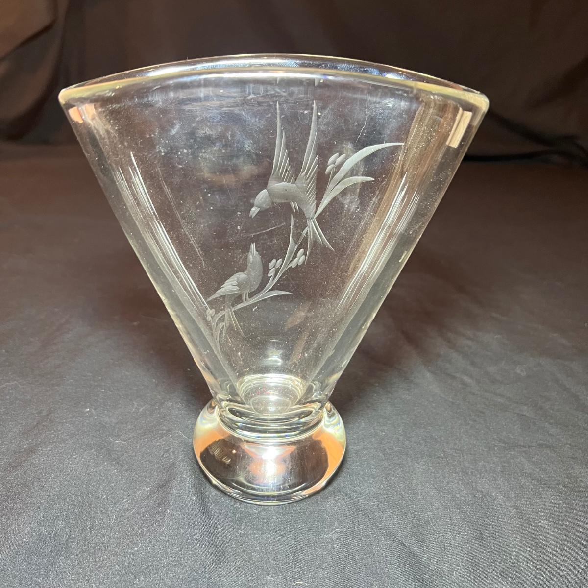 Four glass vases includes a vase with an etched woman has the artists signature and Orrefors. The two vases with etched buildings are possibly also Orrefors but only a signature was found on one, see image. The tallest vase with birds has no marking, it measures 6” x 2.5” x 7”H.