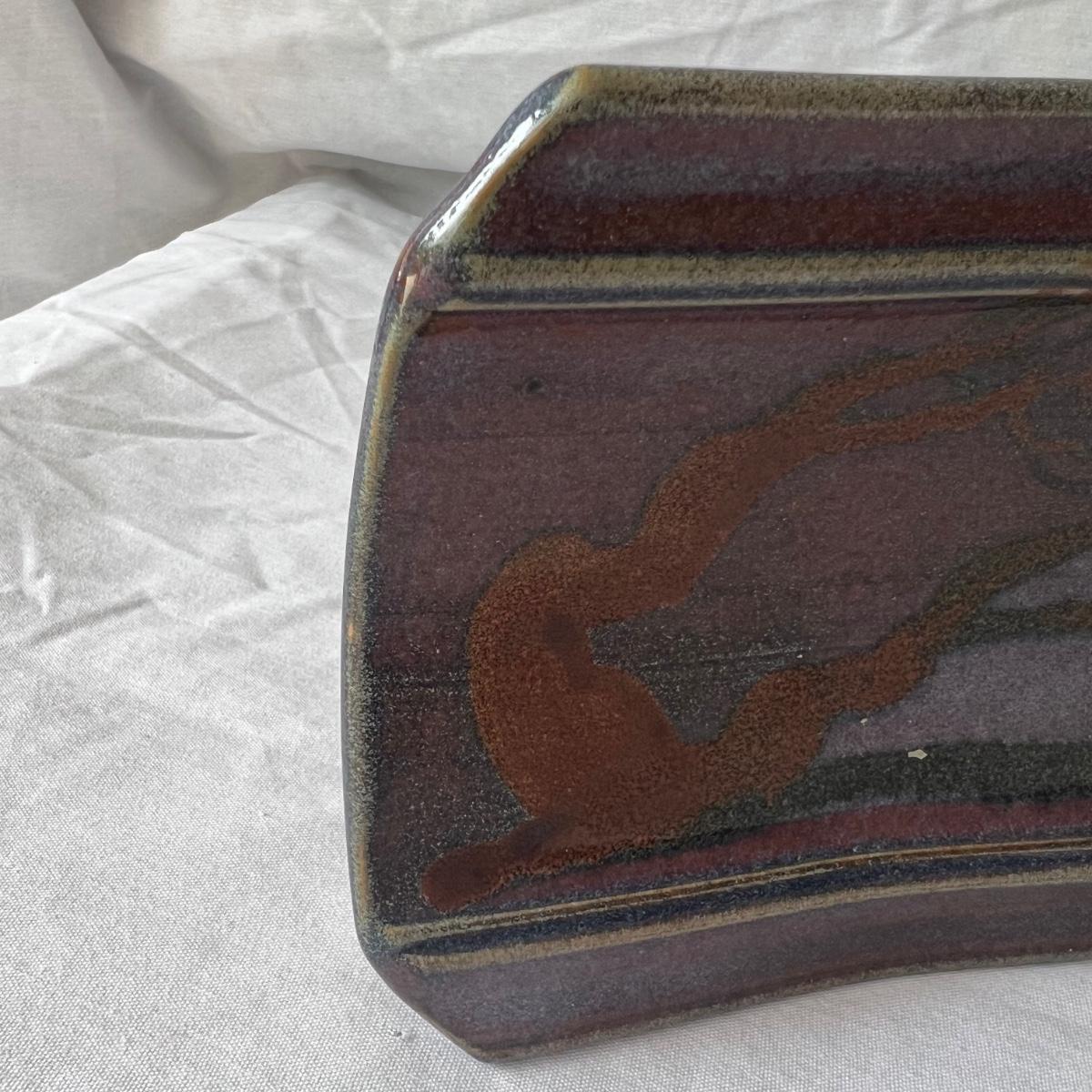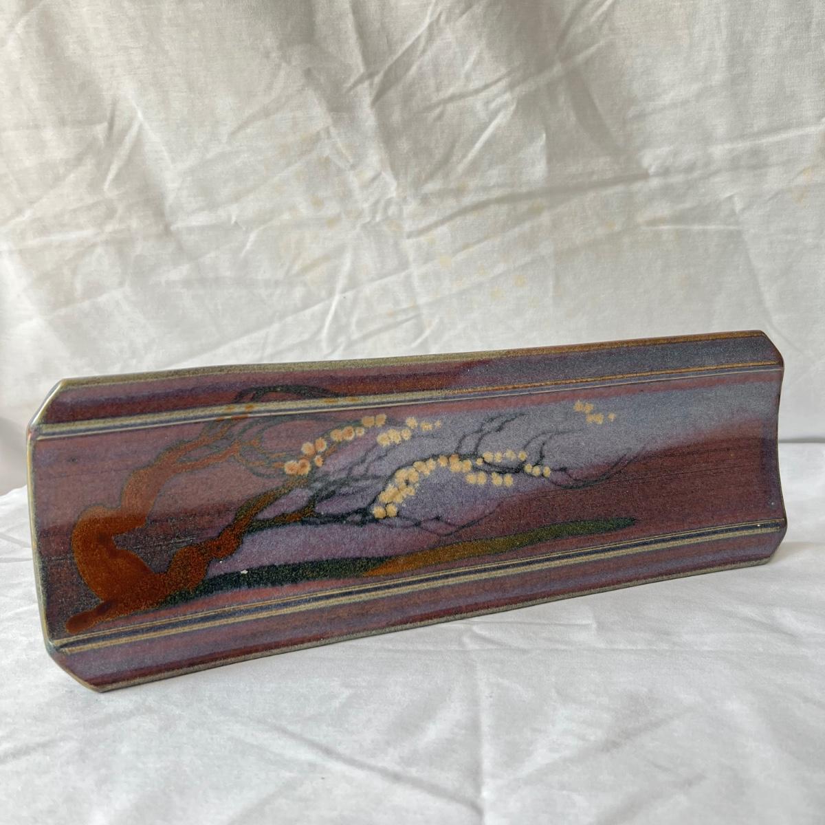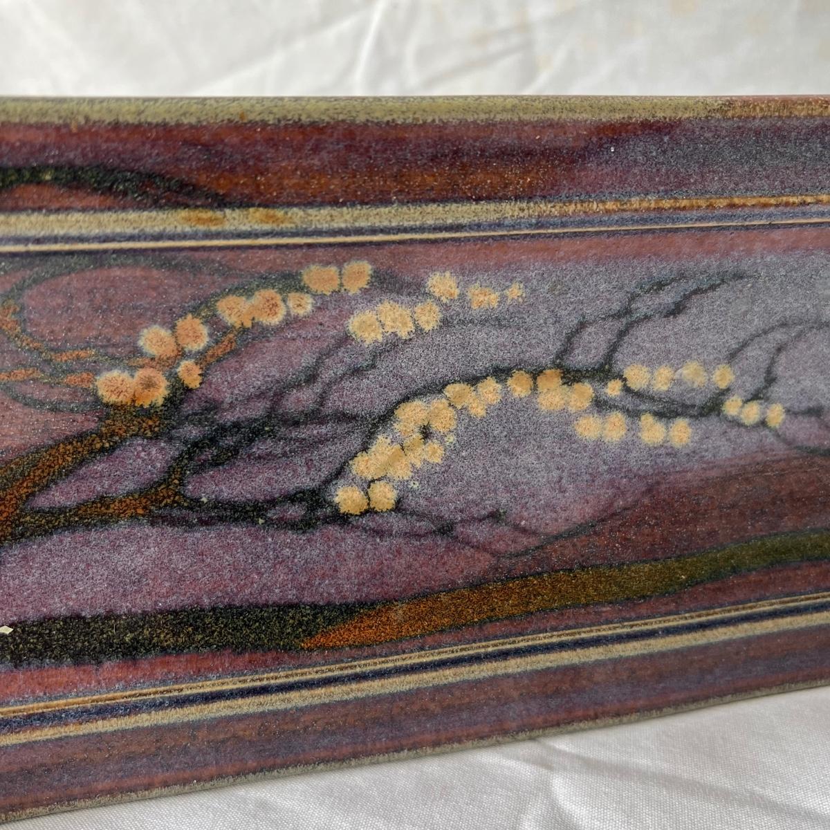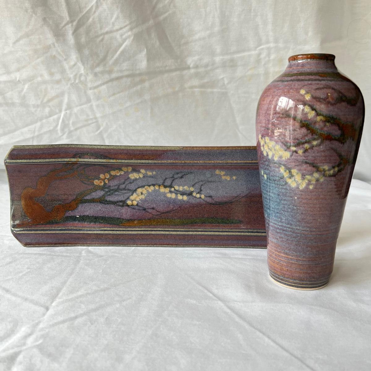 Both these signed pieces of pottery appear to be by the same artist; signature possibly reads Parker. The slab built platter has the same purple glaze and both feature an Asian style tree motif.