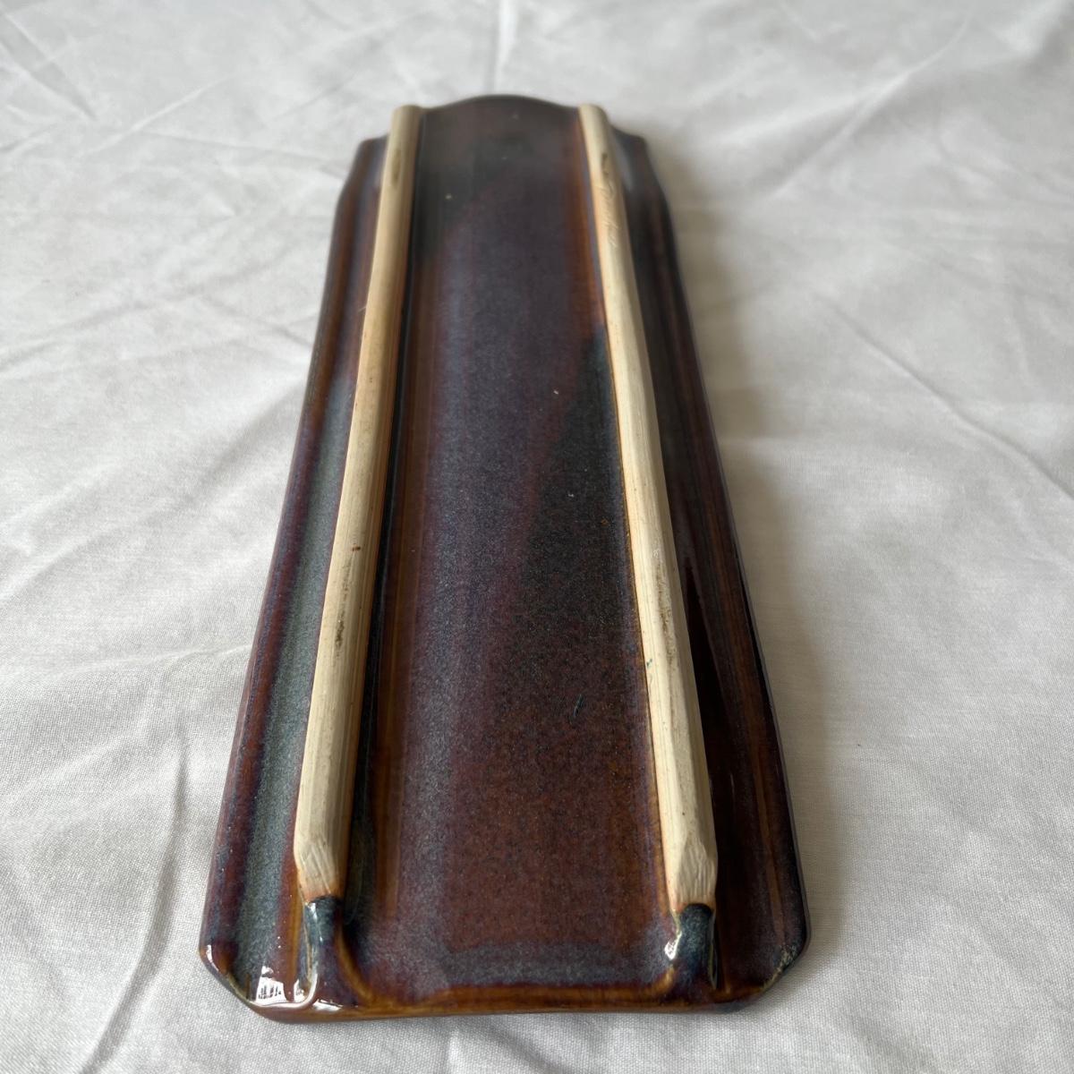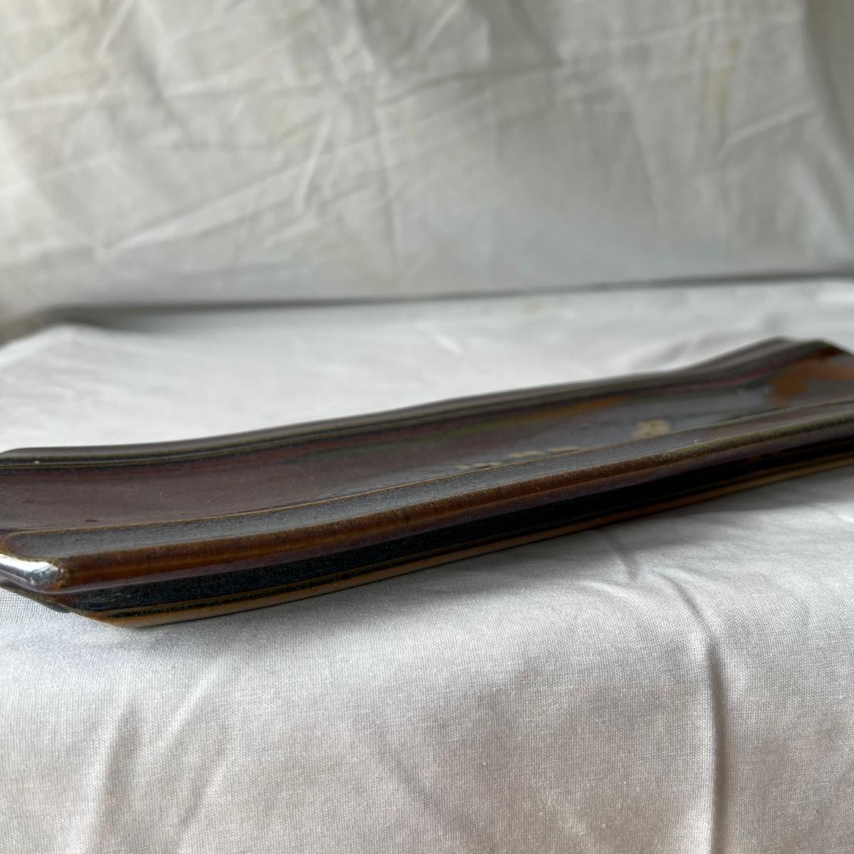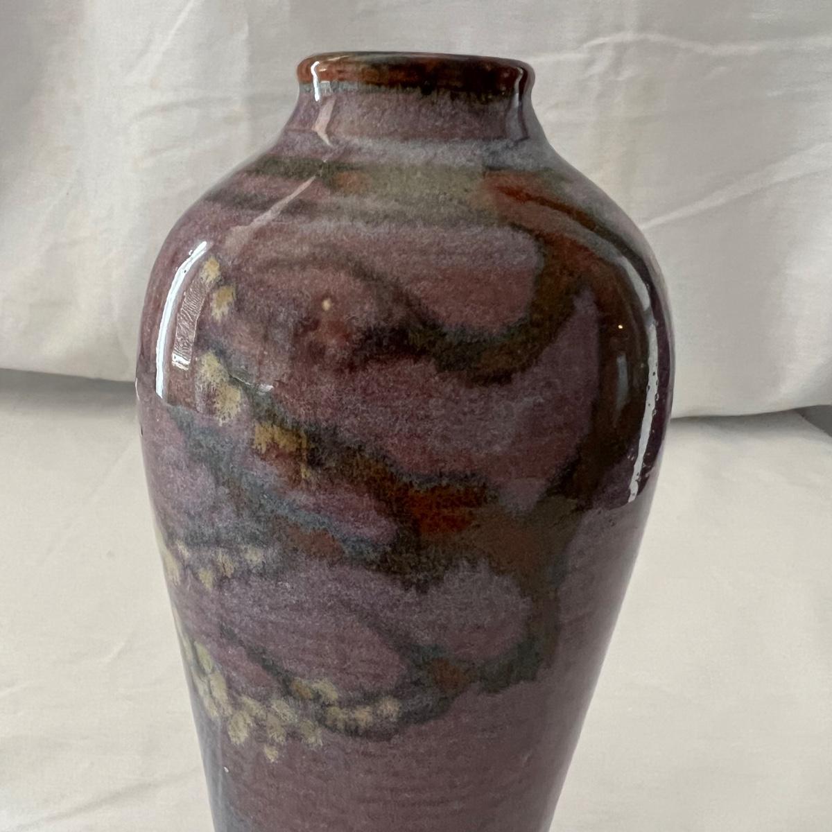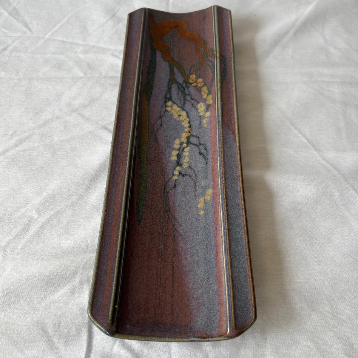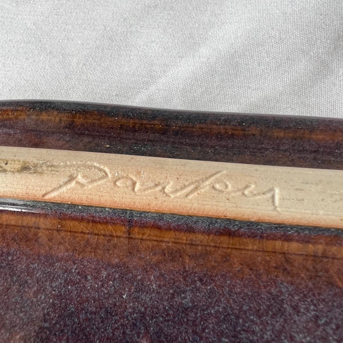 Both these signed pieces of pottery appear to be by the same artist; signature possibly reads Parker. The slab built platter has the same purple glaze and both feature an Asian style tree motif.