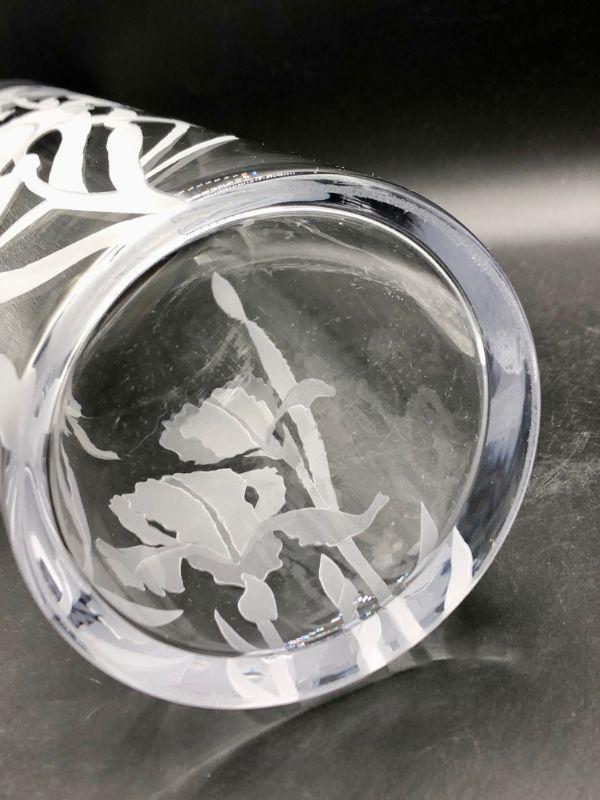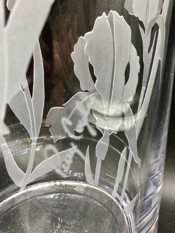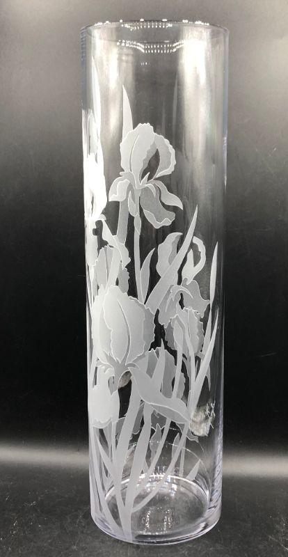 Signed PERRY COYLE Iris flower Vase Etched Cut Glass 19" tall cylinder