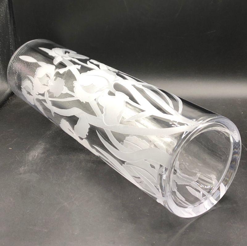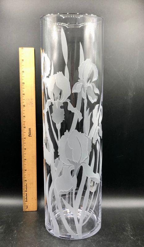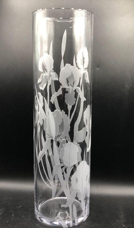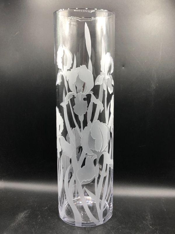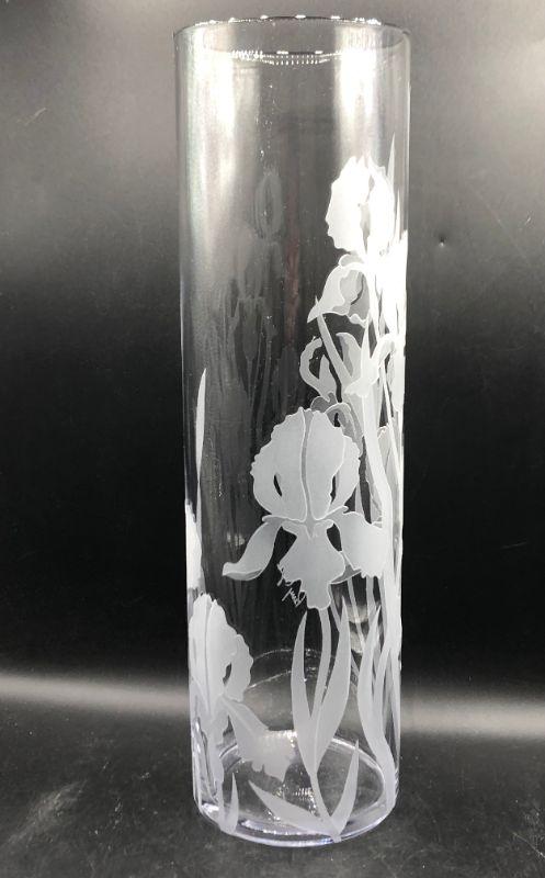 Beautiful Iris etched Perry Coyle vase. This floral etched Perry Coyle vase measures 19" x 5". In excellent condition.