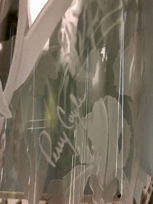 Signed PERRY COYLE Iris flower Vase Etched Cut Glass 19" tall cylinder