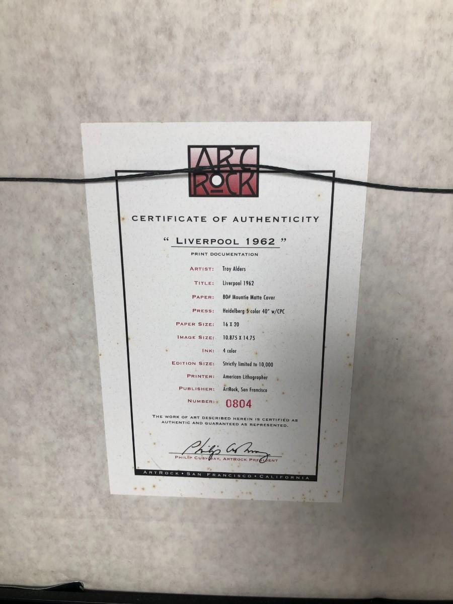 Signed and Framed with a Certificate of Authenticity. Signed by Pete Best. Made by ArtRock in San Francisco. 4 ink color lithograph by artist Troy Alders. In very good condition.
