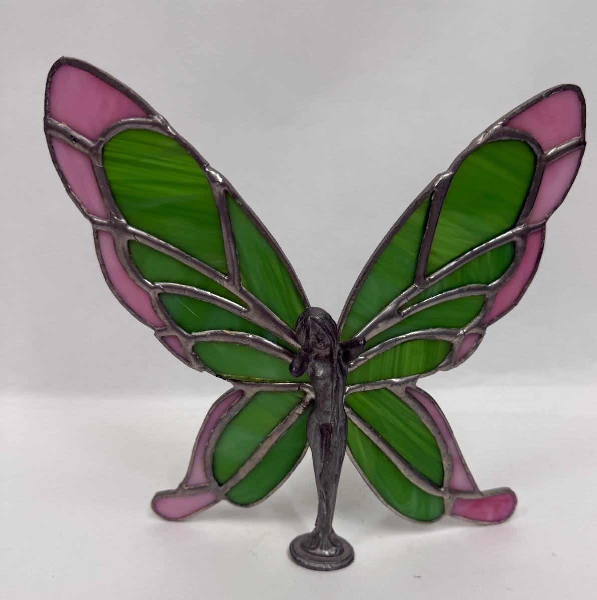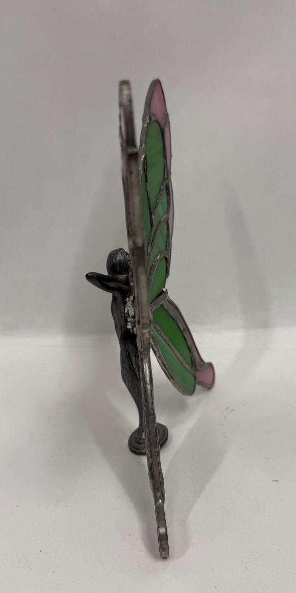 Artist Signed Pewter Fairy or Angel Sculpture Figure with Stained Glass Butterfly Wings