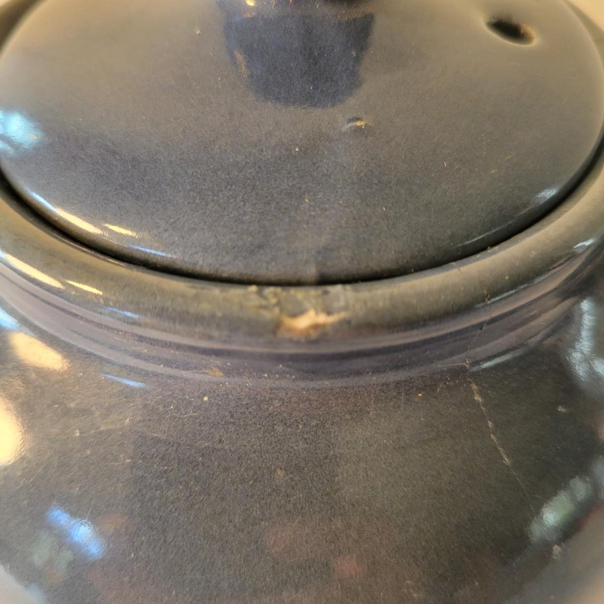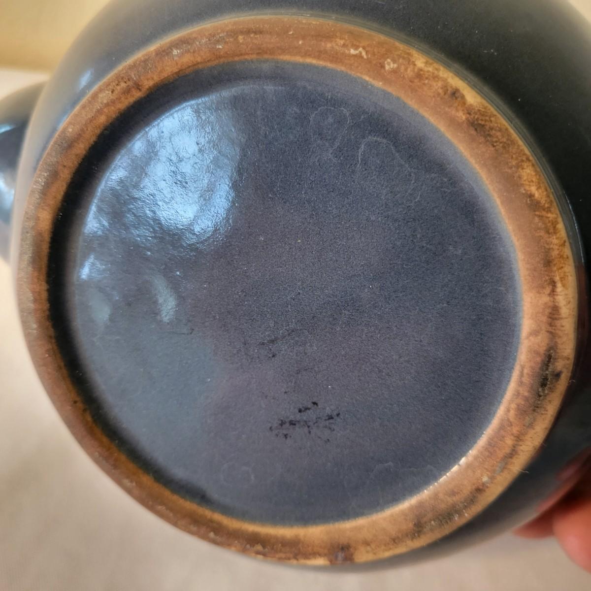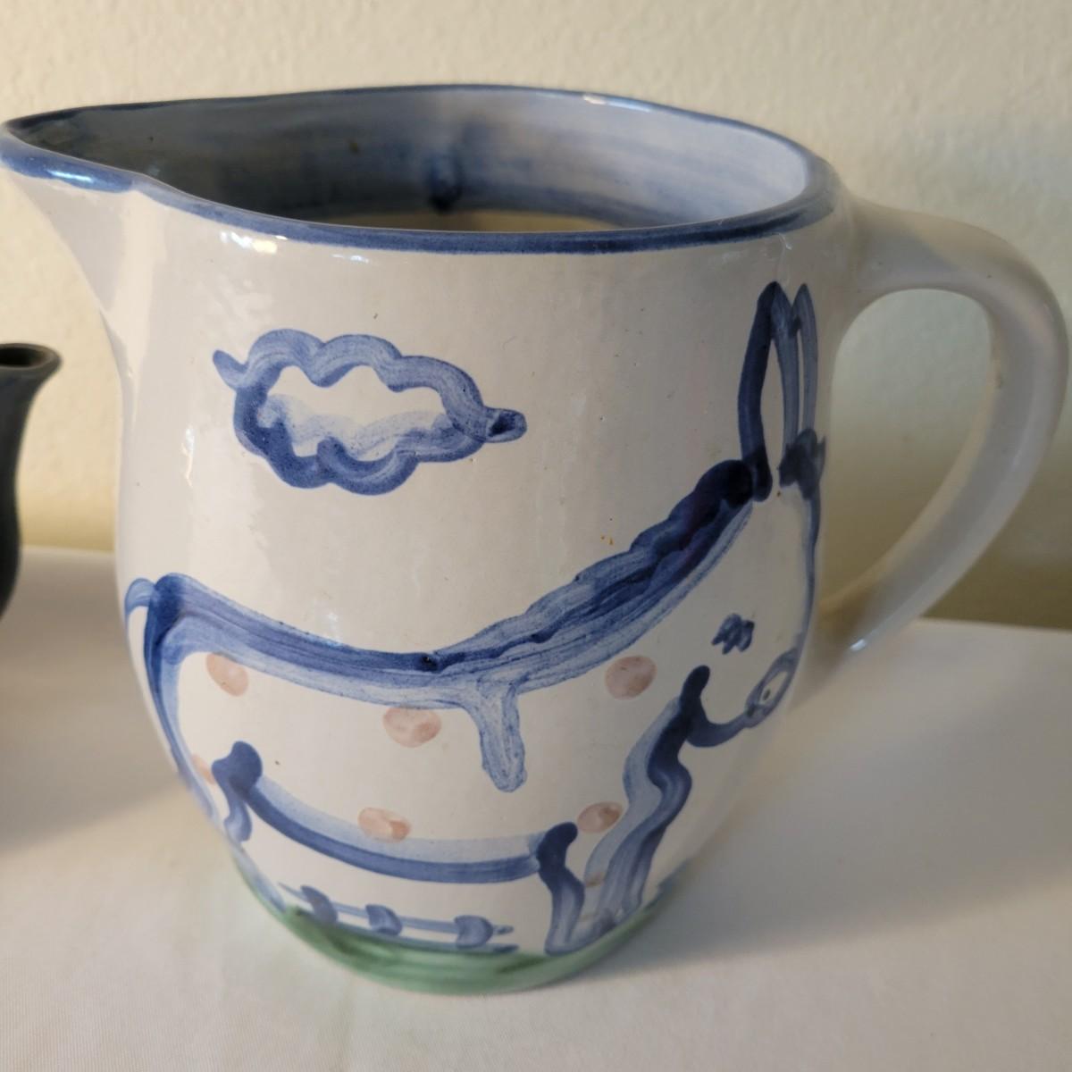 A pitcher and tea pot in good condition. The tea pot does have some minor blemishes. The pitcher appears to be hand painted and features a donkey. It is a glazed pottery piece signed by M.A. Hadley and measures approximately 9" x 5" x 7.5". Also included is a simple ceramic teapot with a blue glaze. Shipping available. Shipping can be costly. We suggest calling our local UPS with dimensions and getting an estimate before bidding: (828) 252-6930