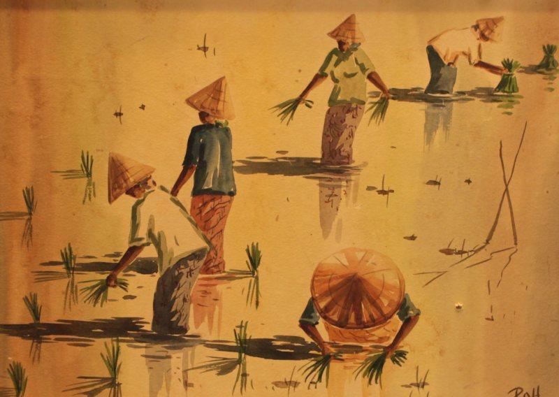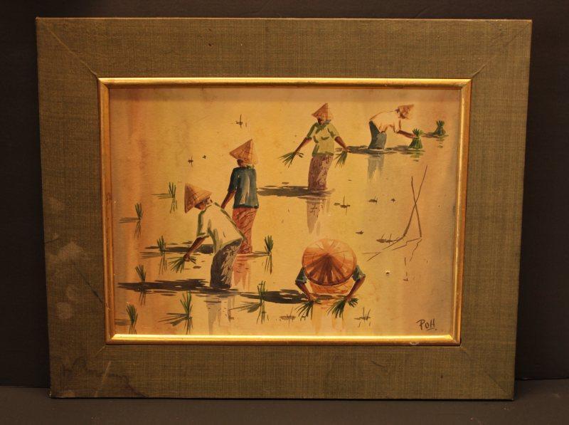 Description: Signed Poh framed water color painting Asian rice paddy. Measurement approximate: Image 10.75 H X 14.5 W/ framed 16 H X 20 W. Material: Water color. Shipping cost $45 Excluding California, Alaska & Hawaii.
