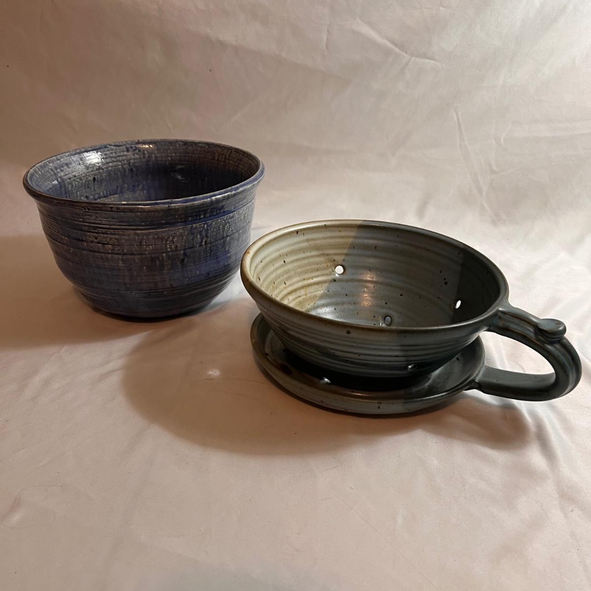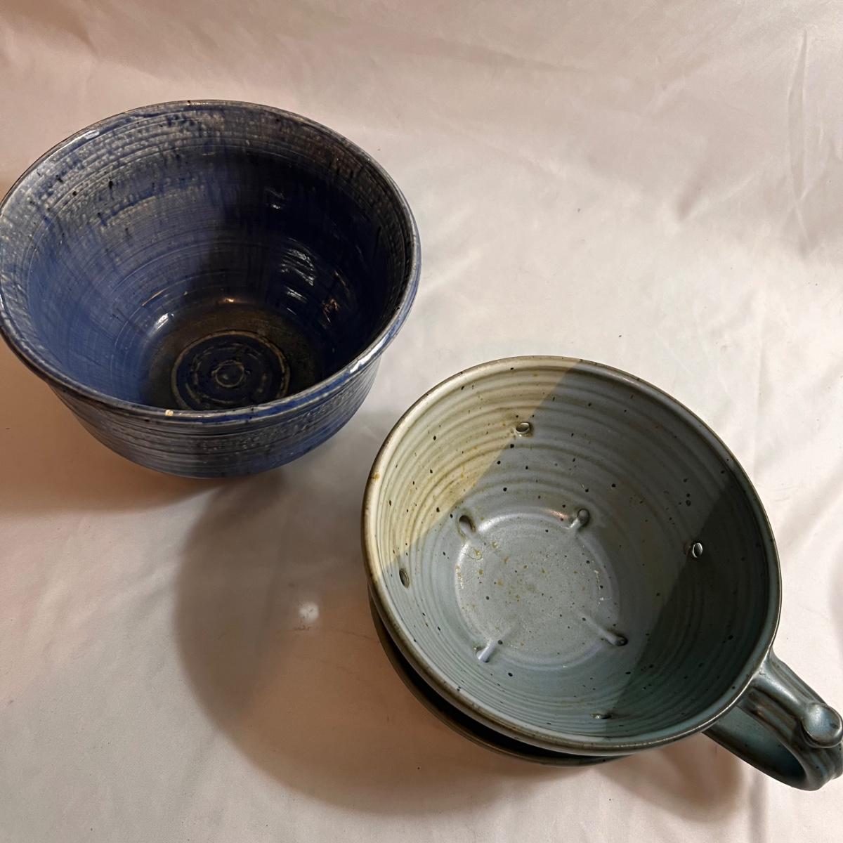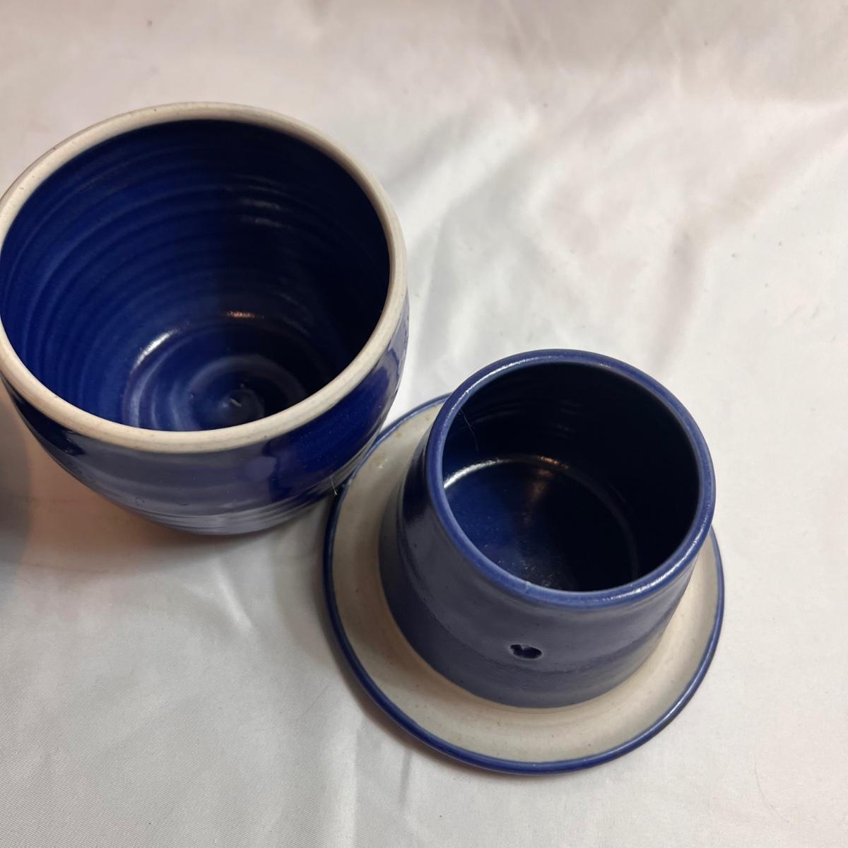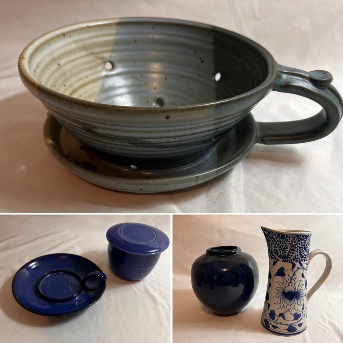 Signed Pottery Berry Strainer & Butter Keeper Plus More Blue Pottery (K-RG)