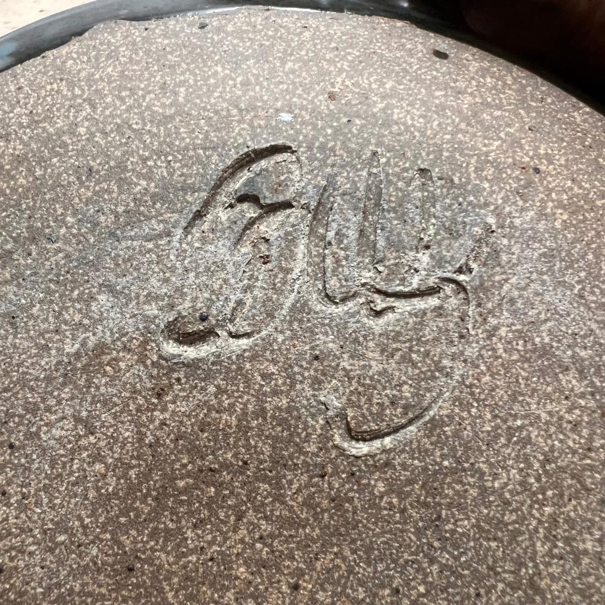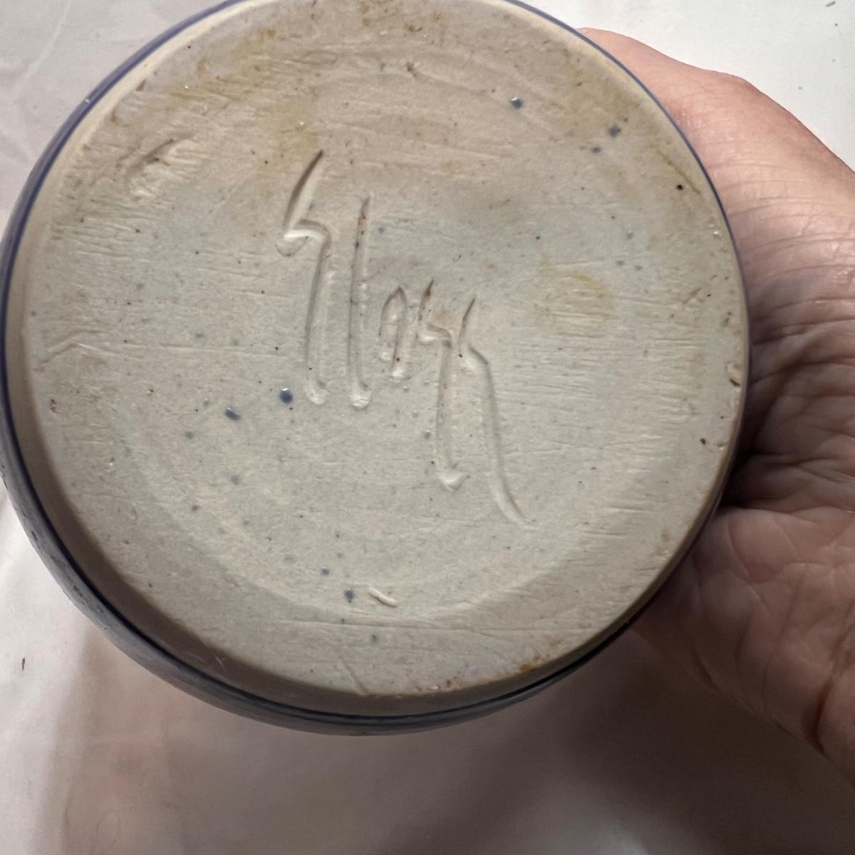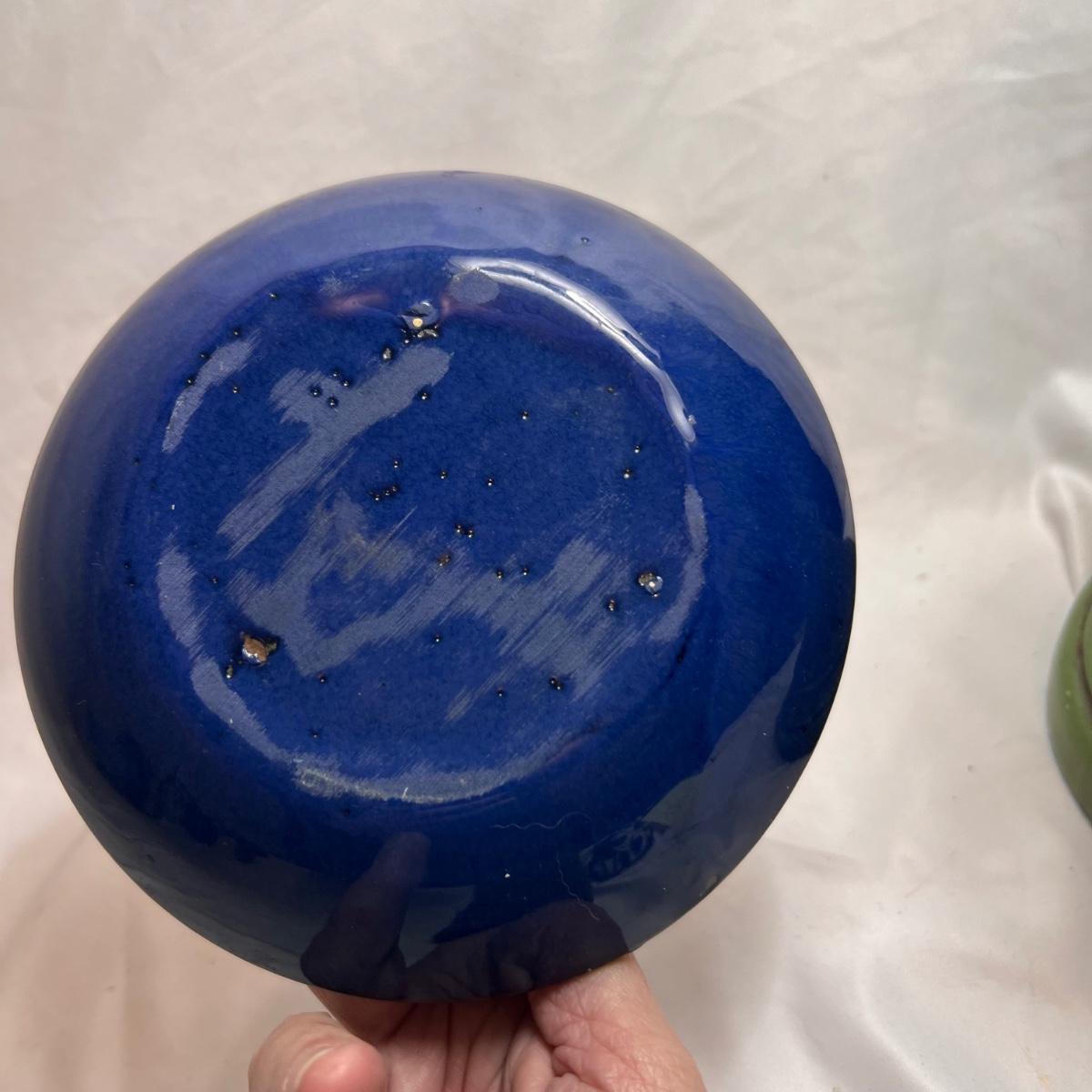 Eight pottery pieces includes a handled pottery berry strainer that has a signature. The cobalt blue butter keeper is also signed. See images for full inventory.