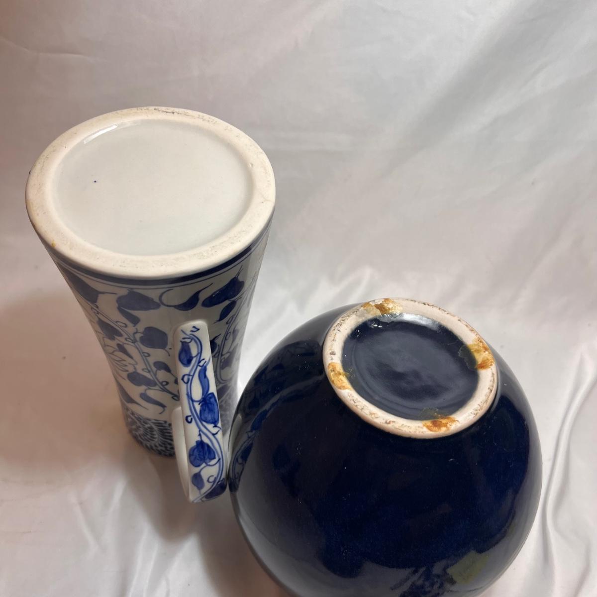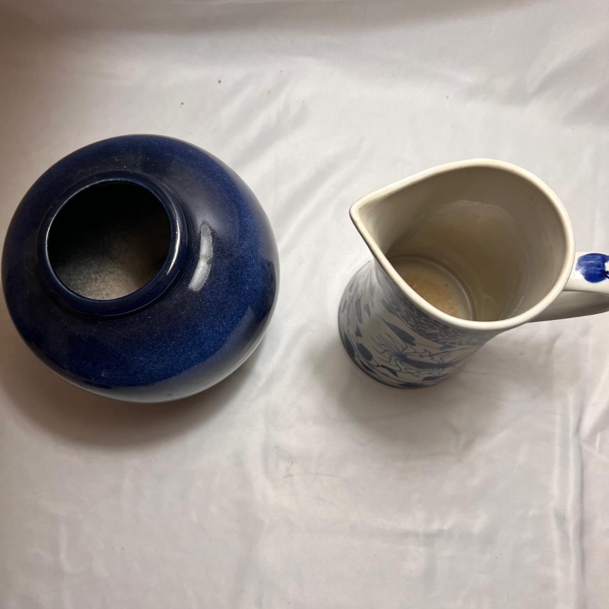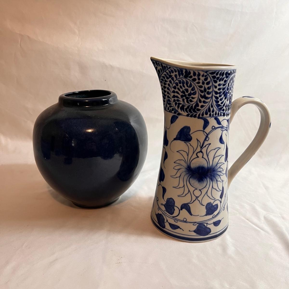 Blue/white pitcher measures 4”D (base) x 9”H.