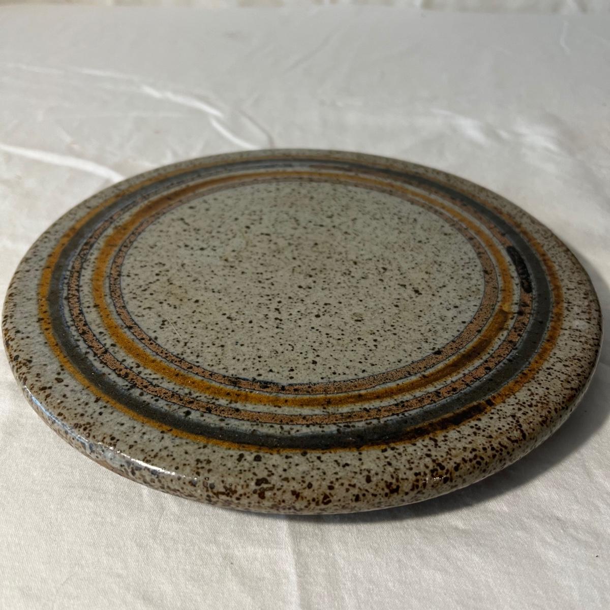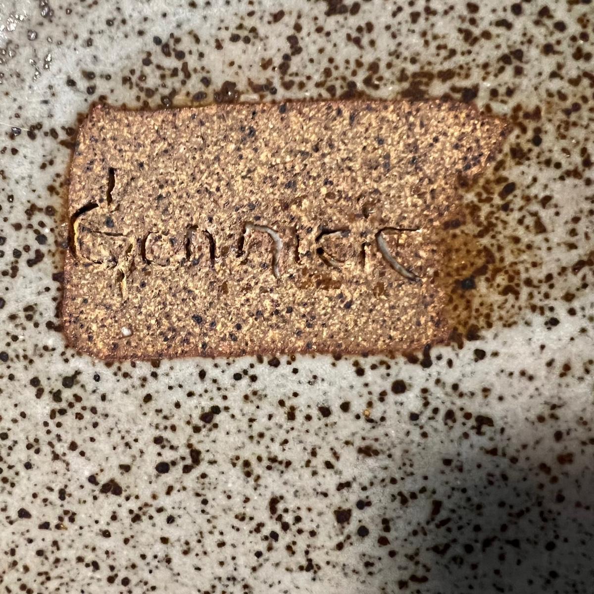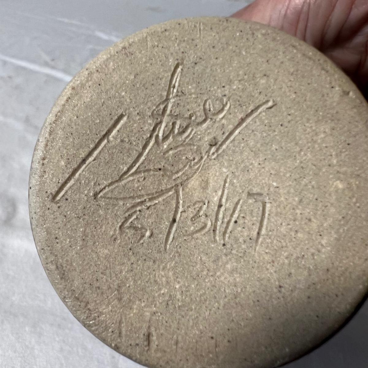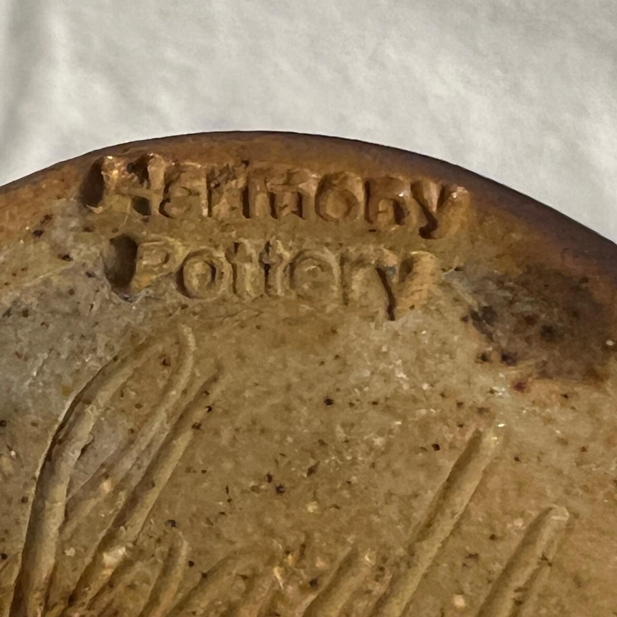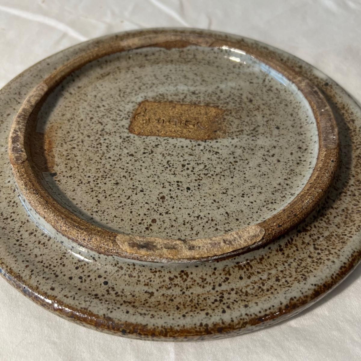 Three signed pieces of pottery in this lot. The speckled trivet/serving dish measures 9.5”D and its signature appears to read Gennicic or something similar. The small brown vessel is signed and stamped Harmony Pottery. The blue and green vessel has a signature and a date that are hard to read; it measures 2.5” D (top) x 4.5”H.