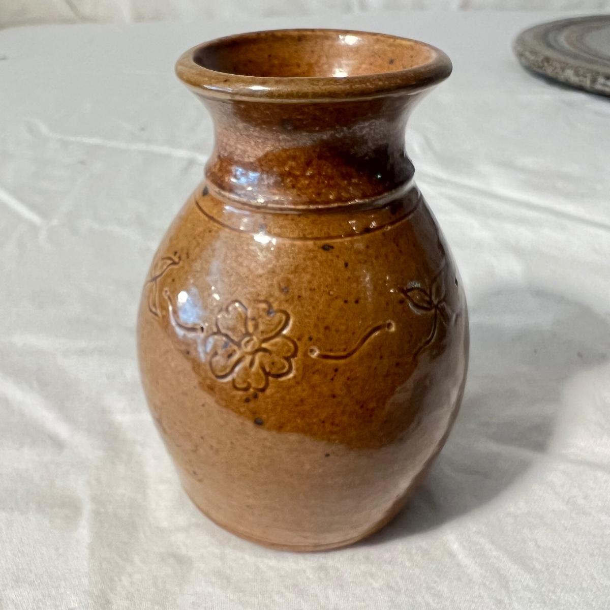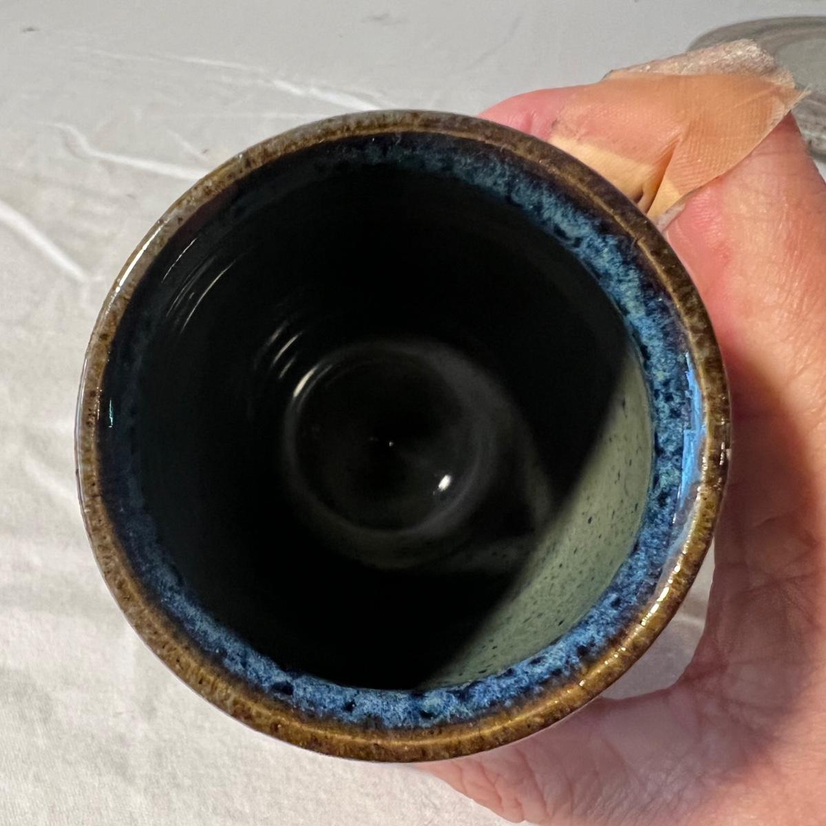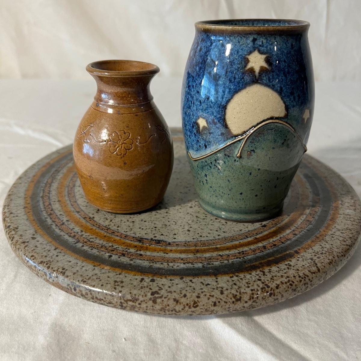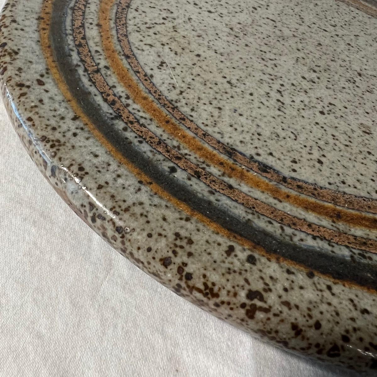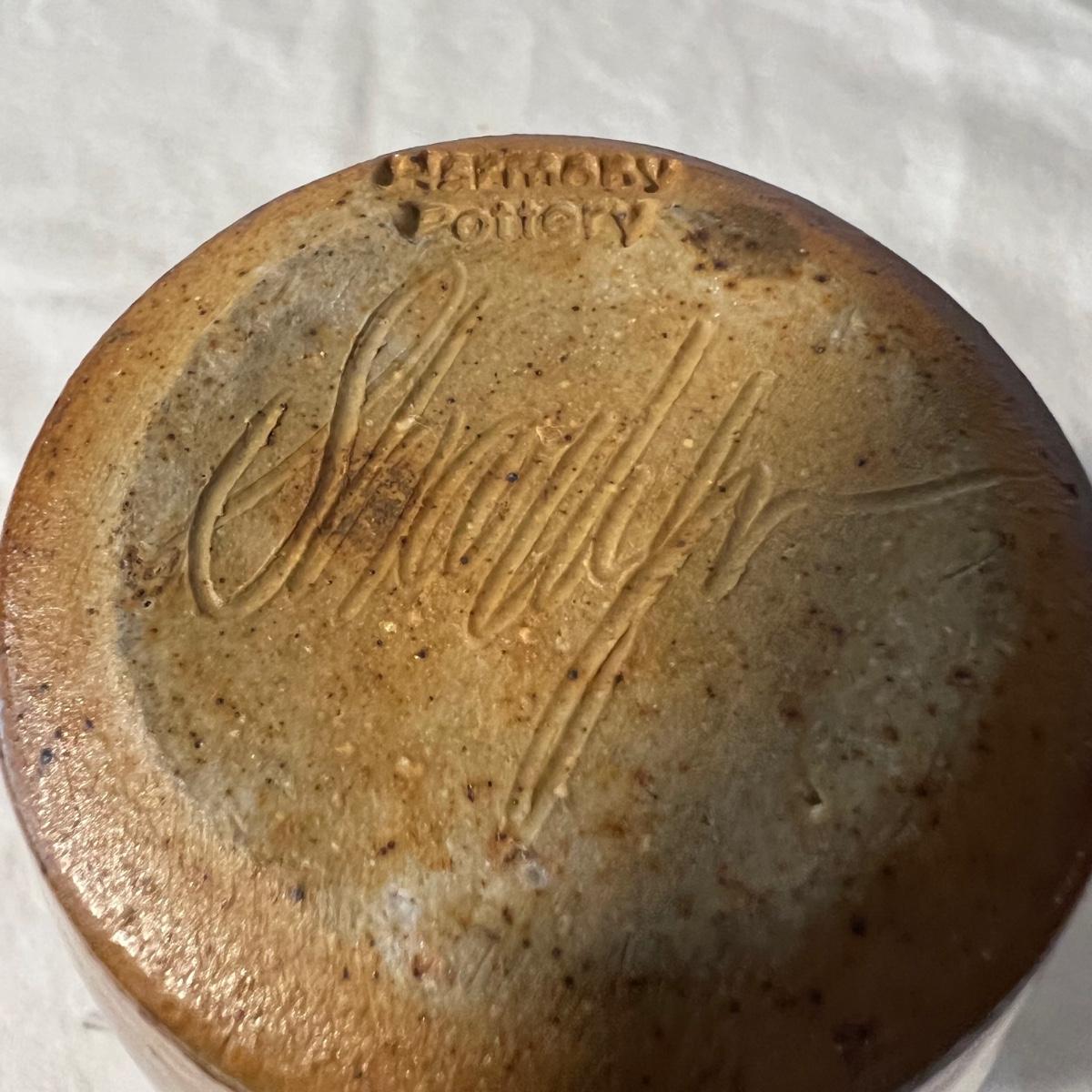 Three signed pieces of pottery in this lot. The speckled trivet/serving dish measures 9.5”D and its signature appears to read Gennicic or something similar. The small brown vessel is signed and stamped Harmony Pottery. The blue and green vessel has a signature and a date that are hard to read; it measures 2.5” D (top) x 4.5”H.