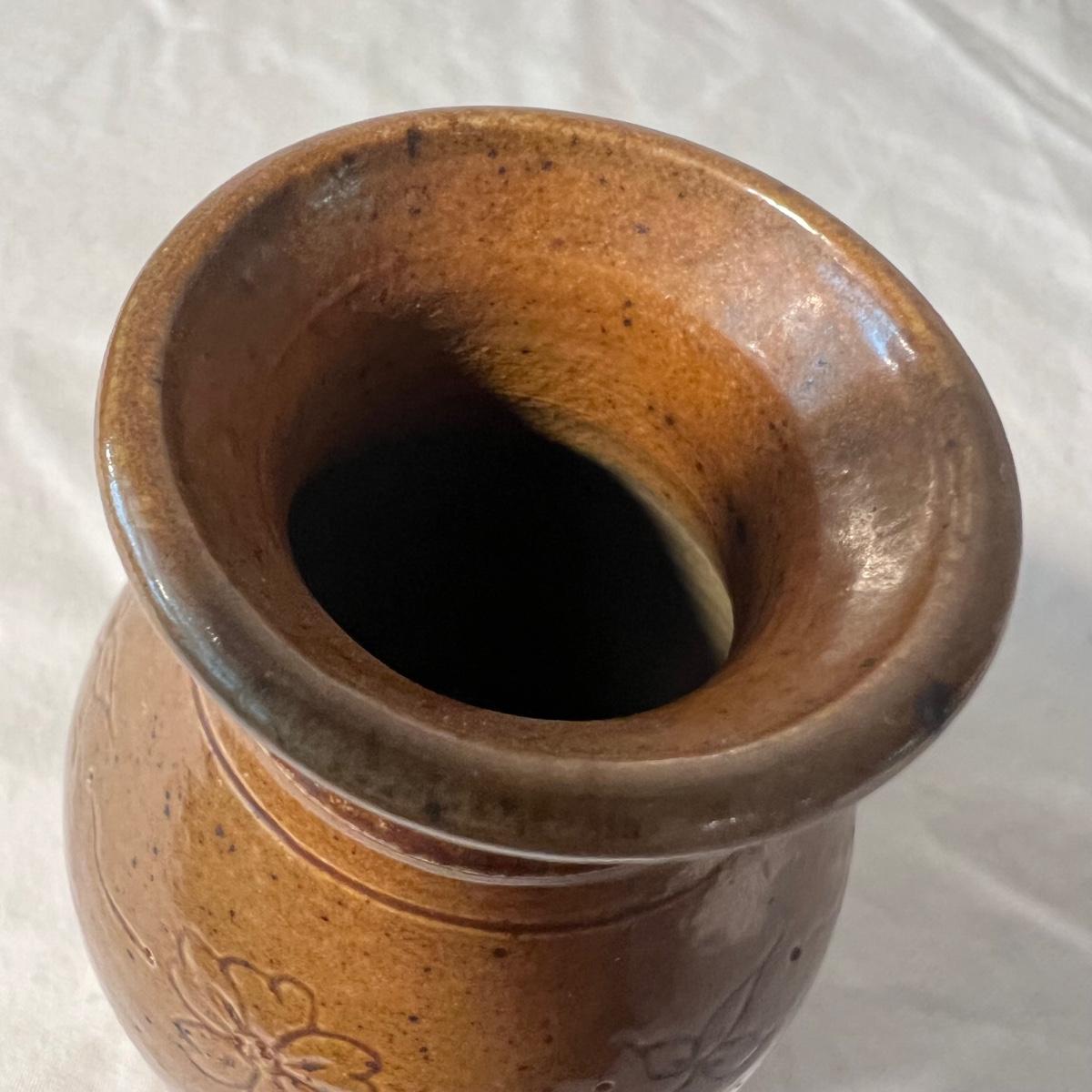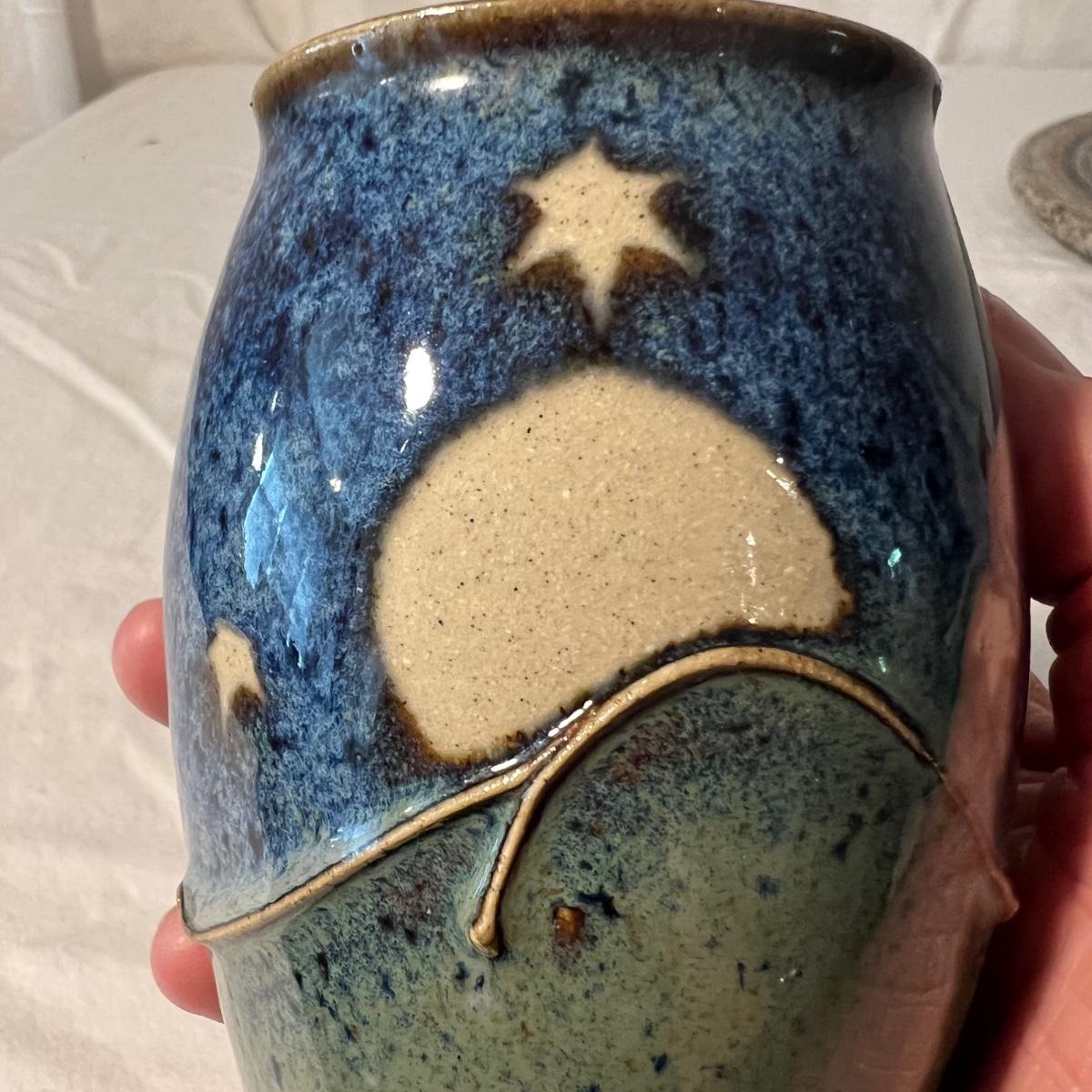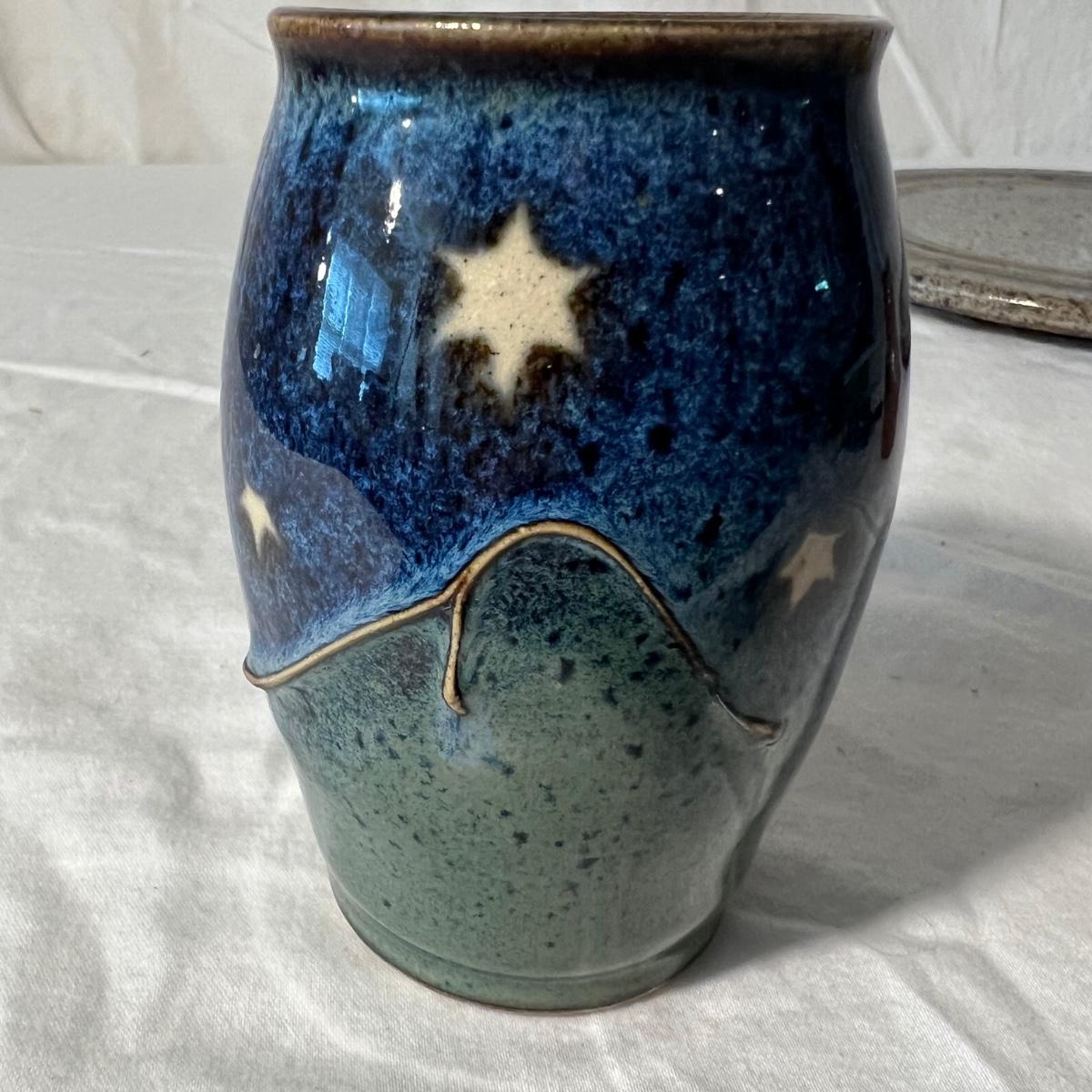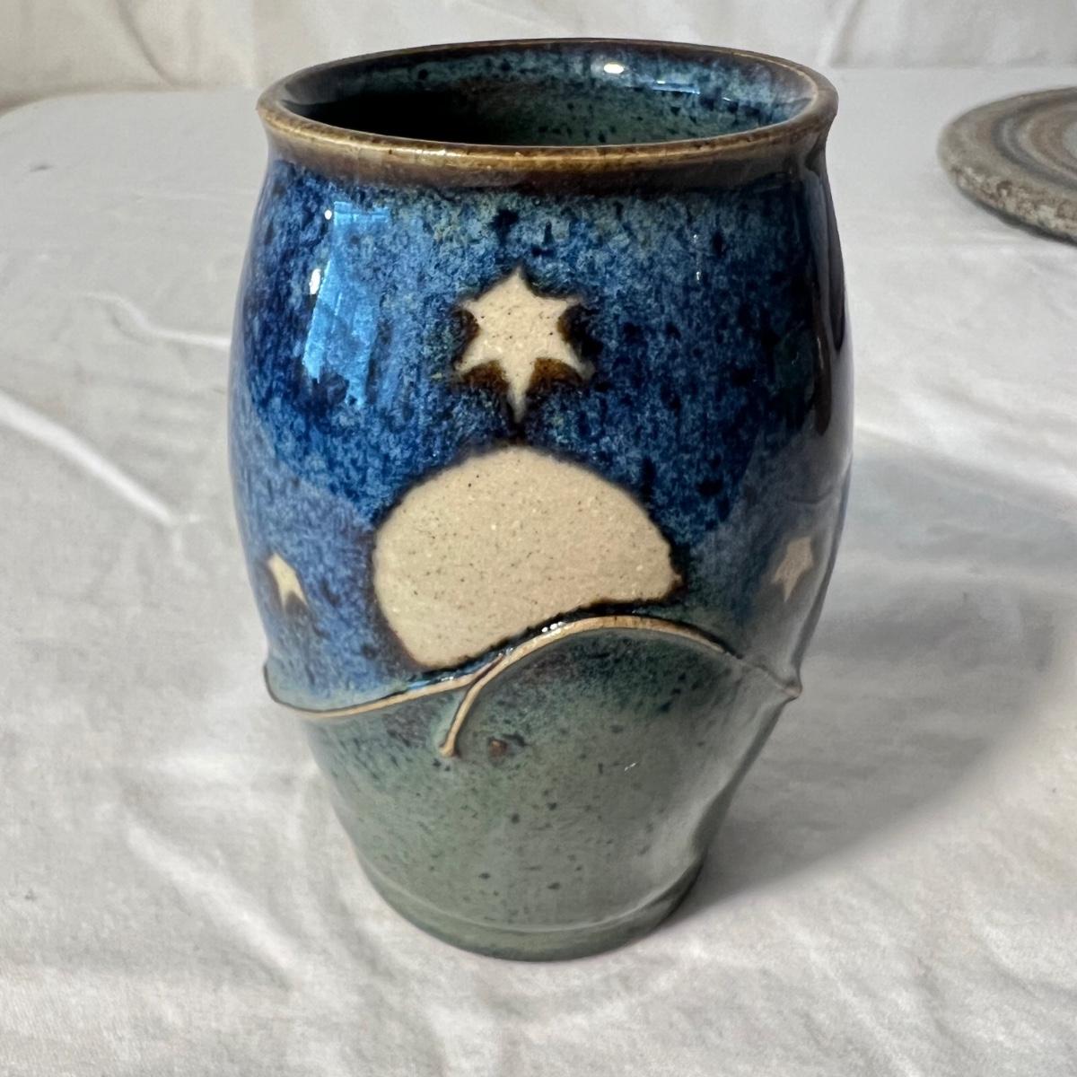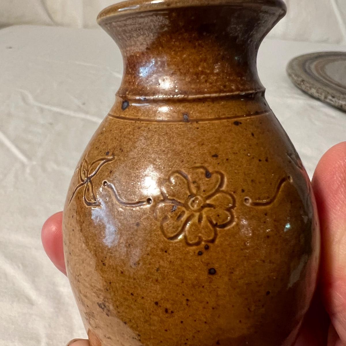 Three signed pieces of pottery in this lot. The speckled trivet/serving dish measures 9.5”D and its signature appears to read Gennicic or something similar. The small brown vessel is signed and stamped Harmony Pottery. The blue and green vessel has a signature and a date that are hard to read; it measures 2.5” D (top) x 4.5”H.