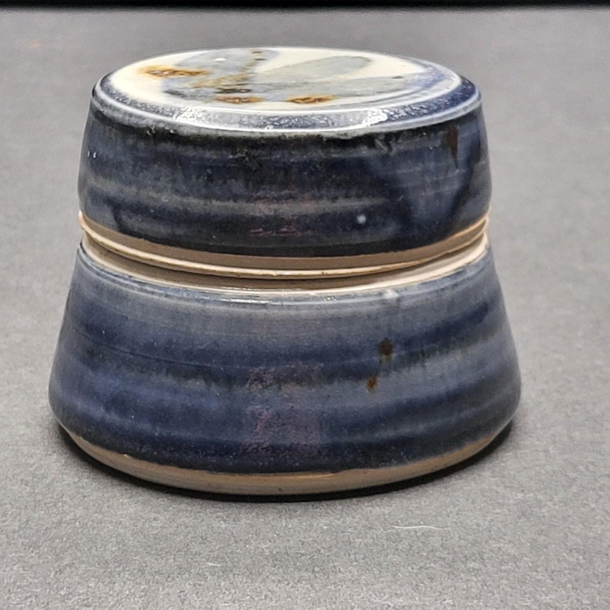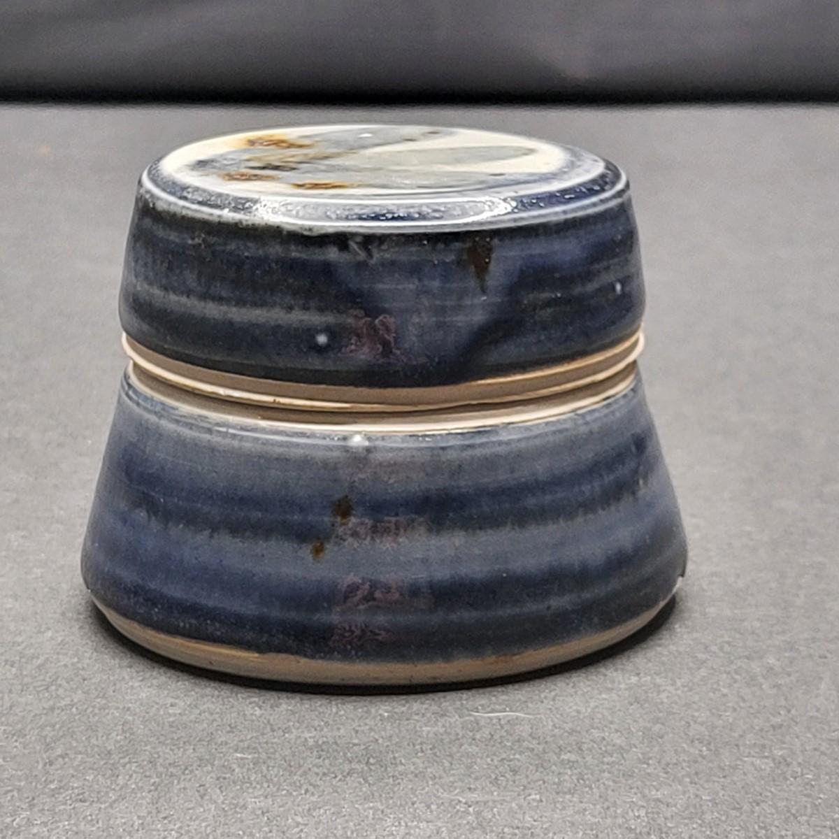 2.5" x 3" pottery jar with lid, artist signed, Nancy.