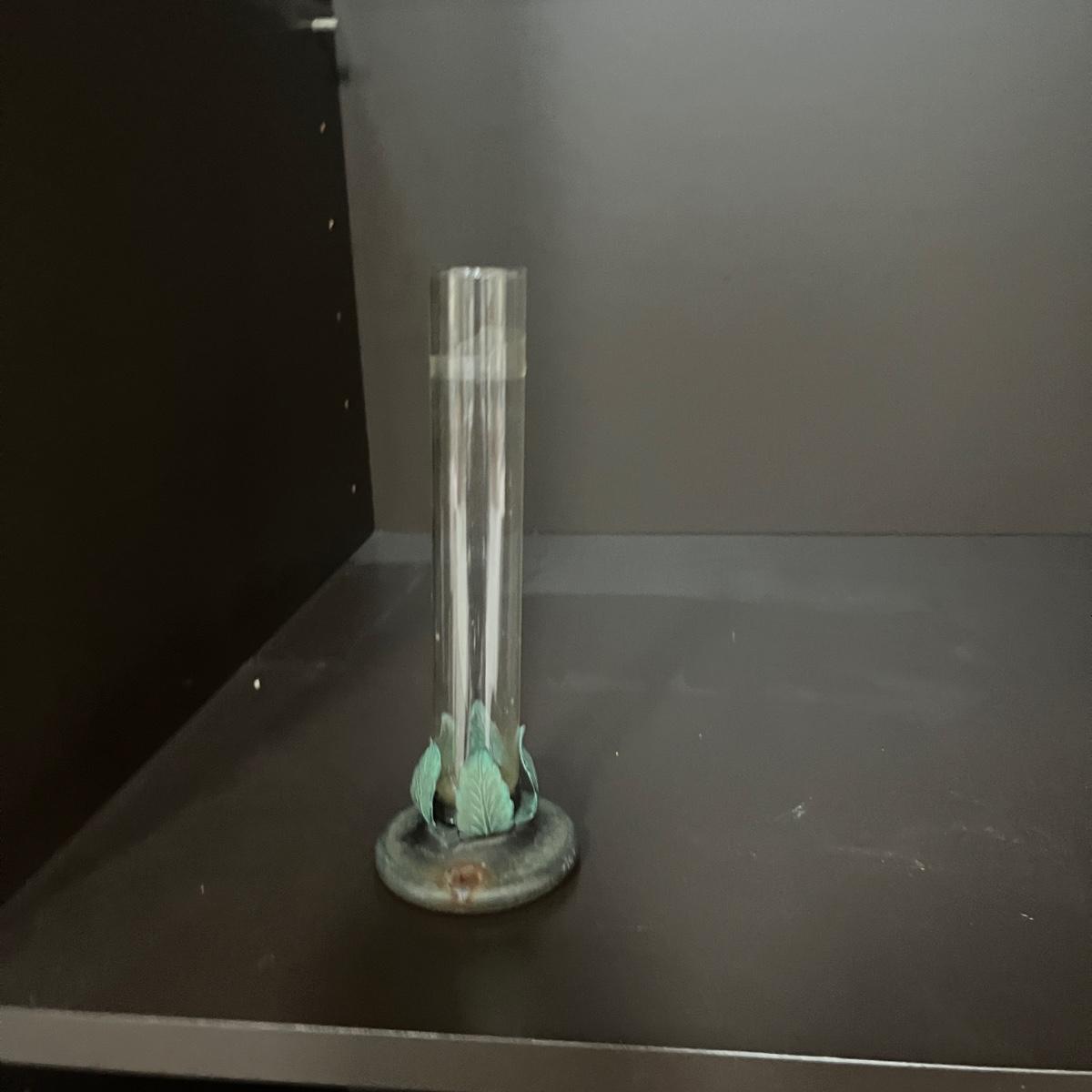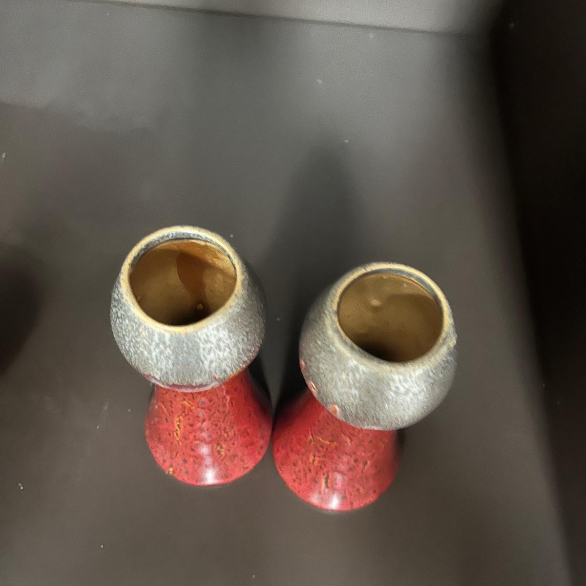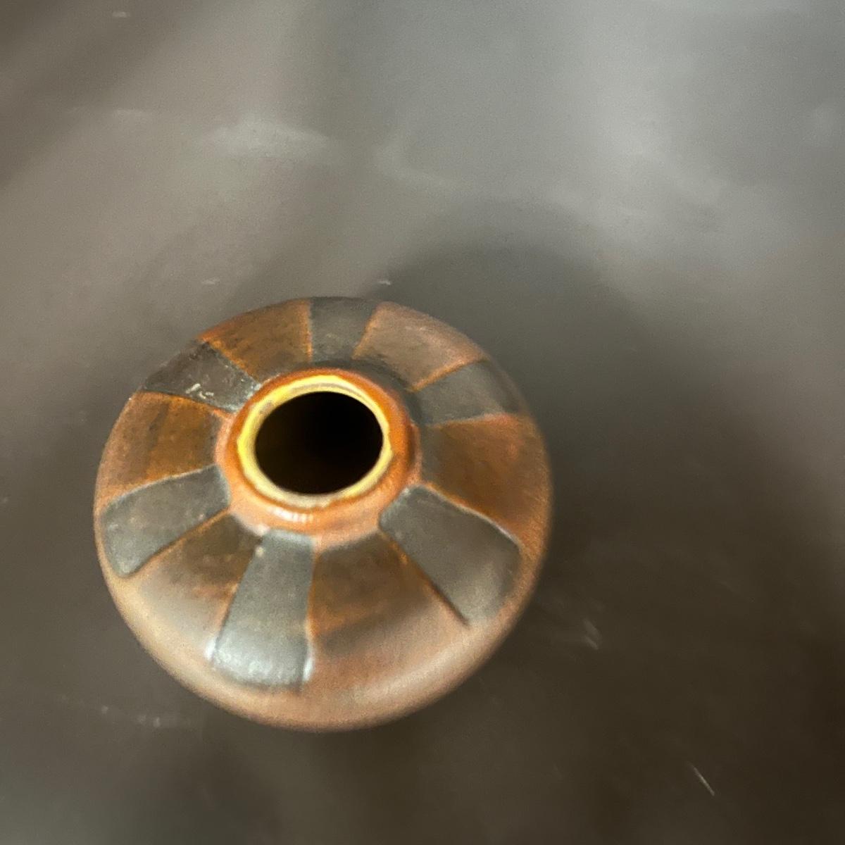 Lot includes four pieces of signed pottery, pair of ceramic vases, and a brass based vase with glass tube by Conant Custom Brass. Largest signed vase measures 6”D x 8.5”H.