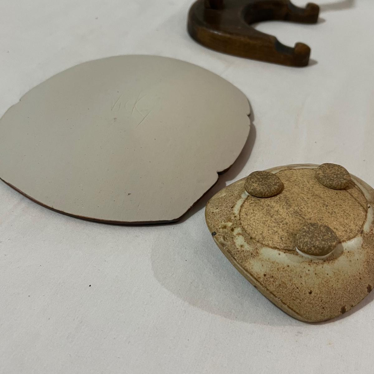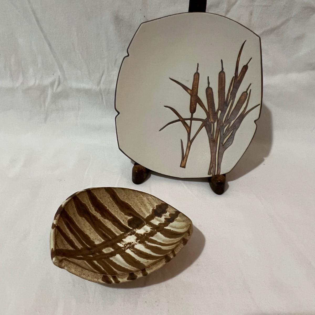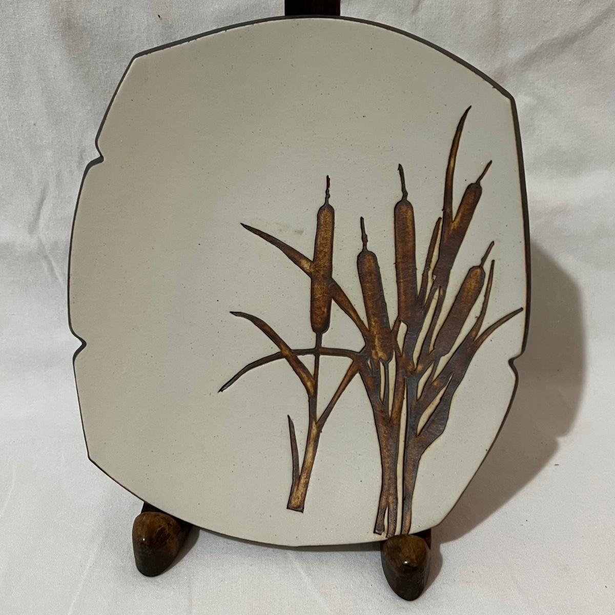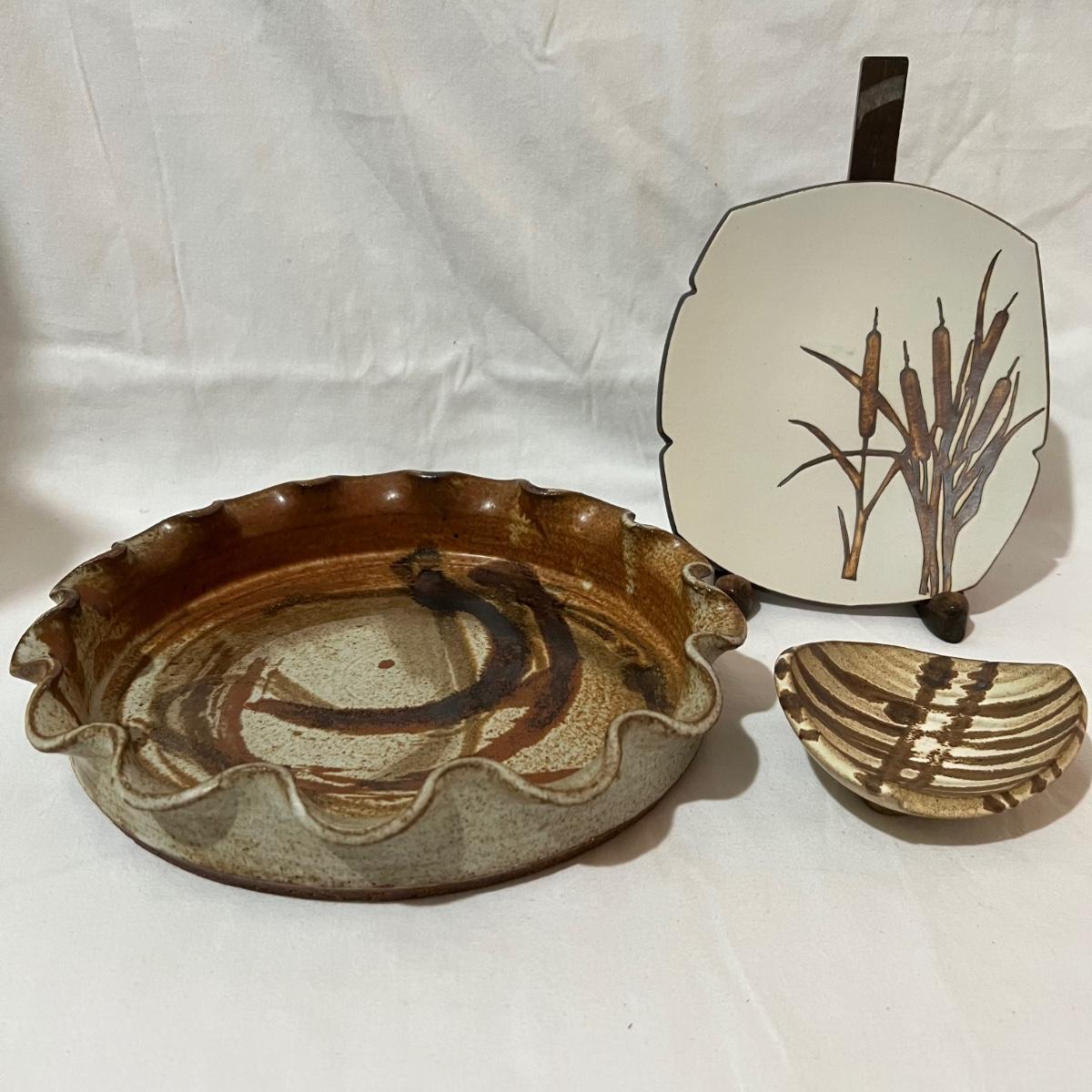 Two of these three pottery pieces are signed; the pie plate appears to have a signature that reads Wallman, it measures 10” D x 2” H. The smaller bulrush plate is signed Vicky.