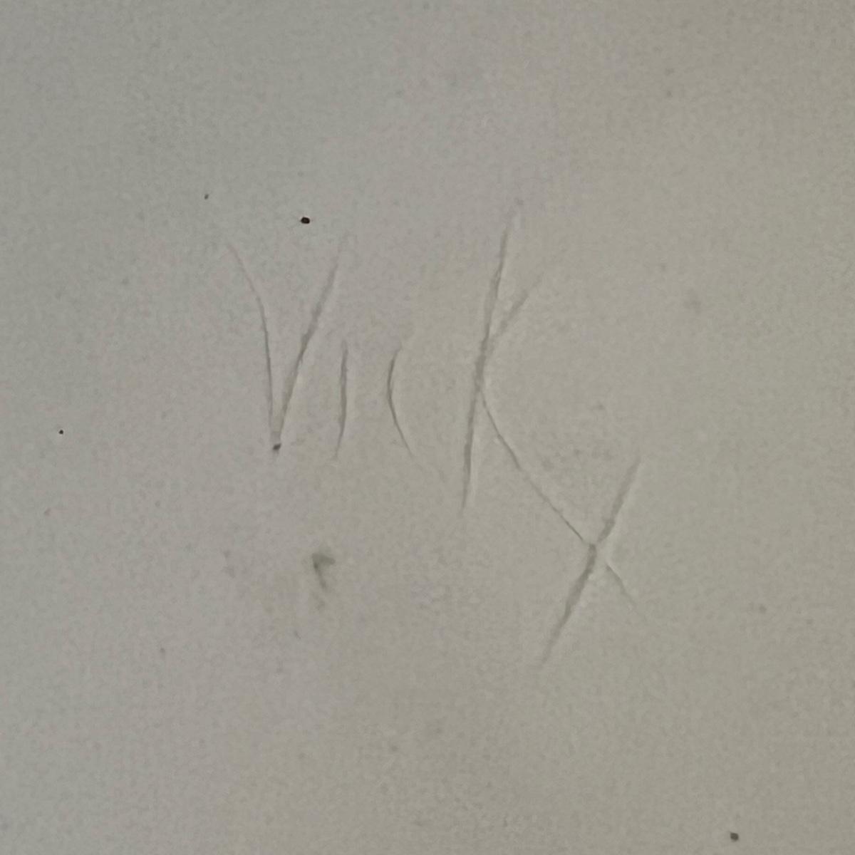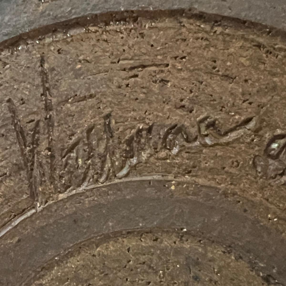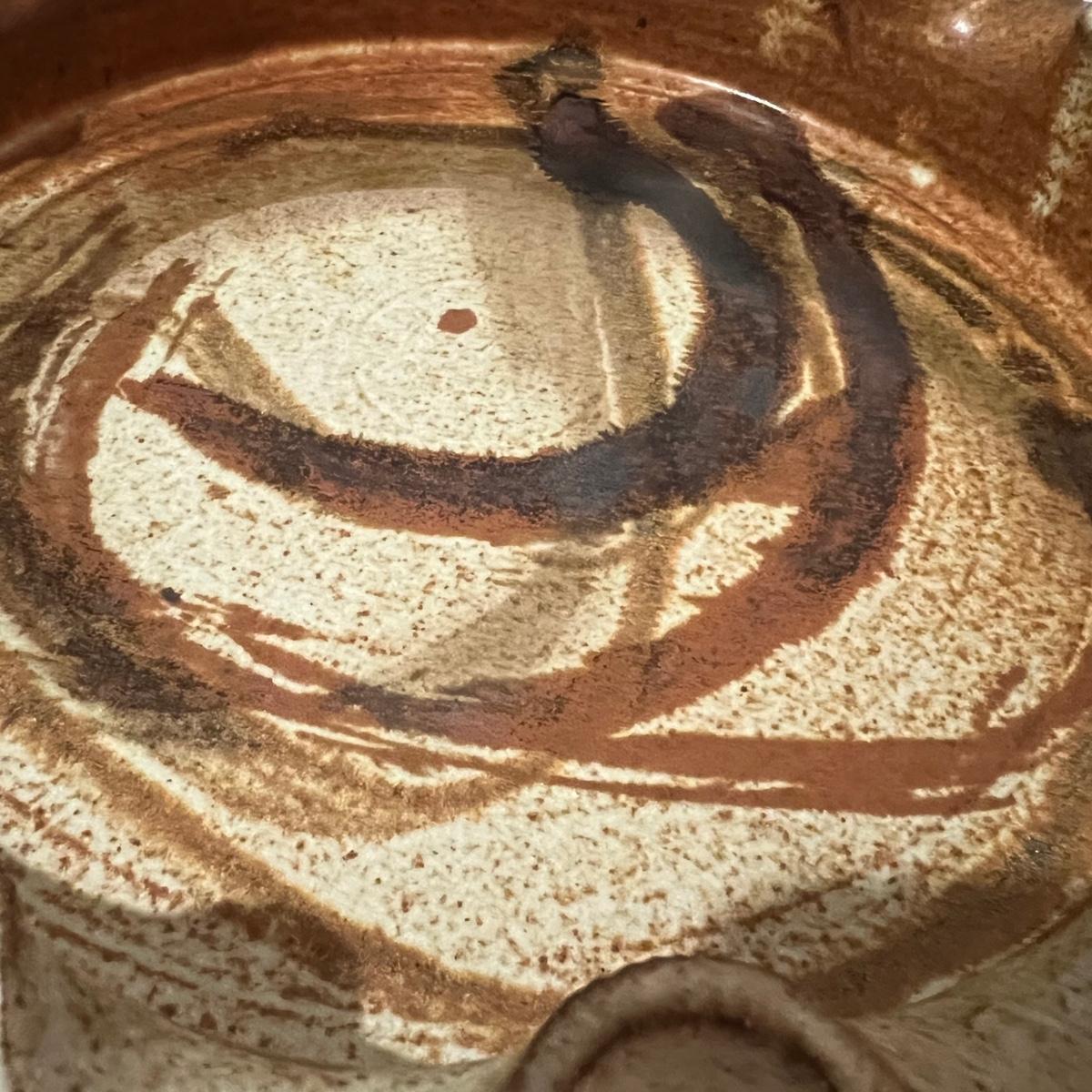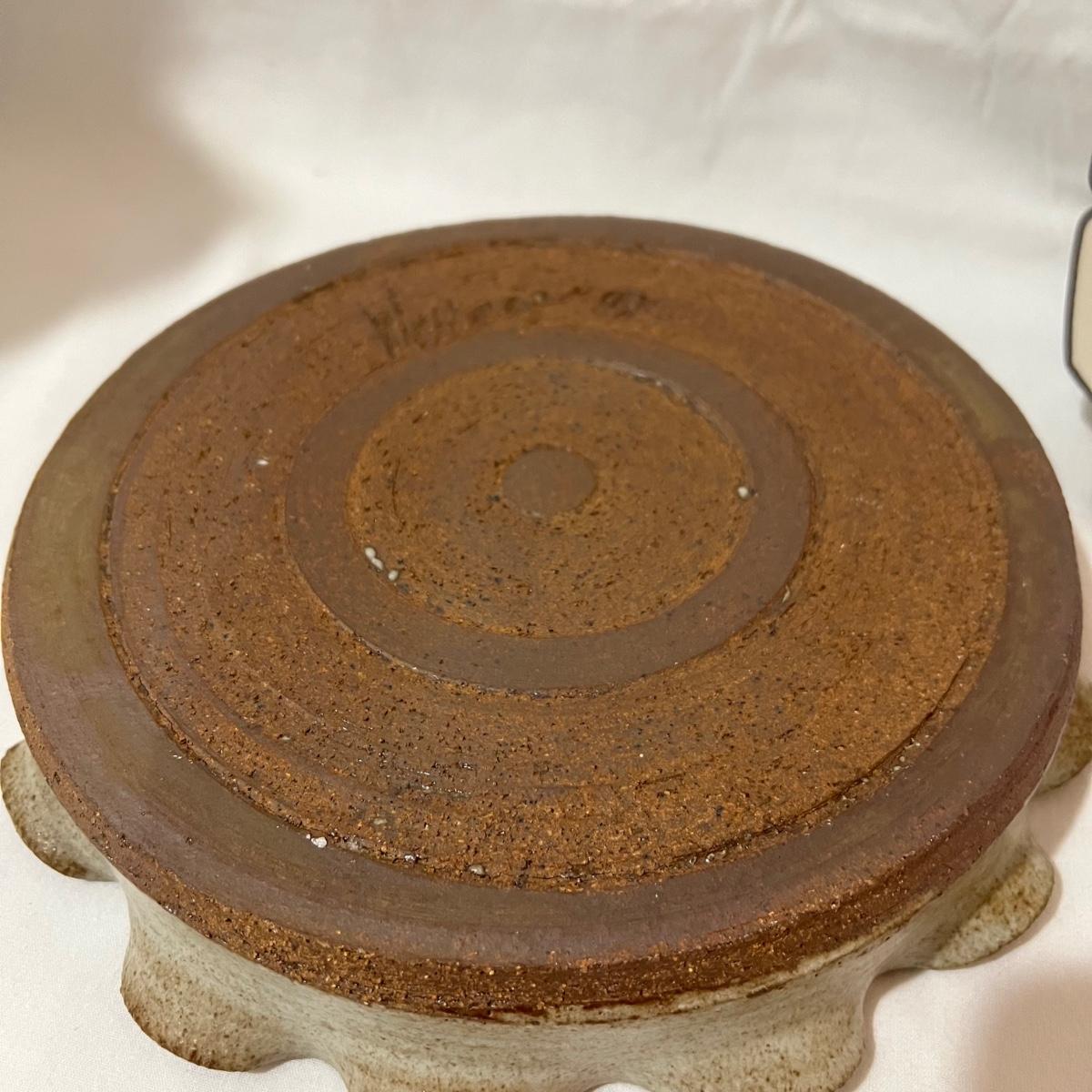 Two of these three pottery pieces are signed; the pie plate appears to have a signature that reads Wallman, it measures 10” D x 2” H. The smaller bulrush plate is signed Vicky.