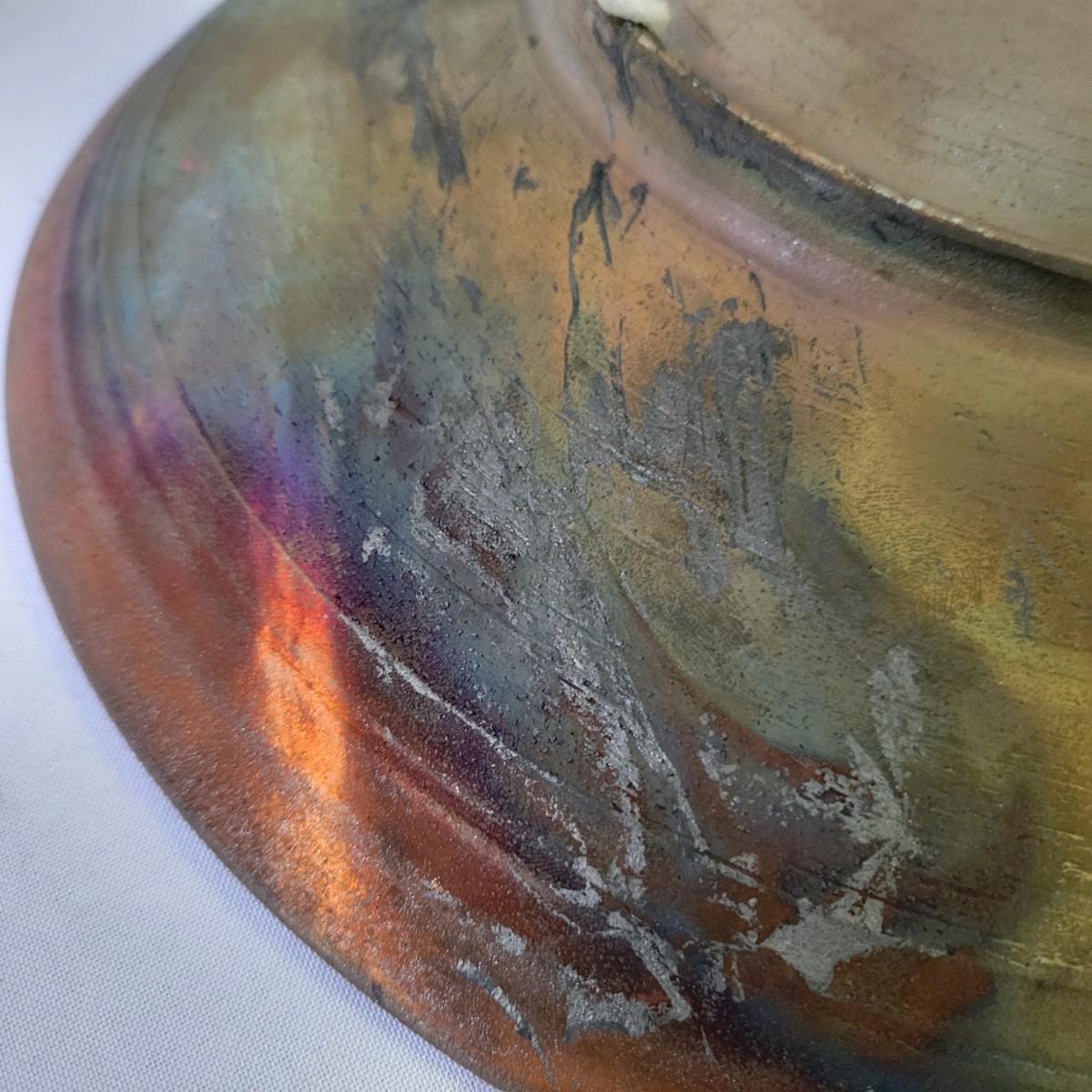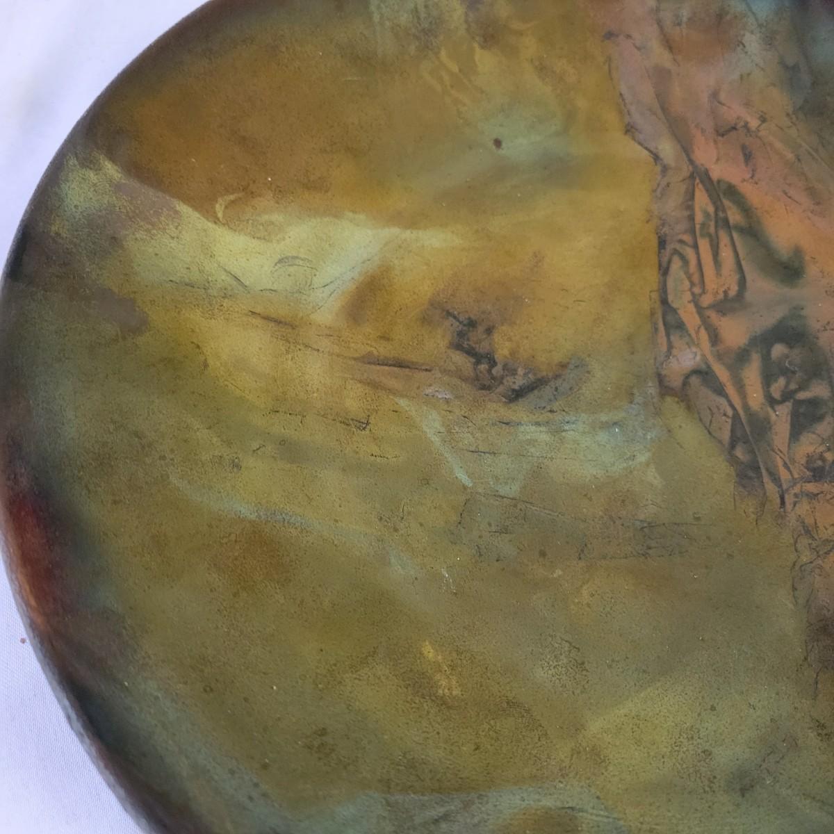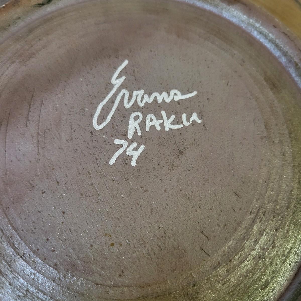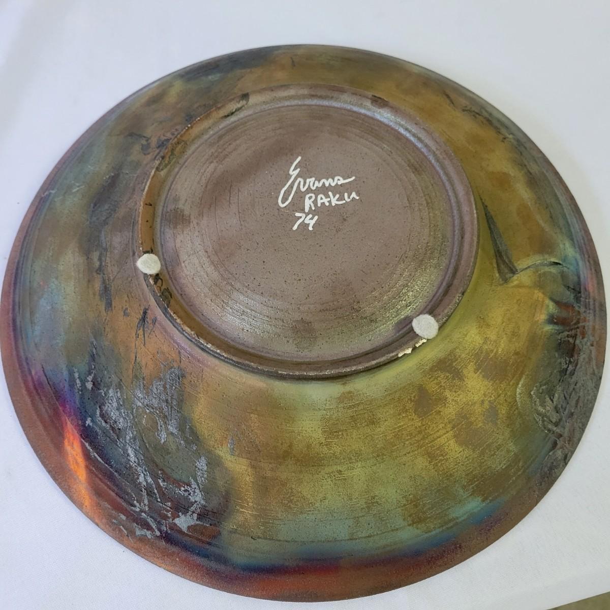 A signed pottery plate with a raku glaze. This piece is signed "Evans Raku 74". It measures approximately 12.5"D x 2"H. The included stand is made of metal that appears to be brass. Shipping available.