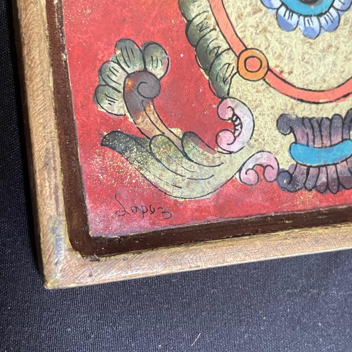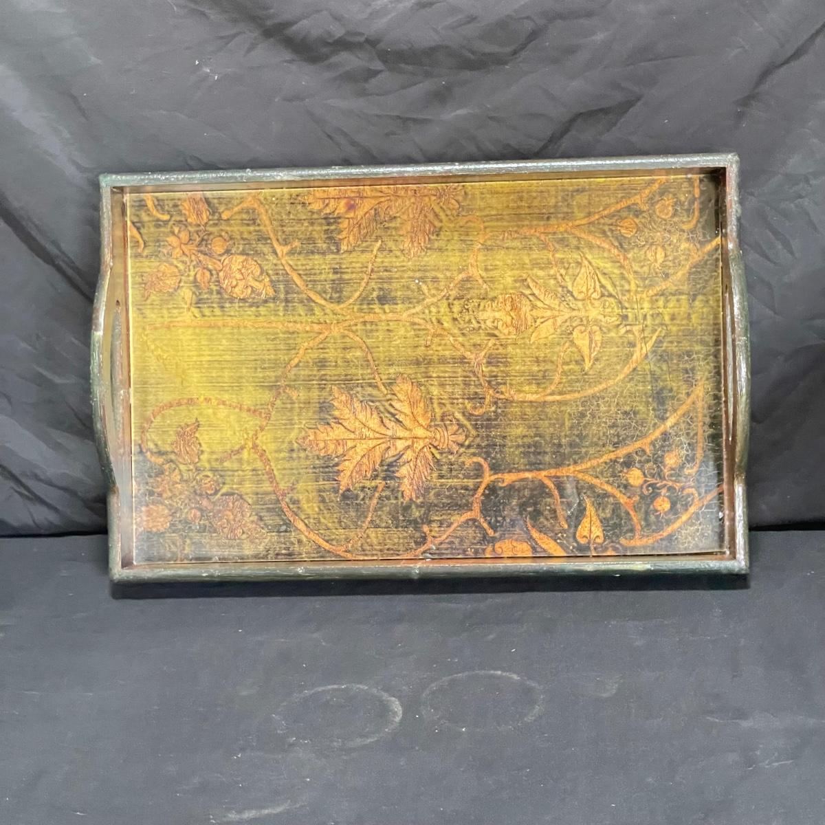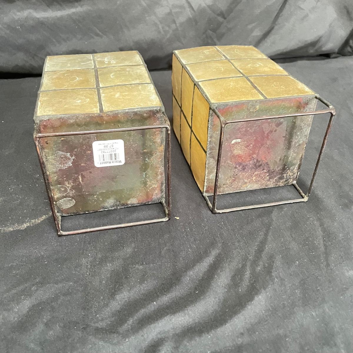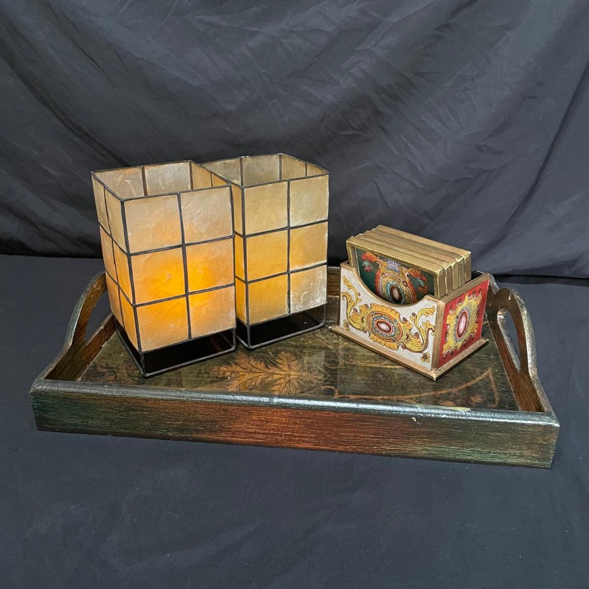Bohemian decor includes a wooden tray with glass liner, two flameless candles with capiz shell-like leaded candle holders and a set of five glass and wood coasters. The majority of the coaster set is signed Lopez and appears to be reverse hand painted glass in a wood coaster frame. The complementing box also appears to be reverse painted glass and wood, we did not find a signature on the box. Coasters show a little wear on the corners of the wood. Coasters are each 4.25”SQ, the tray is 17” x 11” x 3.5” and the candle shades are 7” tall. There appears to be candle wax on the tray. See images. Shipping available.