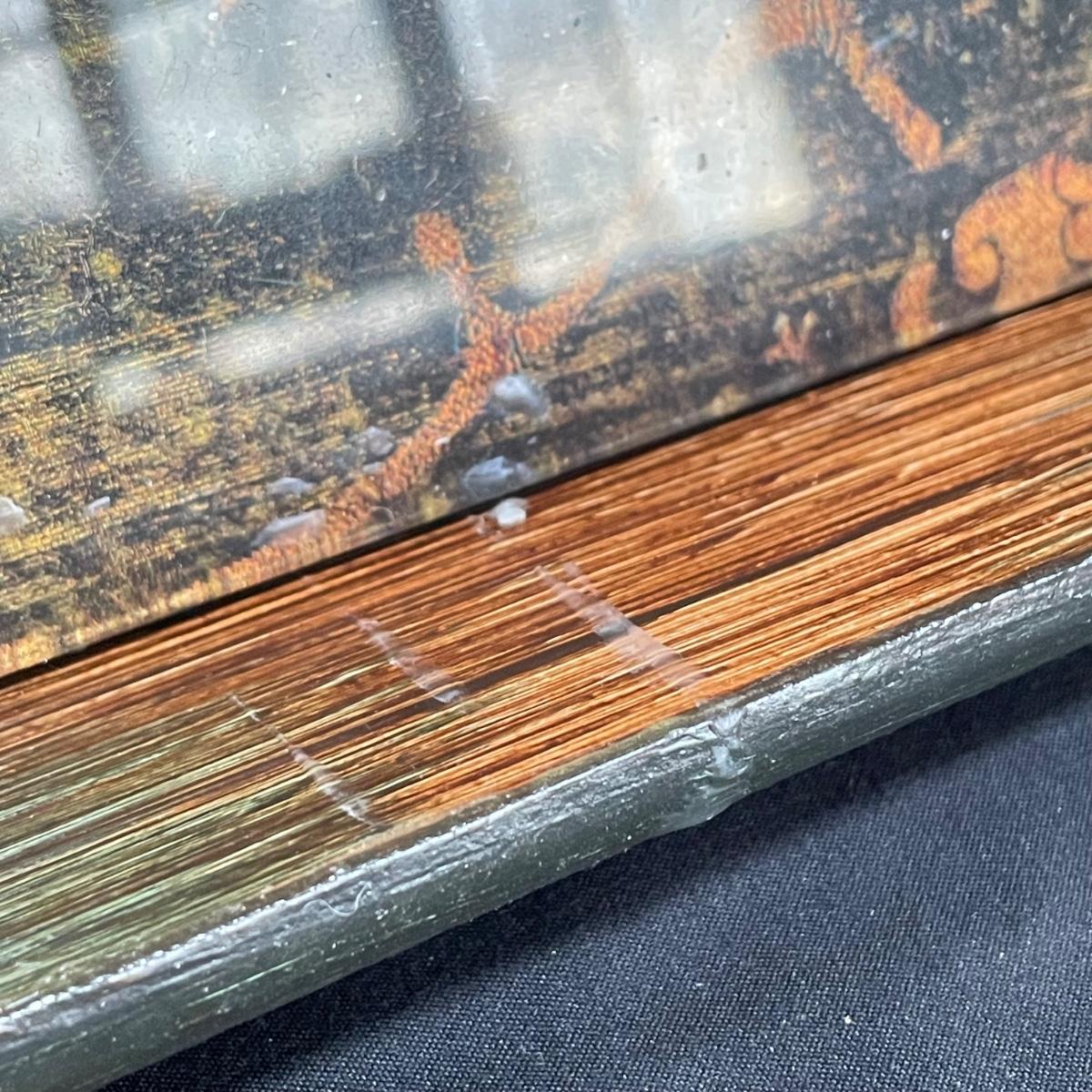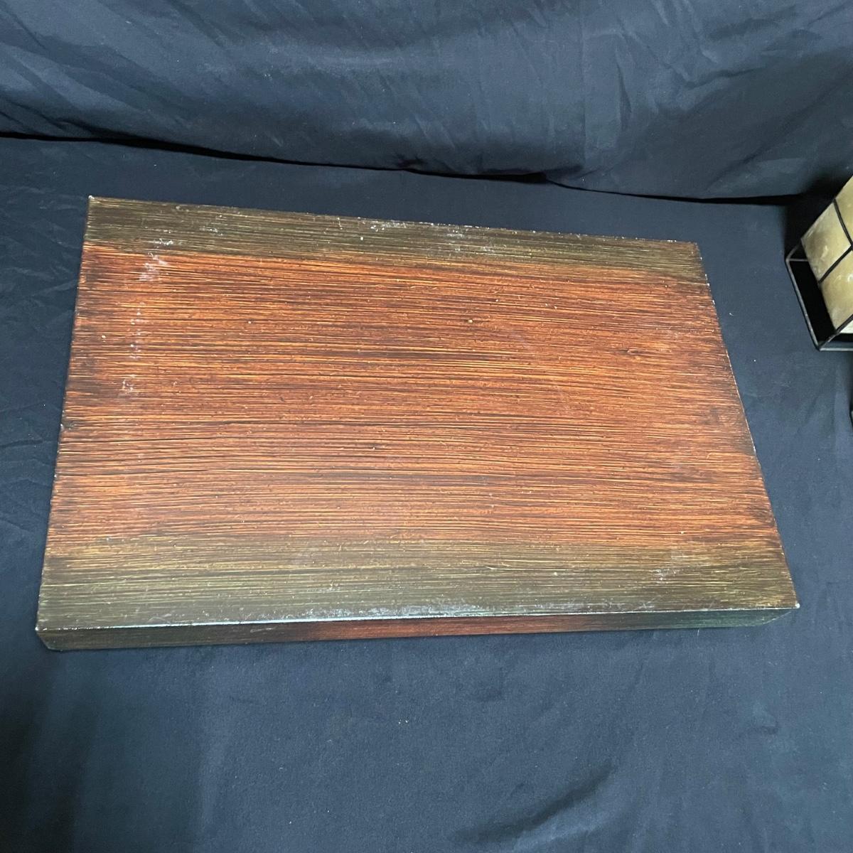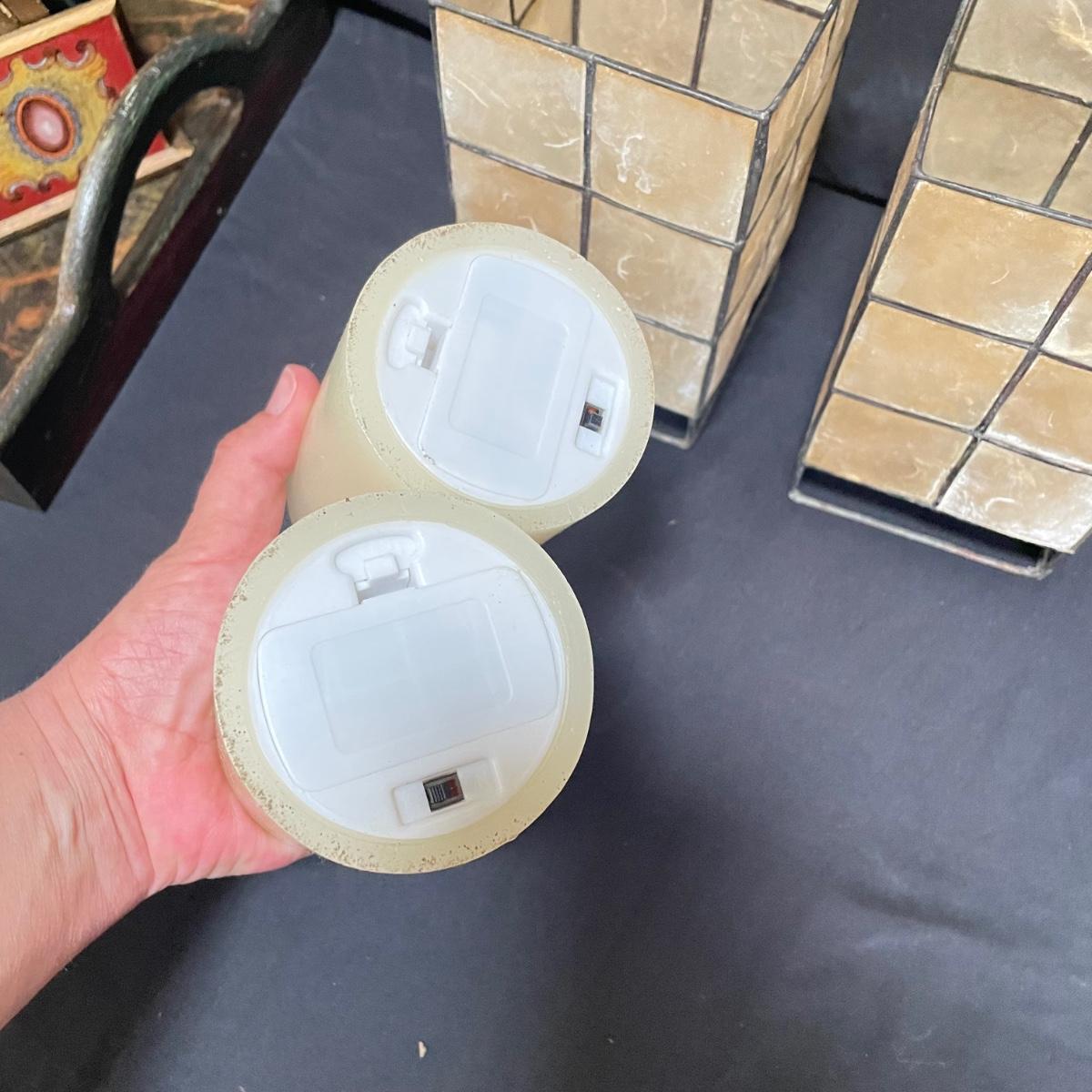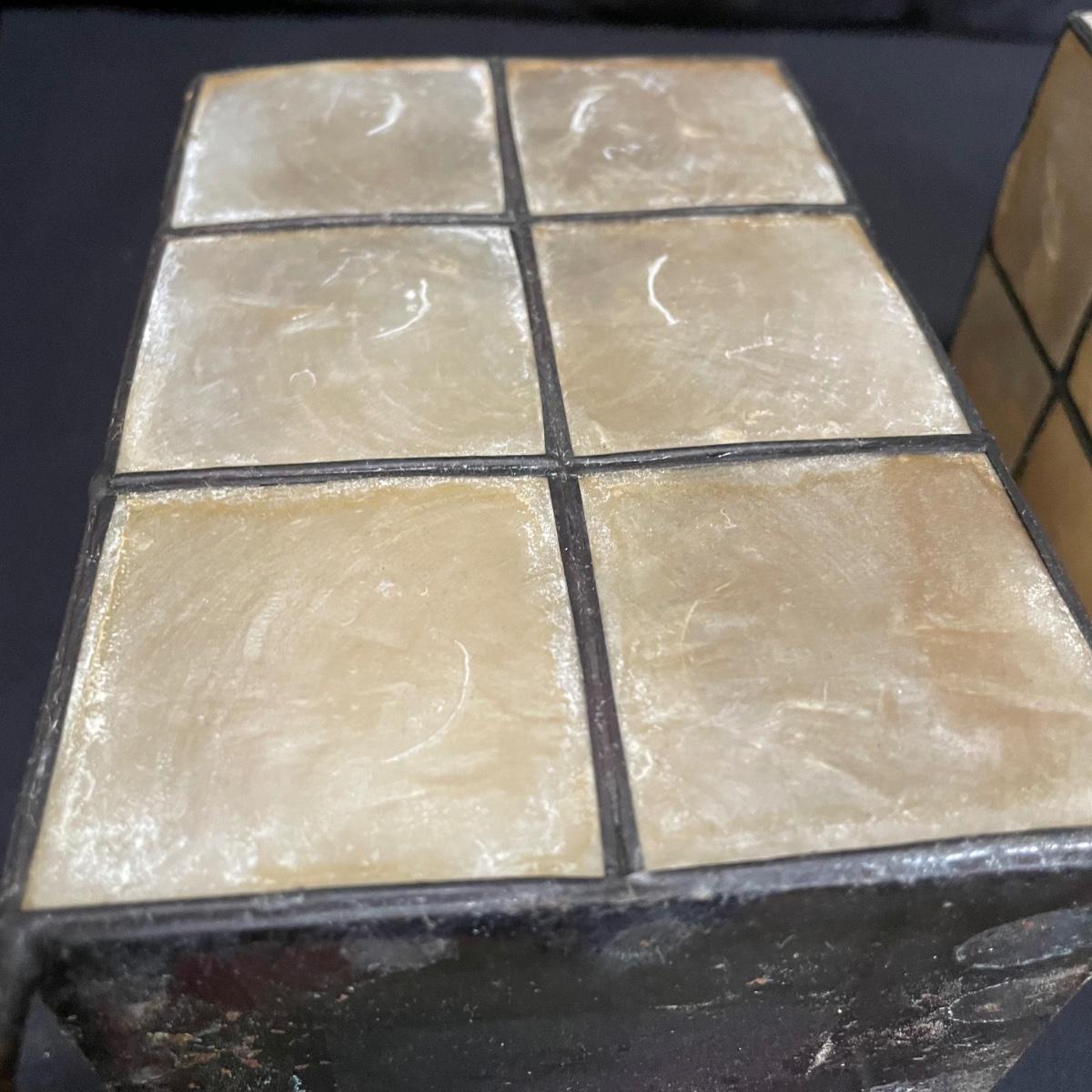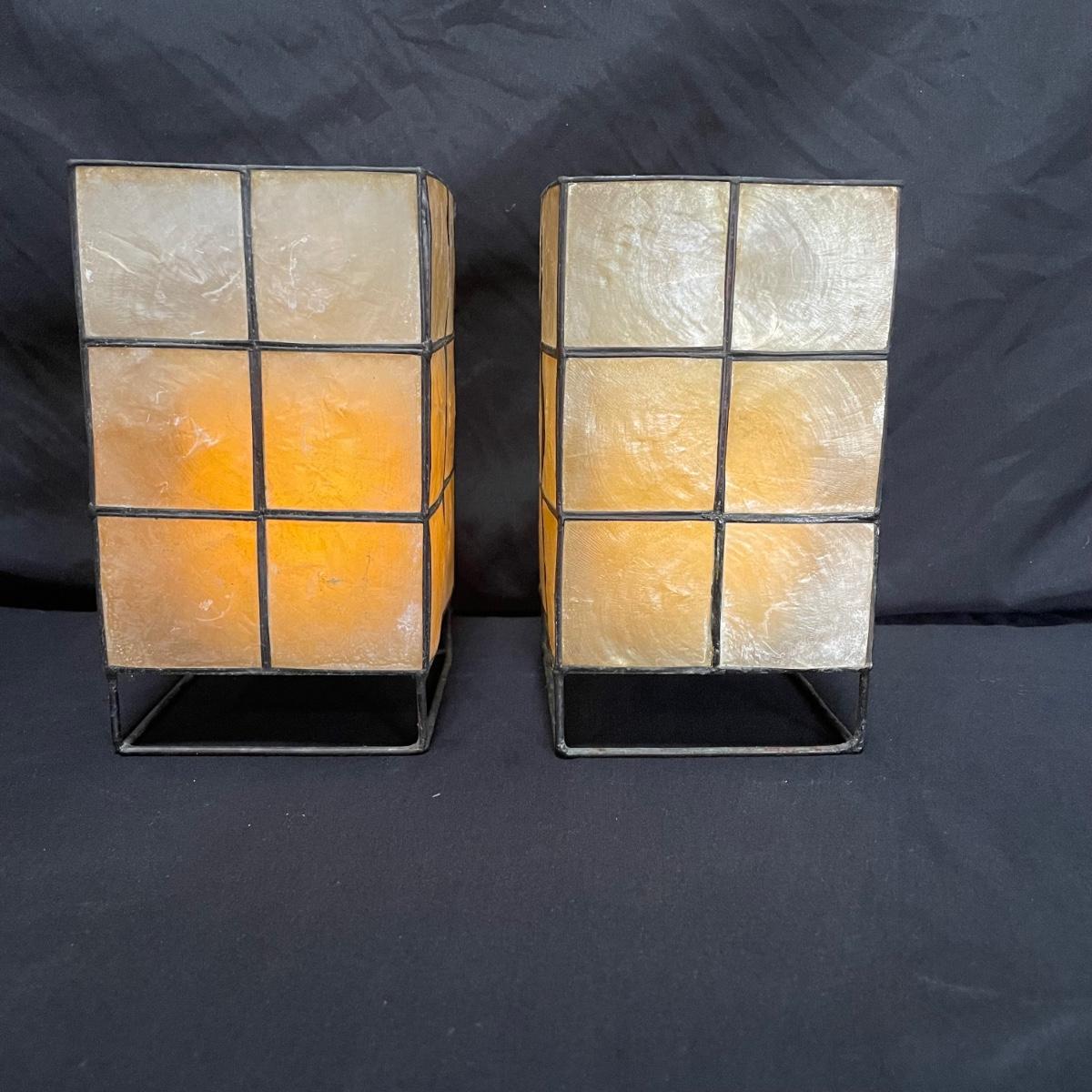 Bohemian decor includes a wooden tray with glass liner, two flameless candles with capiz shell-like leaded candle holders and a set of five glass and wood coasters. The majority of the coaster set is signed Lopez and appears to be reverse hand painted glass in a wood coaster frame. The complementing box also appears to be reverse painted glass and wood, we did not find a signature on the box. Coasters show a little wear on the corners of the wood. Coasters are each 4.25”SQ, the tray is 17” x 11” x 3.5” and the candle shades are 7” tall. There appears to be candle wax on the tray. See images. Shipping available.