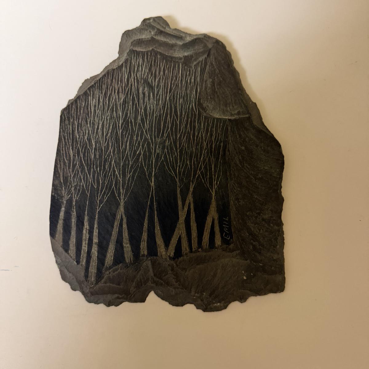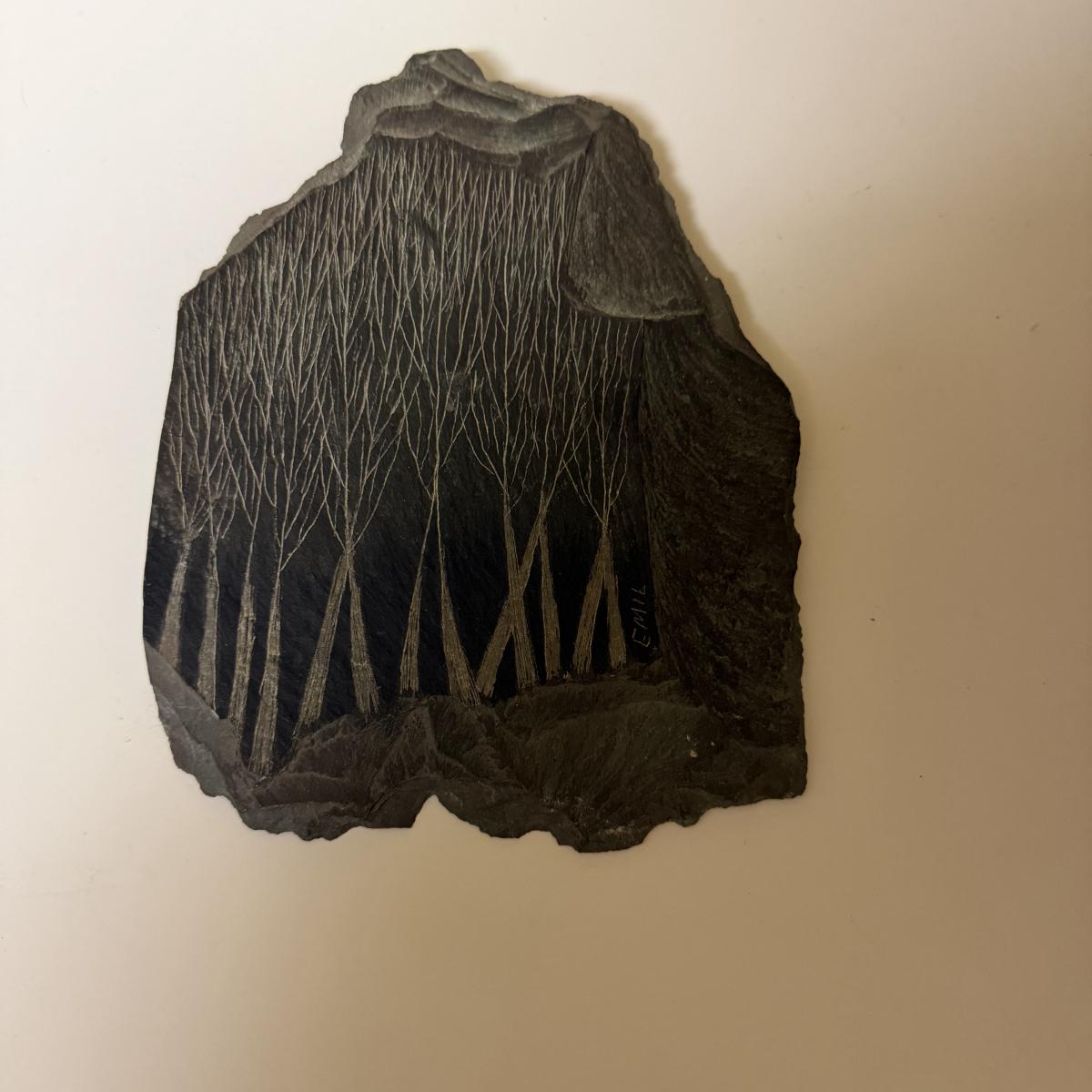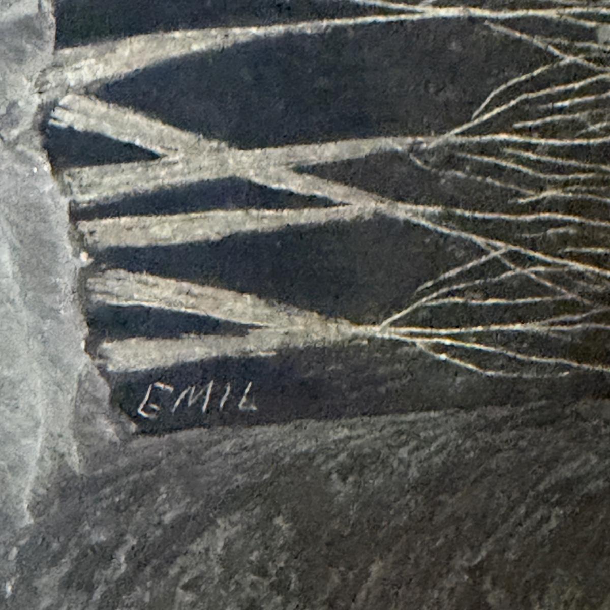 Lot includes a slate etching signed by Emil that measures 6” x 8”H