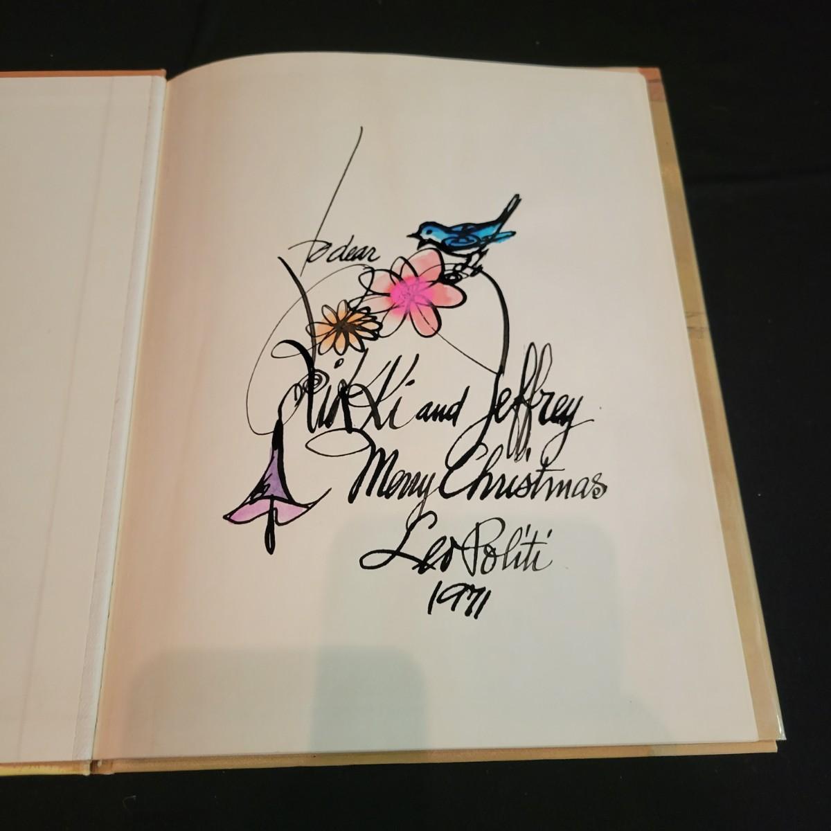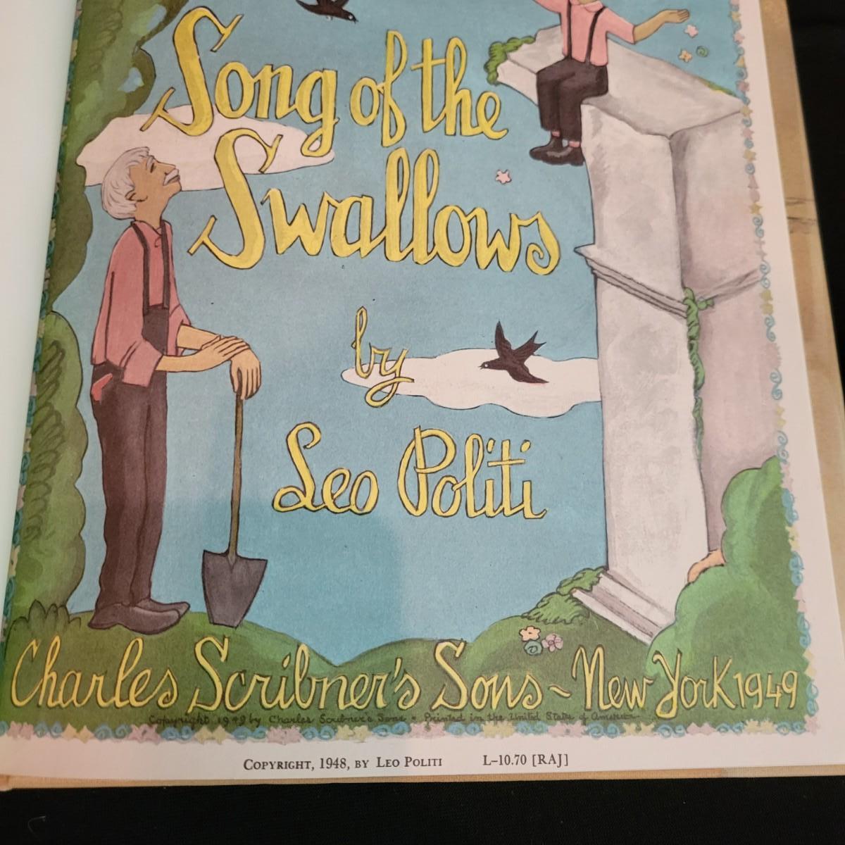 An artistically signed copy of "Song of the Swallows" by artist and illustrator Leo Politi. There is also a piece of art and multiple books in this auction by the same artist. Shipping available
