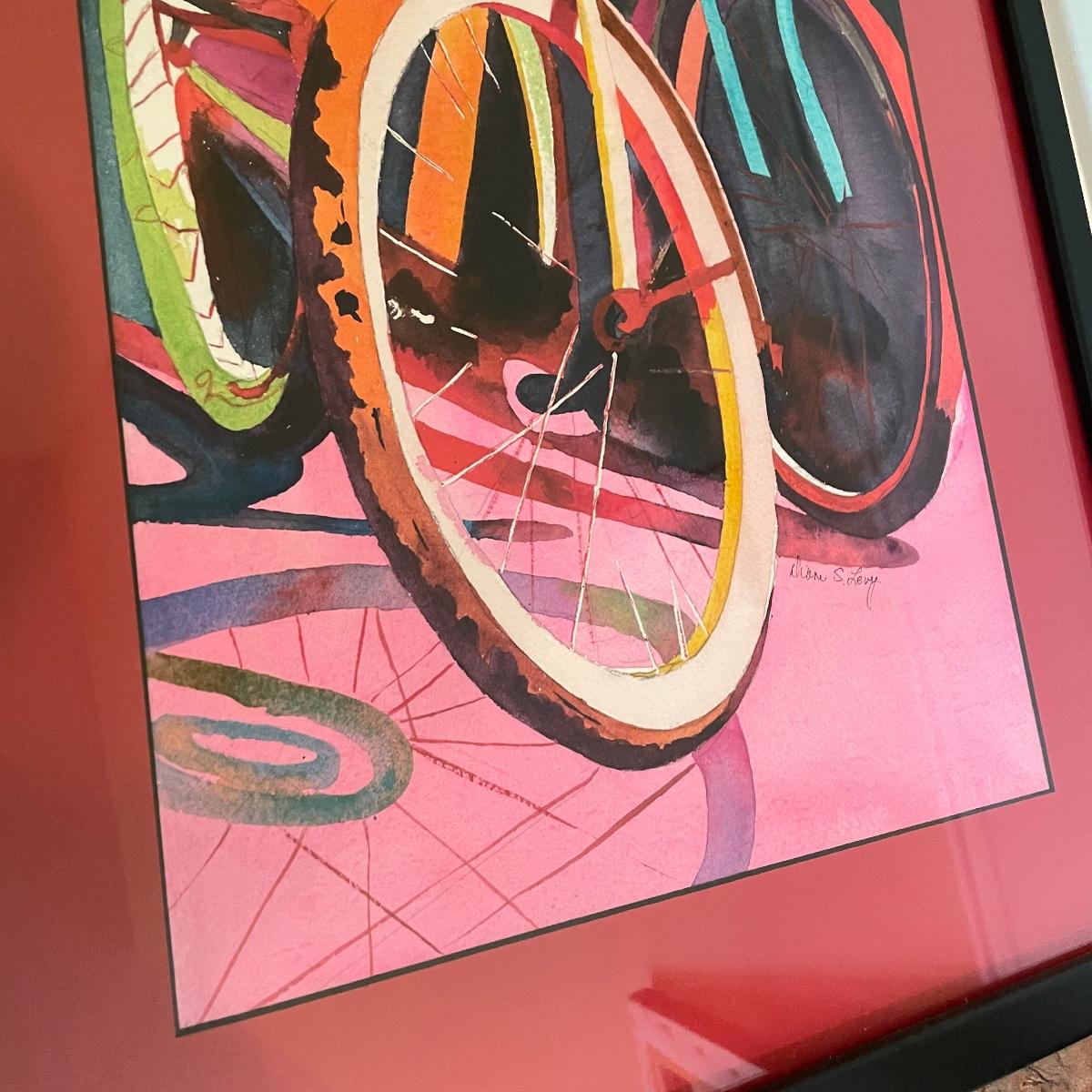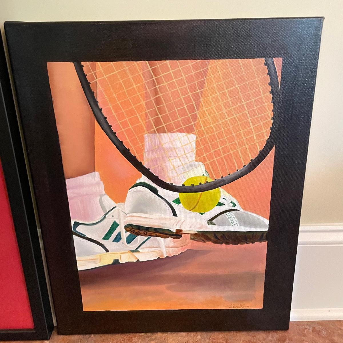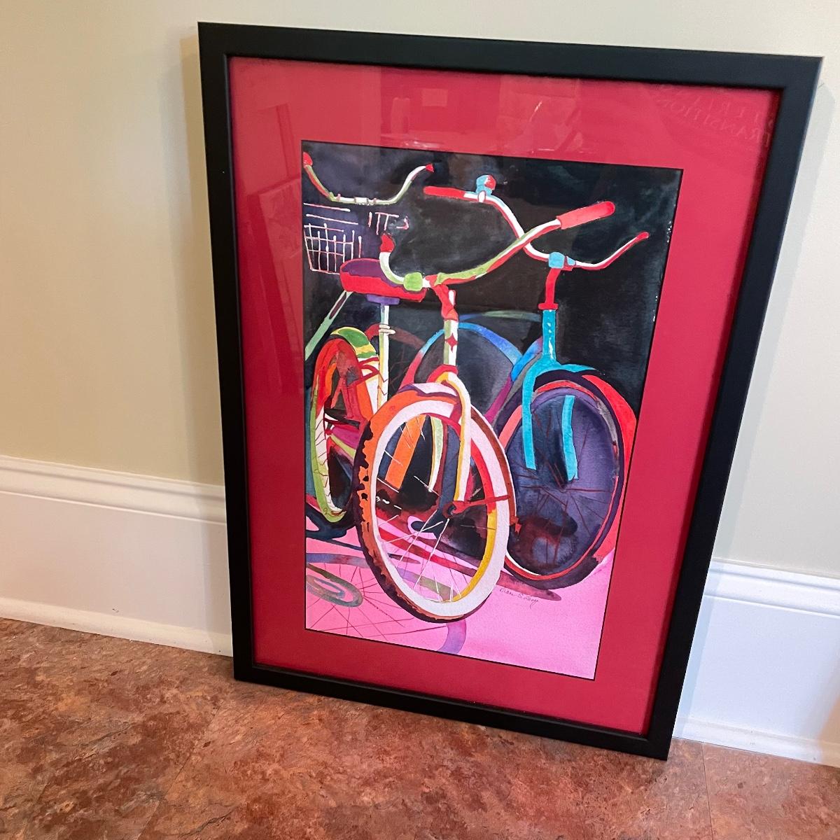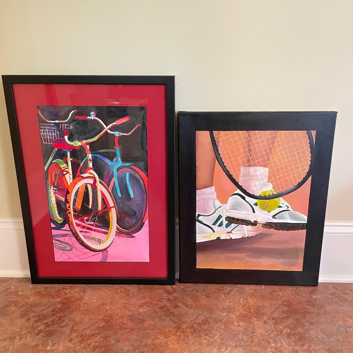 Two inspiring signed originals. The tennis art appears to be acrylic on a 16” x 20” canvas with a painted border. Next appears to be a professionally framed bicycle water color. Art sits behind glass in a 16.75” x 23.5” black painted wooden frame. See images. Shipping available. Please call UPS with dimensions at 828-252-6930 for a shipping quote prior to bidding.