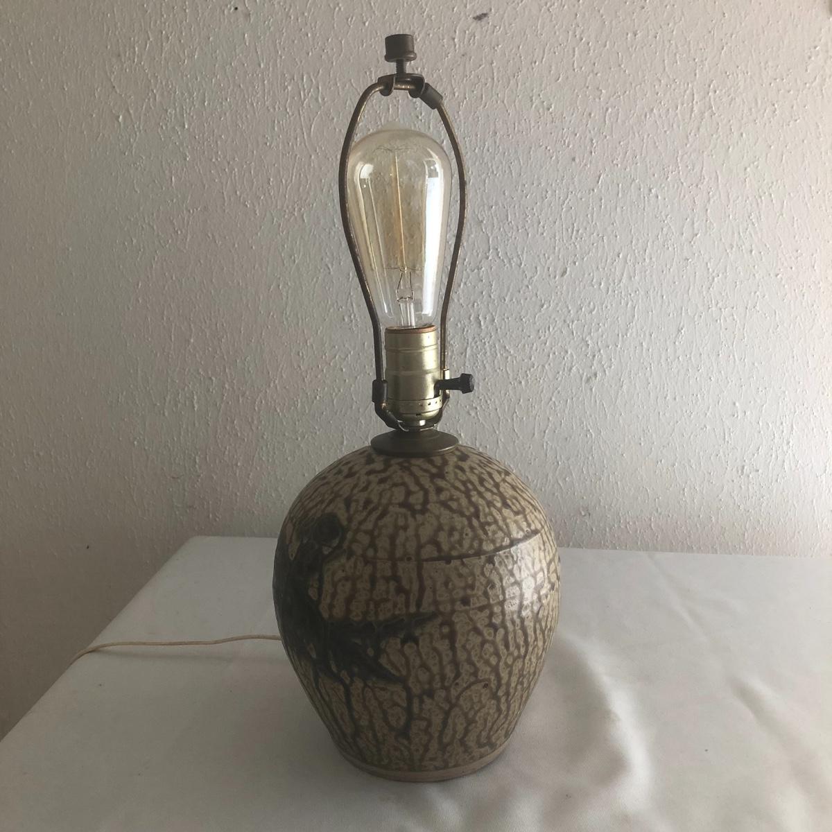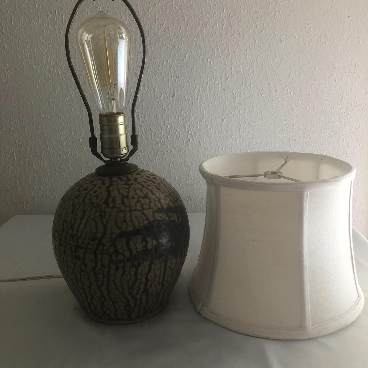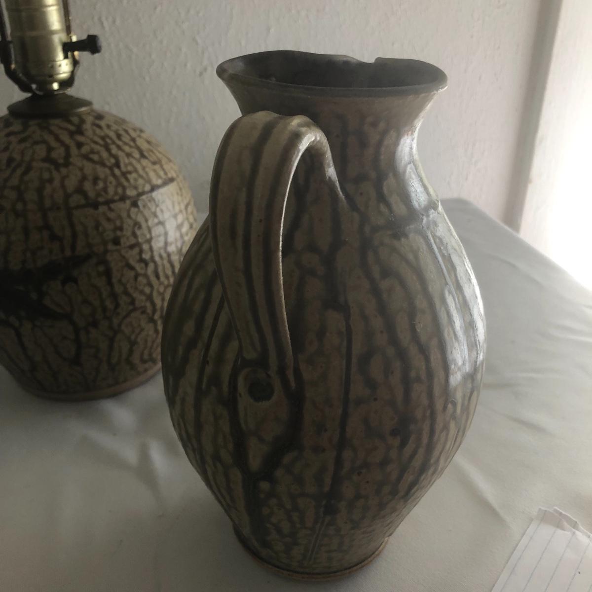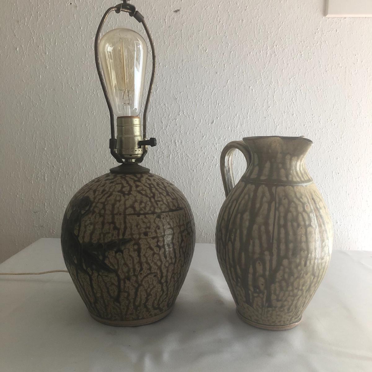We have paired two similarly glazed pieces of pottery here. The pitcher has the makers signature and the lamp has a signature that possibly reads Jan Lee or something similar. Pitcher measures 3.5” d x 10.5” tall. Edison bulb and white lamp shade are included.