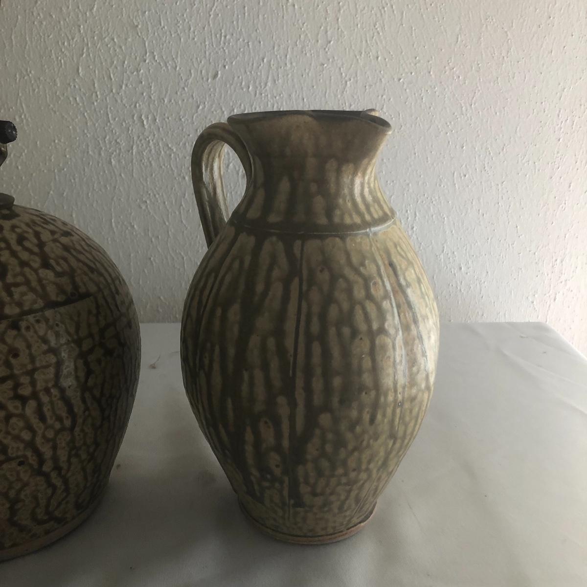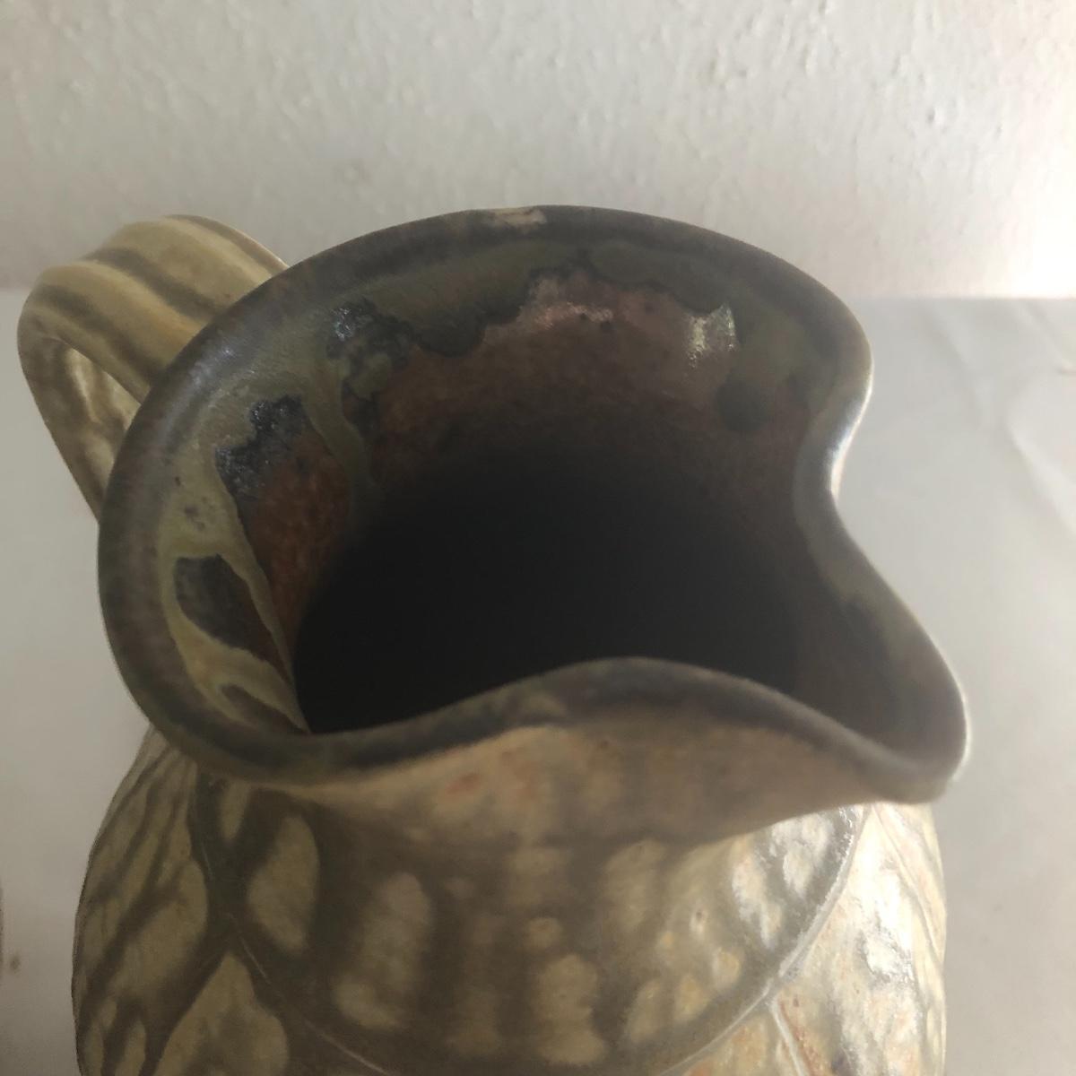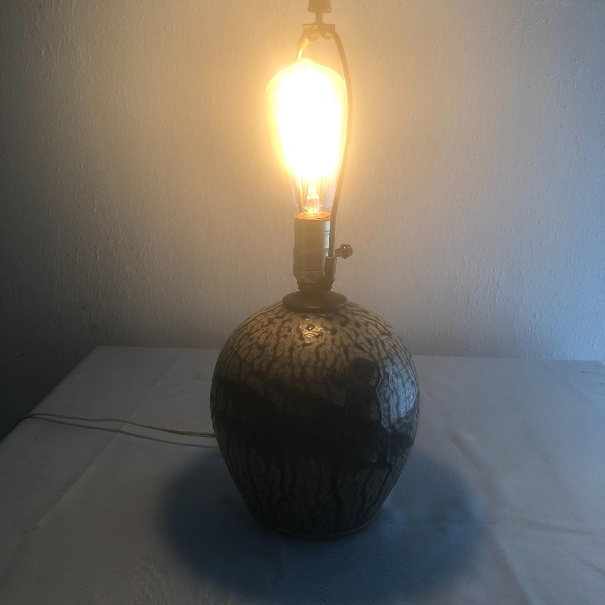 We have paired two similarly glazed pieces of pottery here. The pitcher has the makers signature and the lamp has a signature that possibly reads Jan Lee or something similar. Pitcher measures 3.5” d x 10.5” tall. Edison bulb and white lamp shade are included.