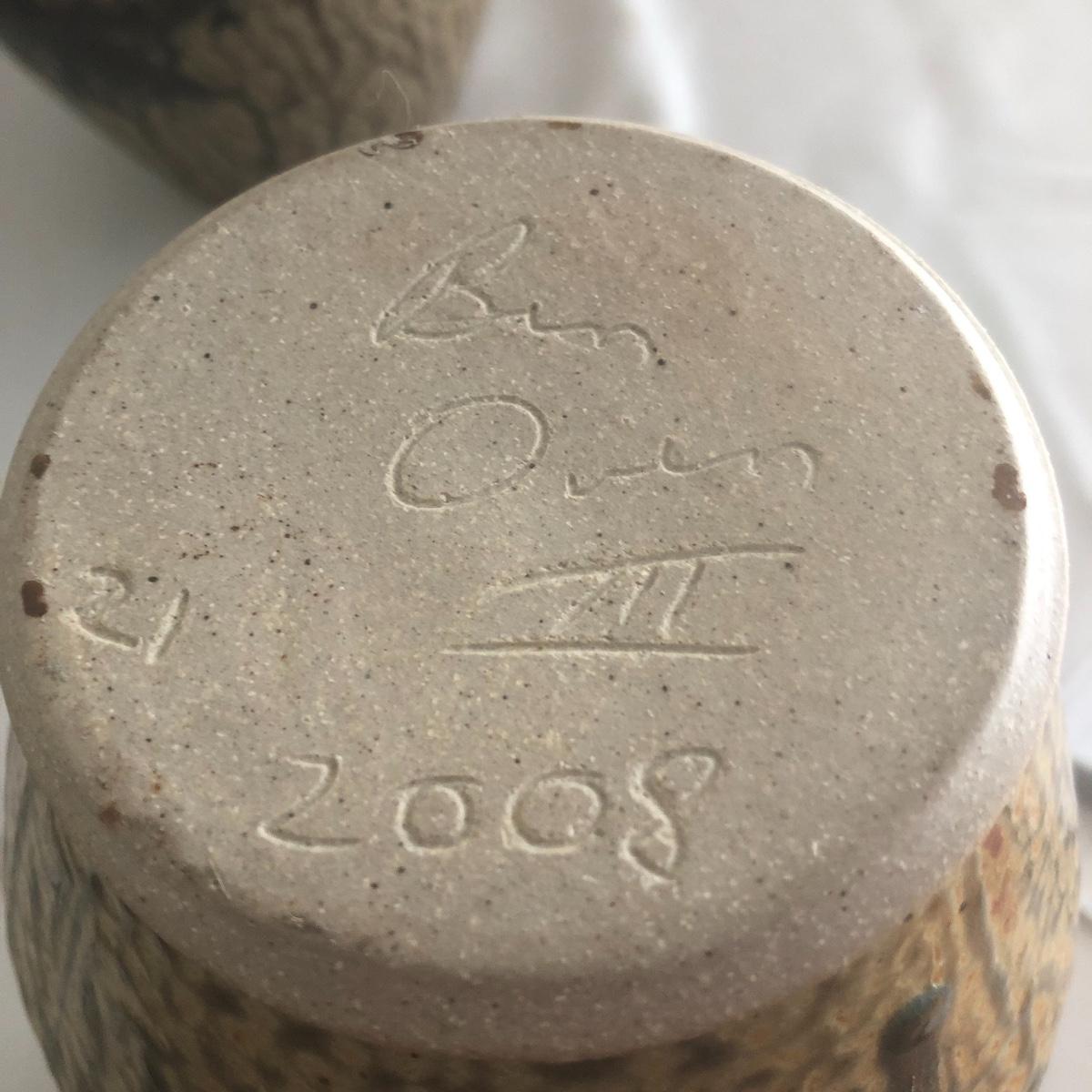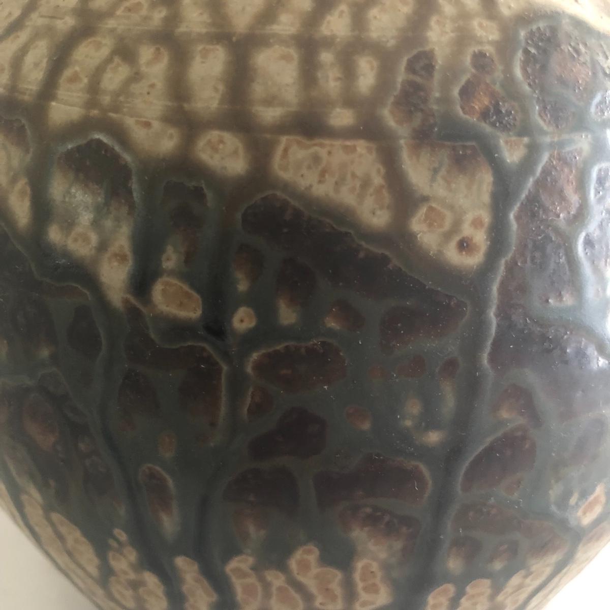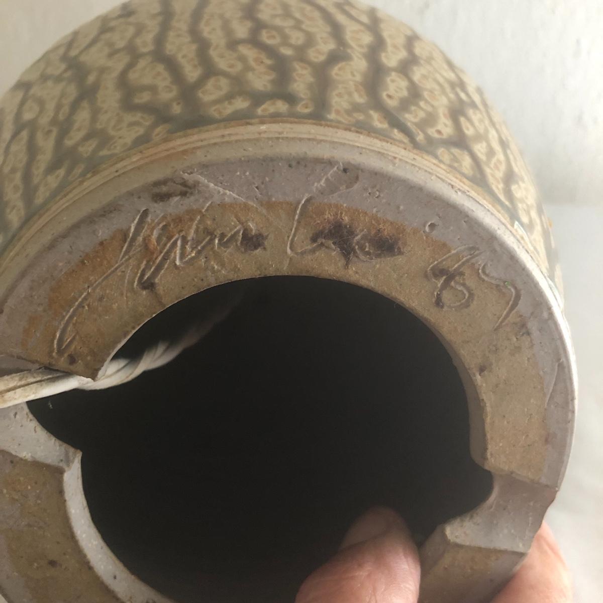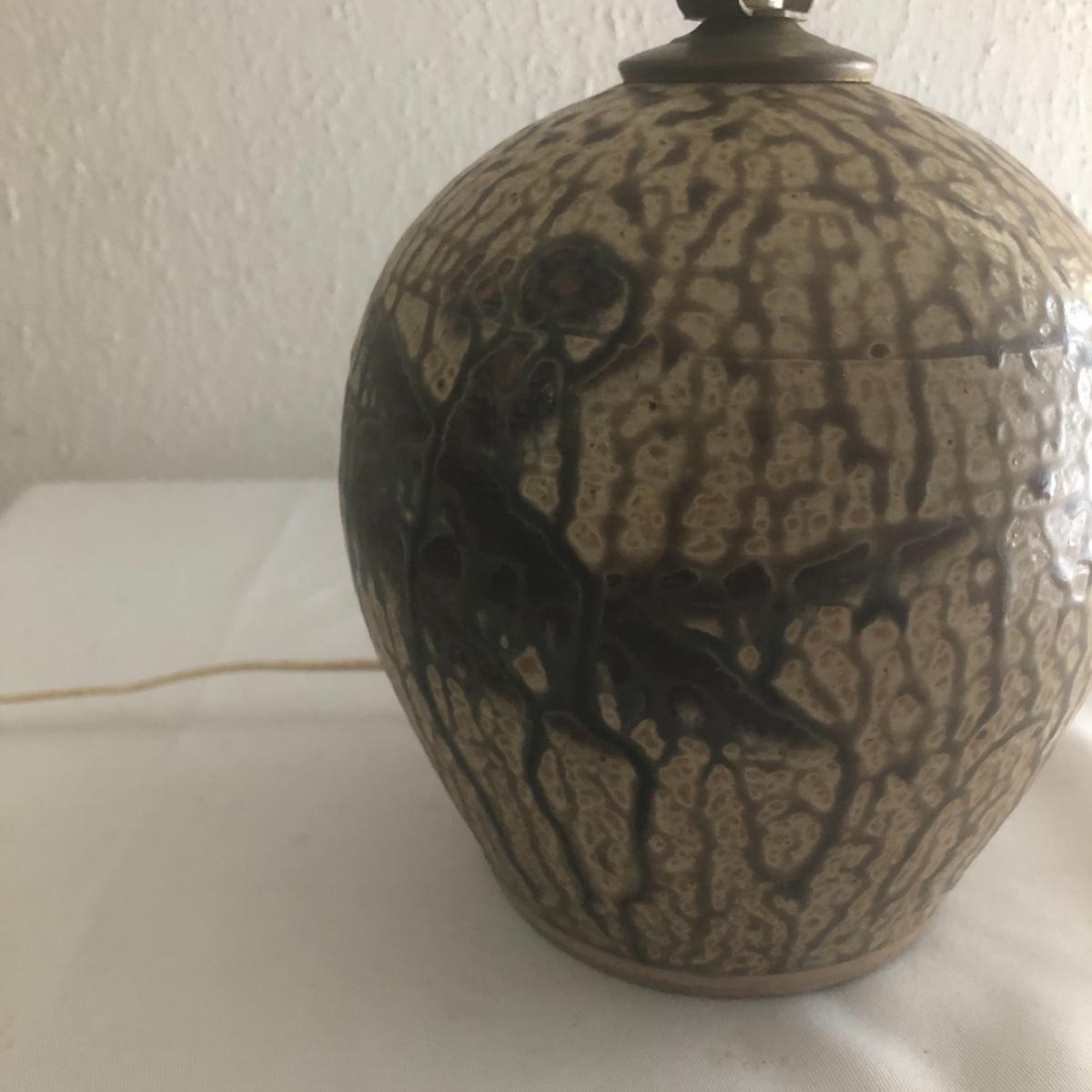 We have paired two similarly glazed pieces of pottery here. The pitcher has the makers signature and the lamp has a signature that possibly reads Jan Lee or something similar. Pitcher measures 3.5” d x 10.5” tall. Edison bulb and white lamp shade are included.