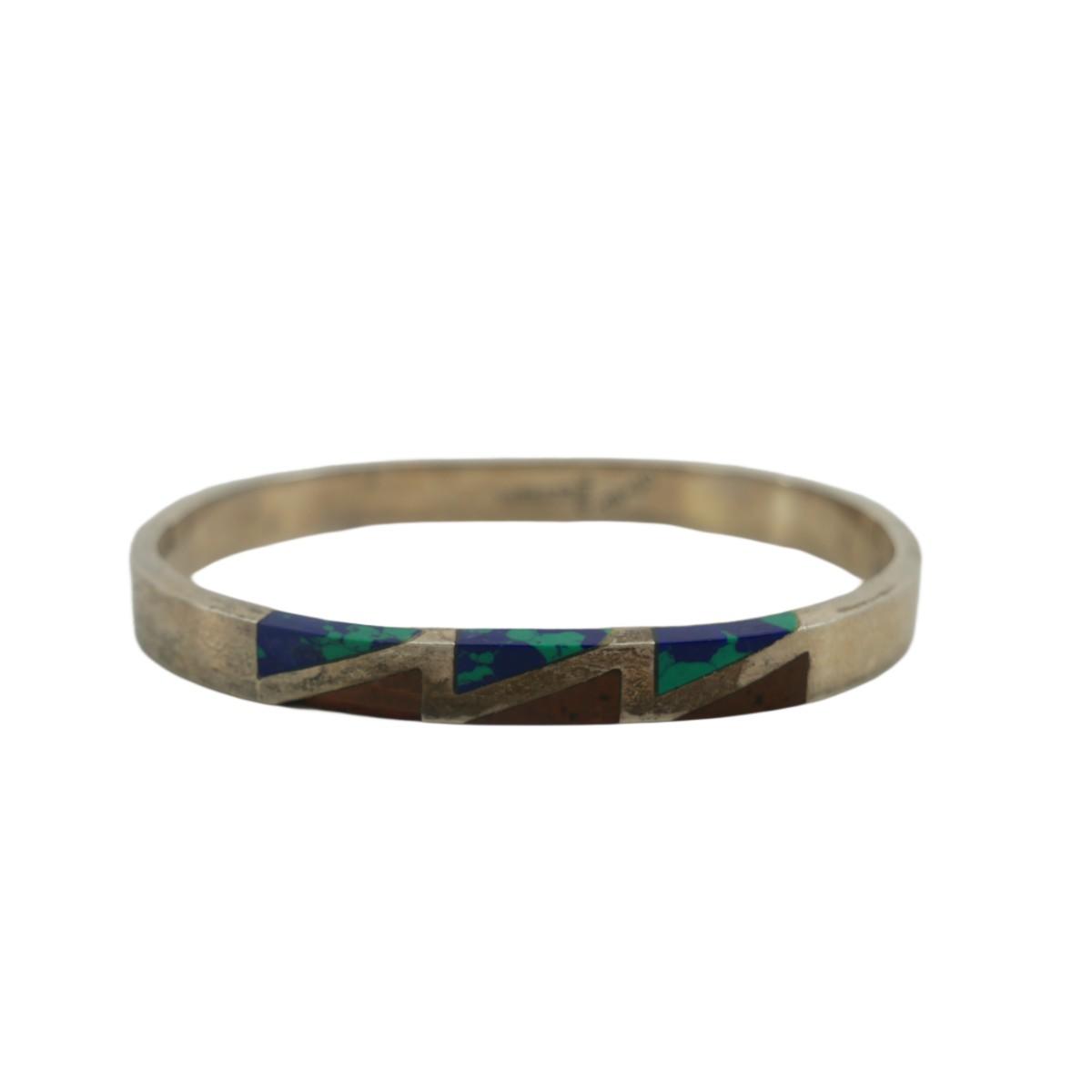 Beautiful .950 Sterling Silver bangle bracelet with stone, mineral inlay. One brown stone has slight chip.