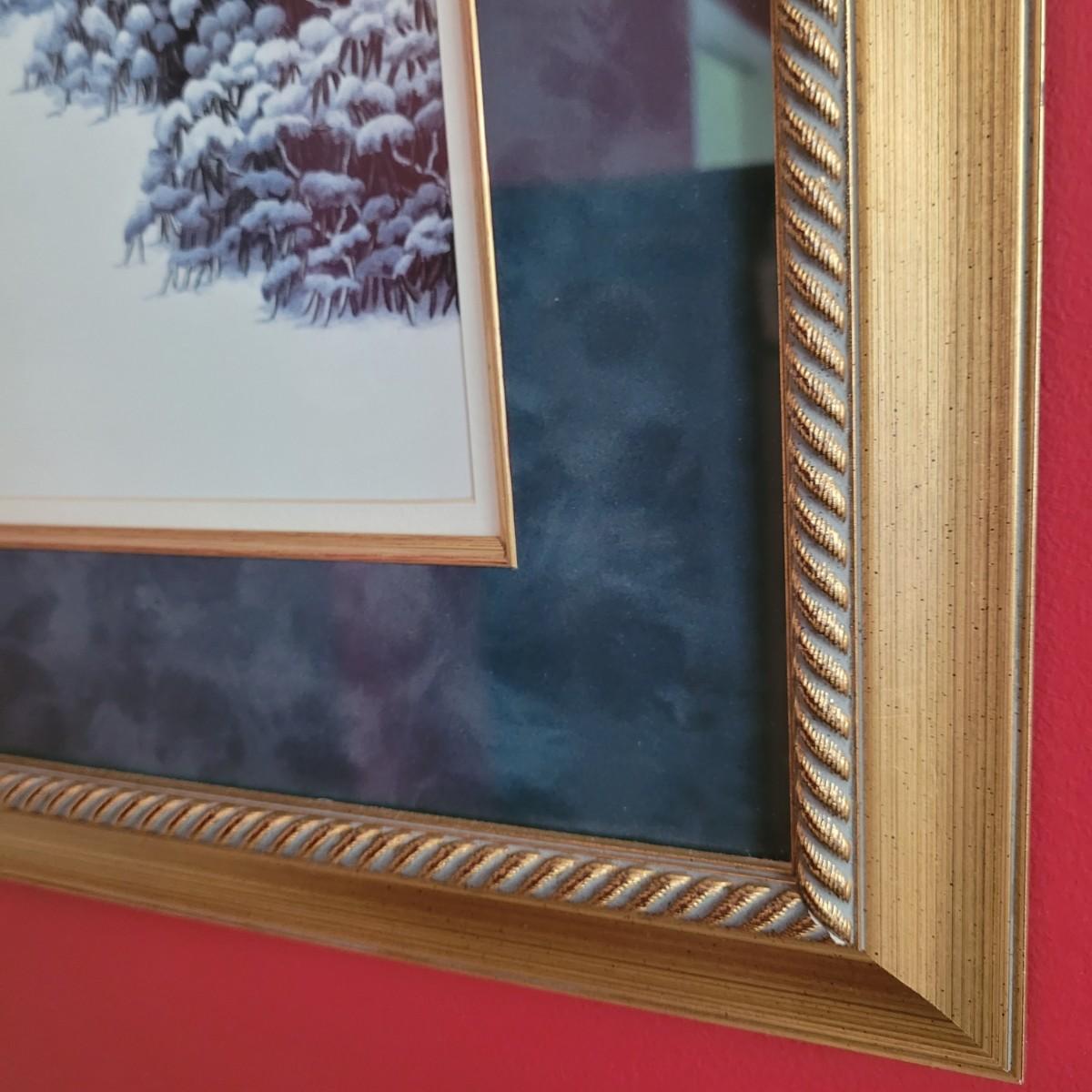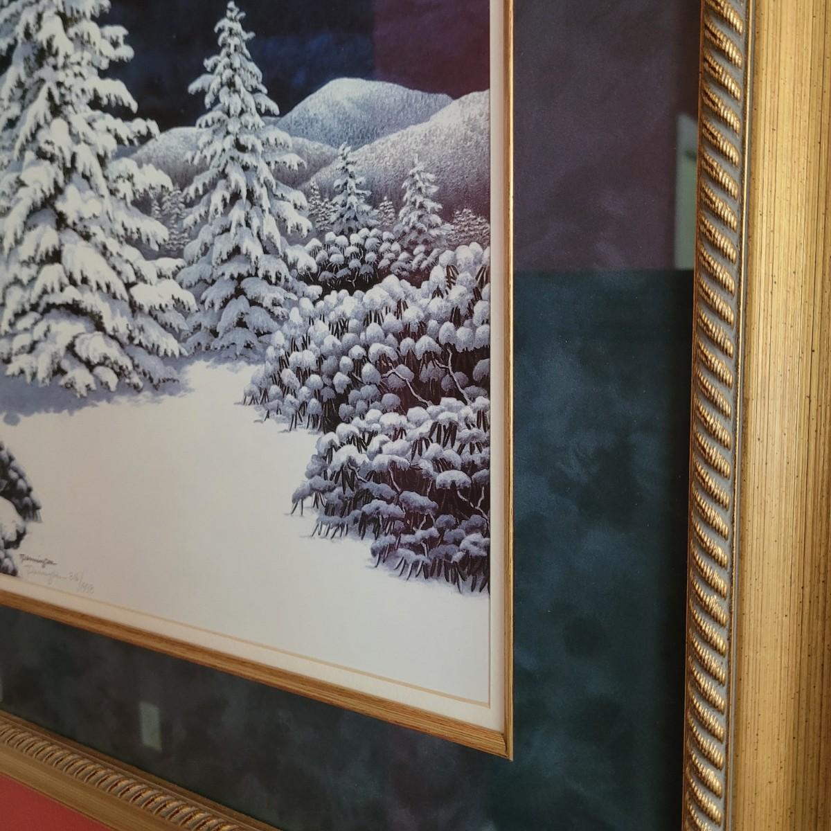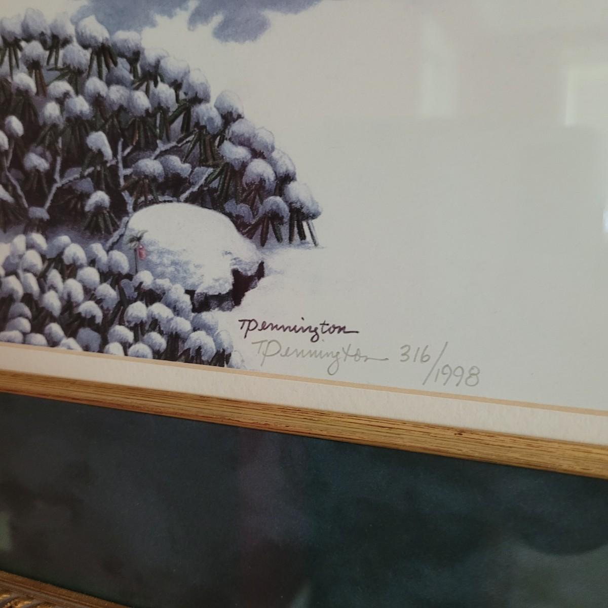 This lovely signed Prismacolor print by Teresa Pennington depicts a beautiful, serene, calm winter night scene with a full moon illuminating snow covered evergreen trees. Double matted in a gold colored wooden frame. Measures approximately 25” x 29”. Shipping available. Shipping art can be costly. We suggest contacting our preferred local shipping provider, Postage Express, with dimensions and getting an estimate before bidding: (828) 670-5501 or shipping@postageexpressnc.com.