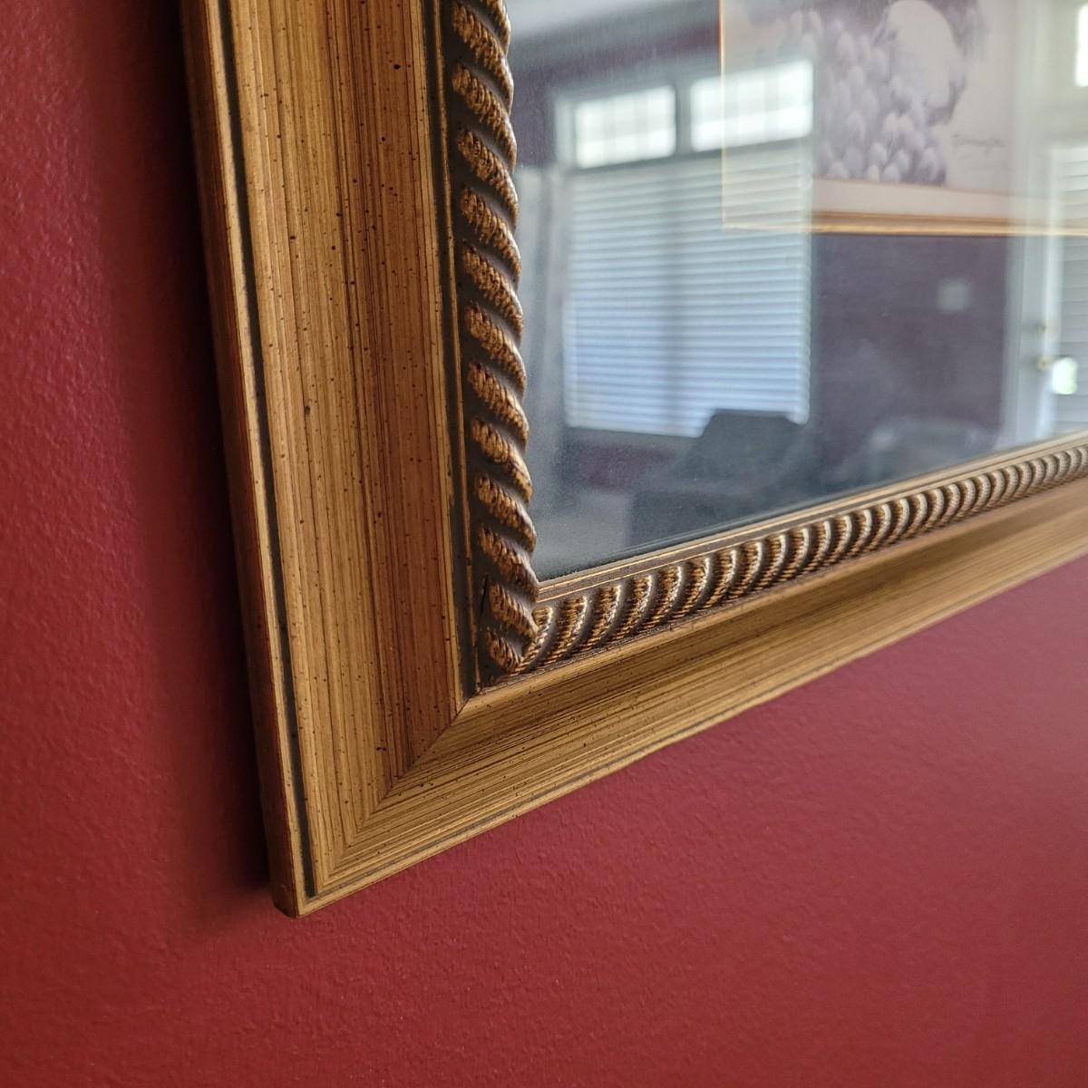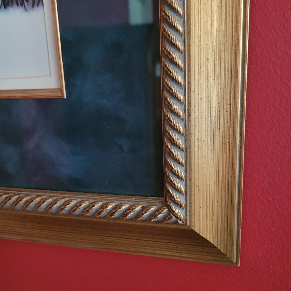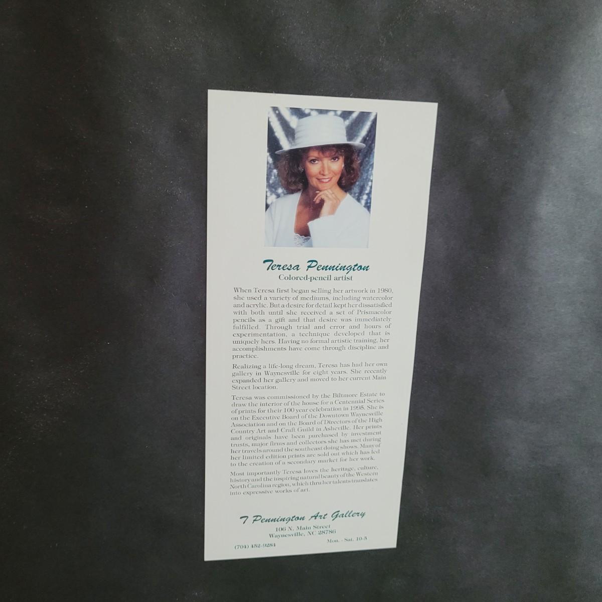 This lovely signed Prismacolor print by Teresa Pennington depicts a beautiful, serene, calm winter night scene with a full moon illuminating snow covered evergreen trees. Double matted in a gold colored wooden frame. Measures approximately 25” x 29”. Shipping available. Shipping art can be costly. We suggest contacting our preferred local shipping provider, Postage Express, with dimensions and getting an estimate before bidding: (828) 670-5501 or shipping@postageexpressnc.com.