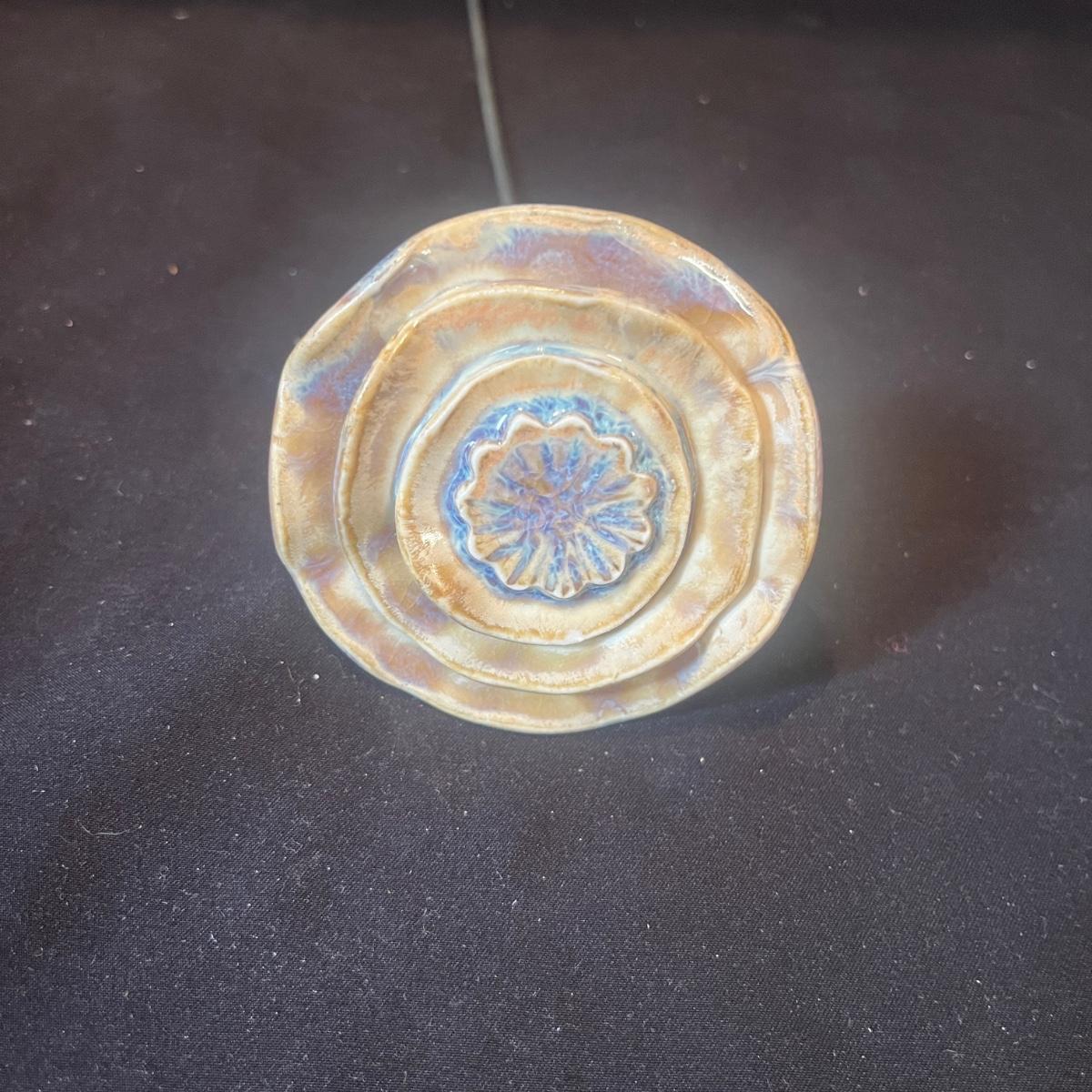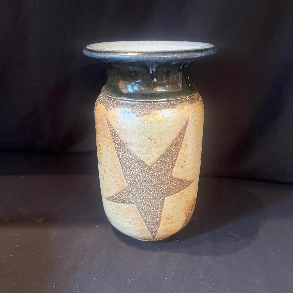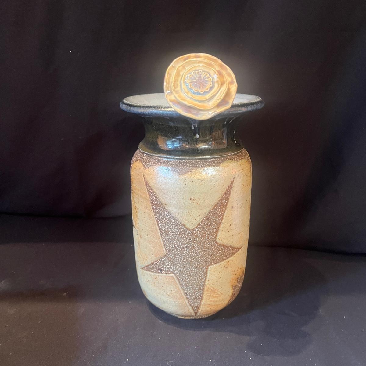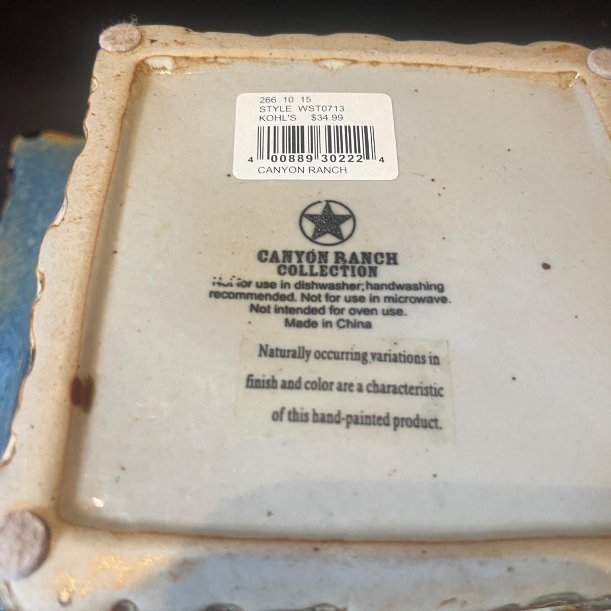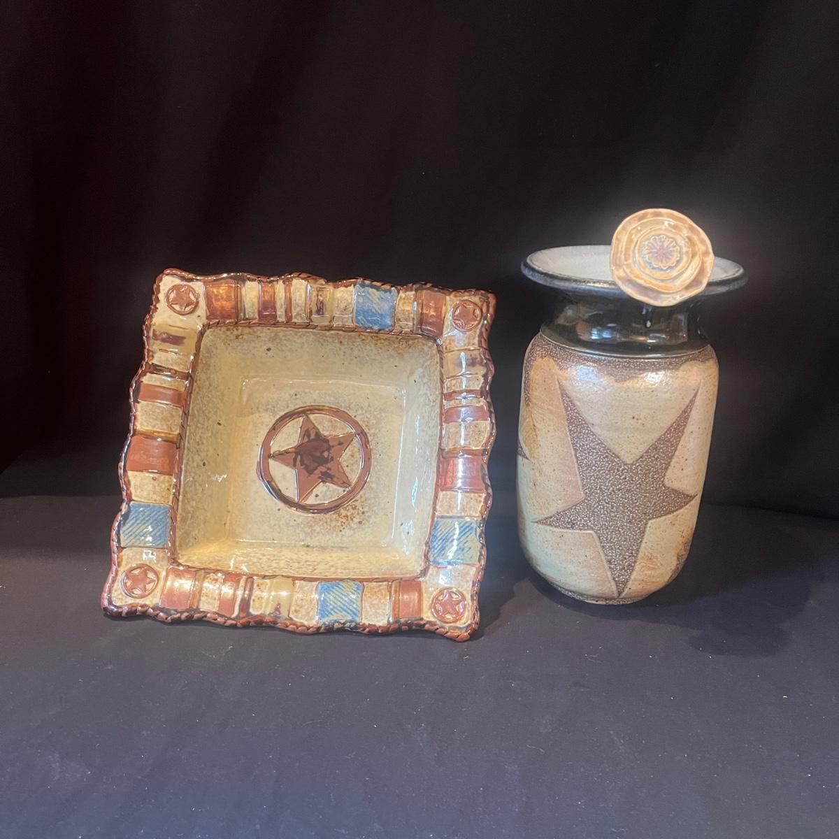 Lot includes a signed vase, ceramic flower and a Canyon Ranch dish. Vase measures 6.5”D x 10.5”H.