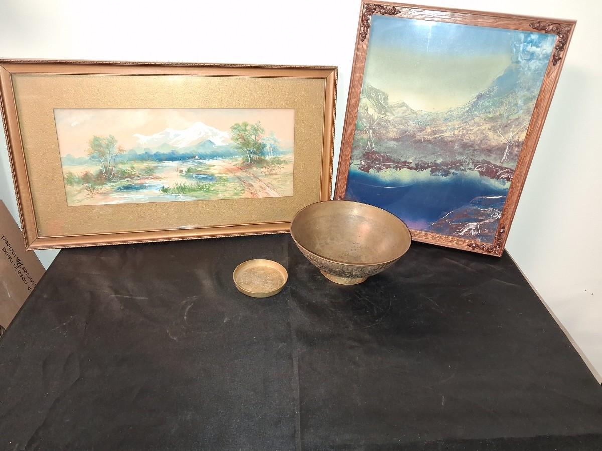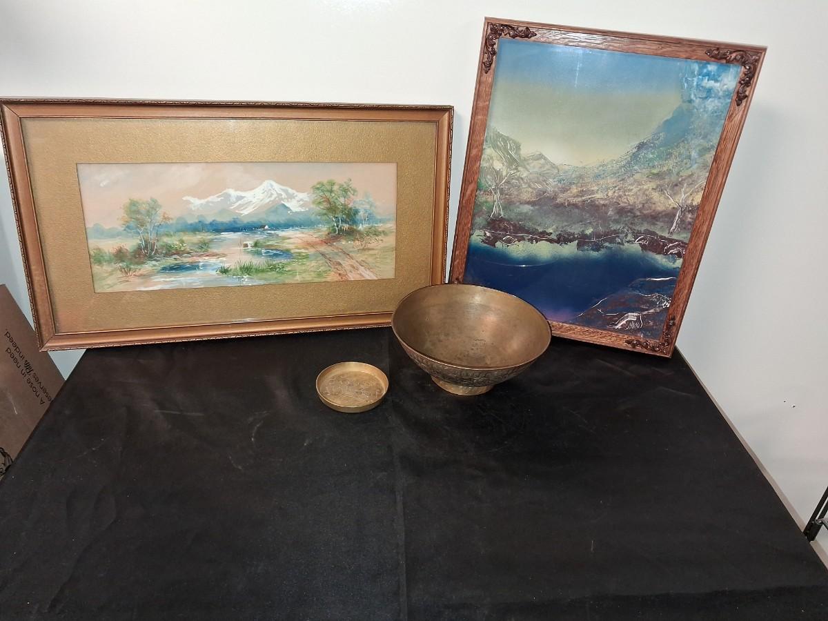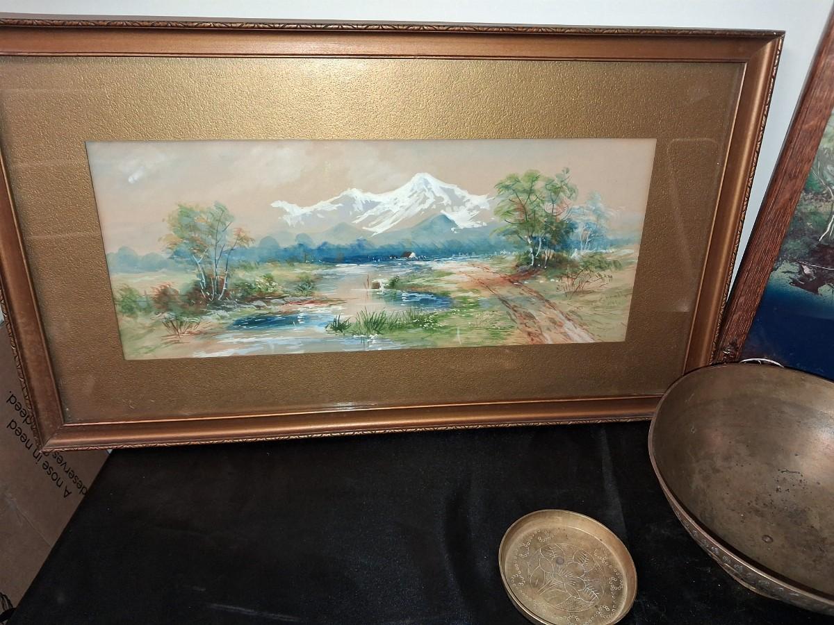 SIGNED WATERCOLOR AND SCENERY PICTURE PLUS BRASS BOWL