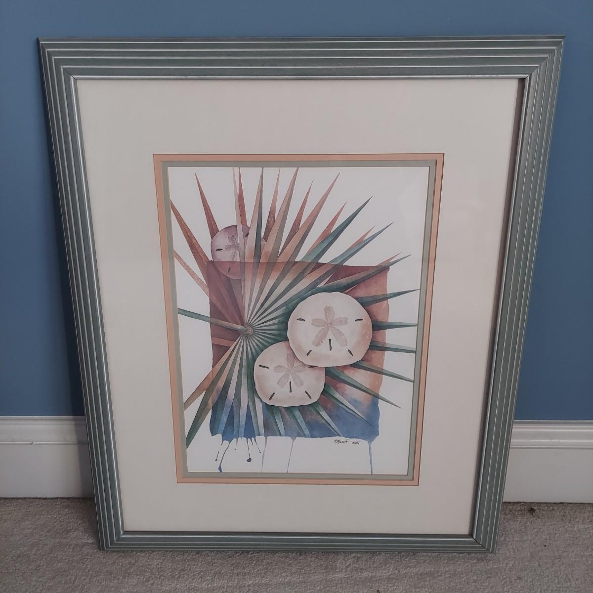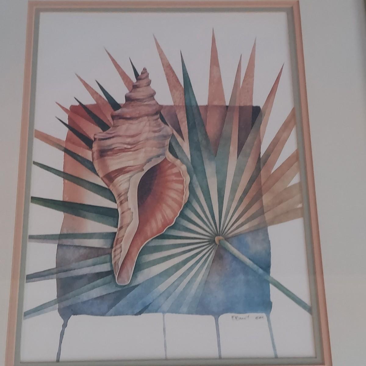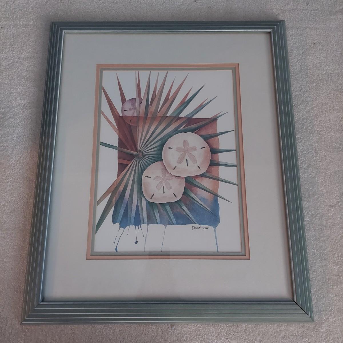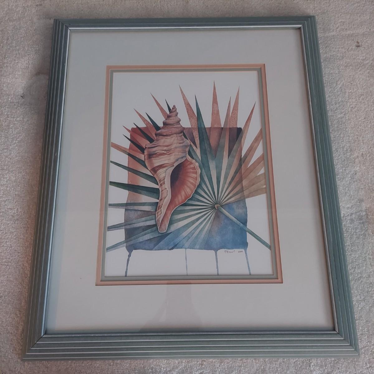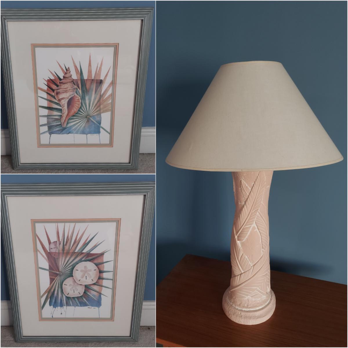 Beach themed decor including two signed watercolor prints with triple matte and matching wood frames. Frames measure 21.5” x 24.5"H. Also a ceramic lamp with palm leaf carvings that appears to be terracotta. Lamp is 33"H with a cloth shade measures approximately 22” x 14”. Please see photos for details. Local Pickup Only