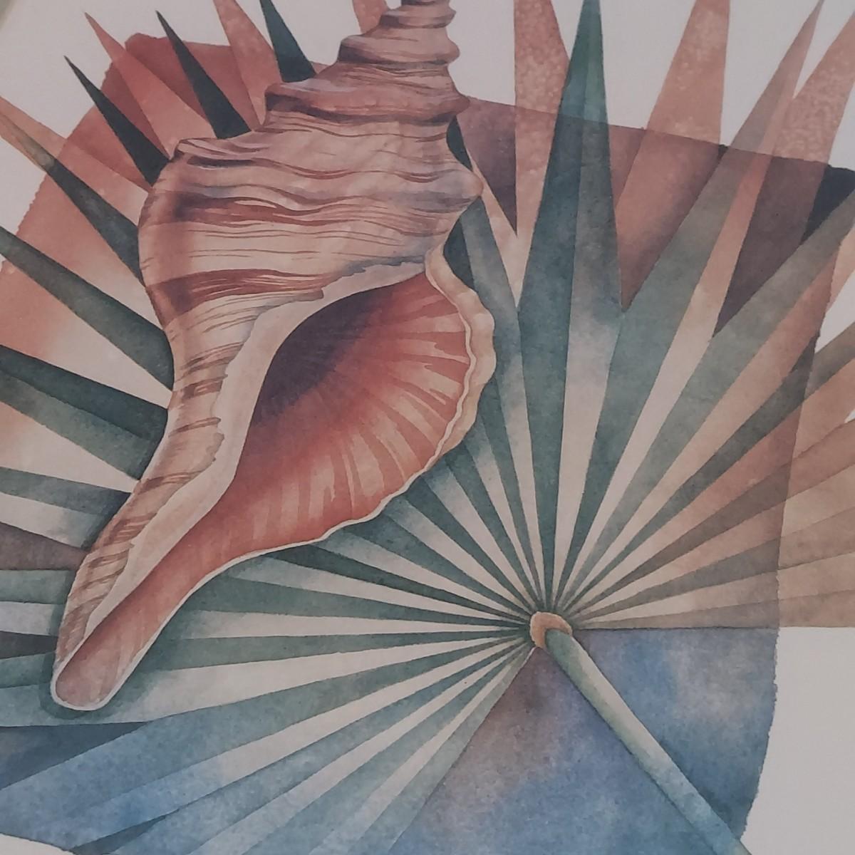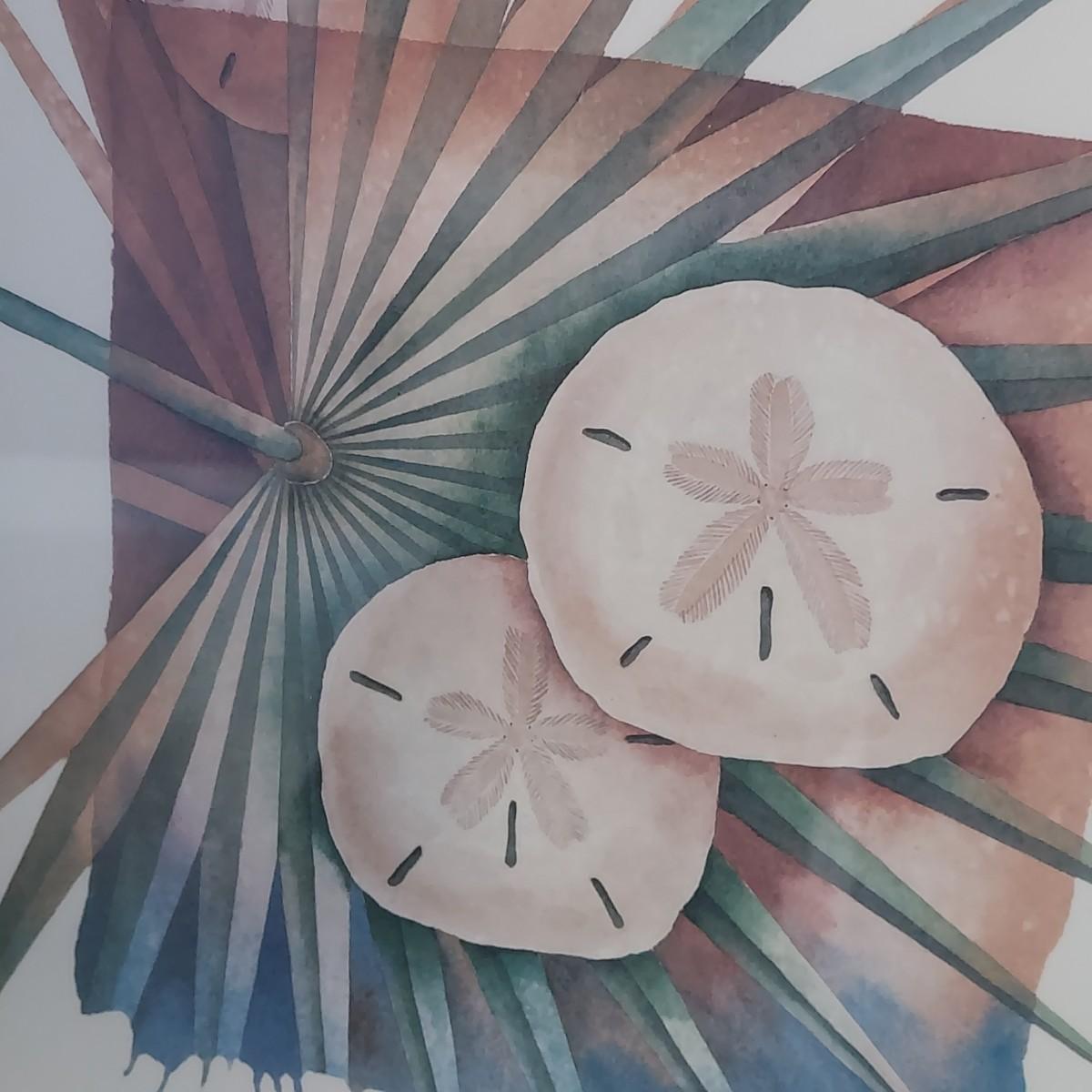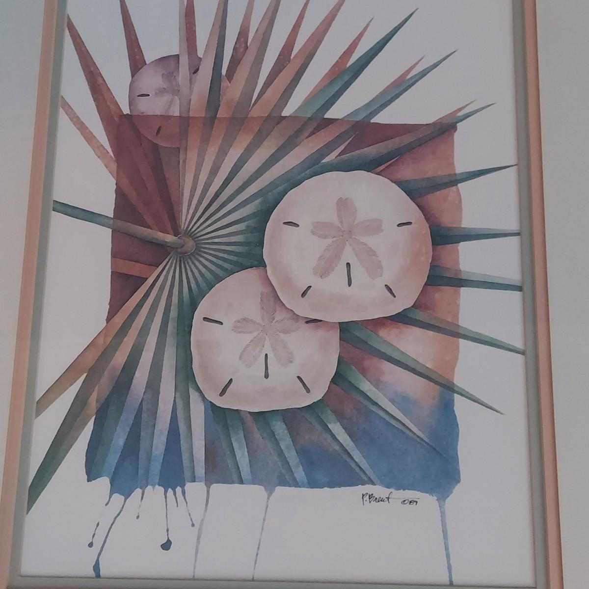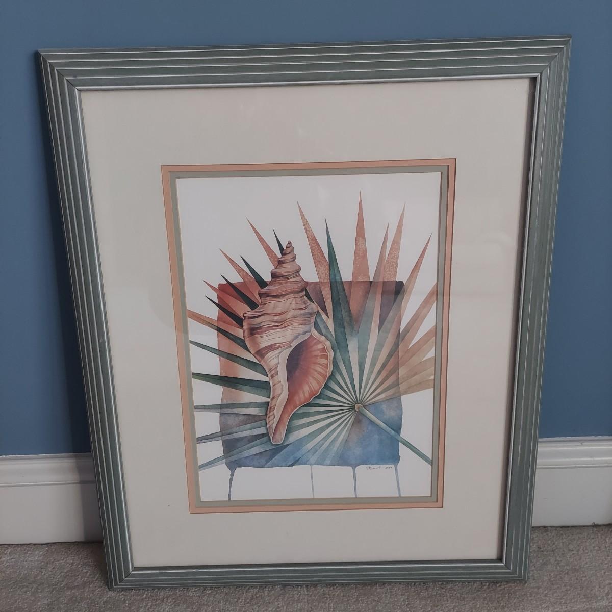 Beach themed decor including two signed watercolor prints with triple matte and matching wood frames. Frames measure 21.5” x 24.5"H. Also a ceramic lamp with palm leaf carvings that appears to be terracotta. Lamp is 33"H with a cloth shade measures approximately 22” x 14”. Please see photos for details. Local Pickup Only