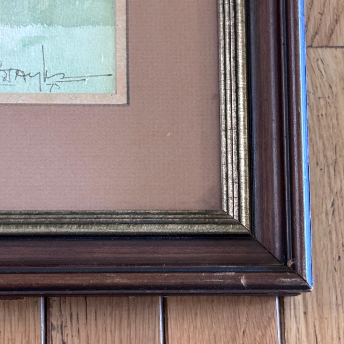 Lot includes one watercolor landscape painting that appears to be signed in the bottom right corner. The art is protected with a sheet of glass, and is matted twice and framed in a wooden frame. The frame has a few scuffs on it - see pictures included. It measures 22” x 17”H. Shipping available.