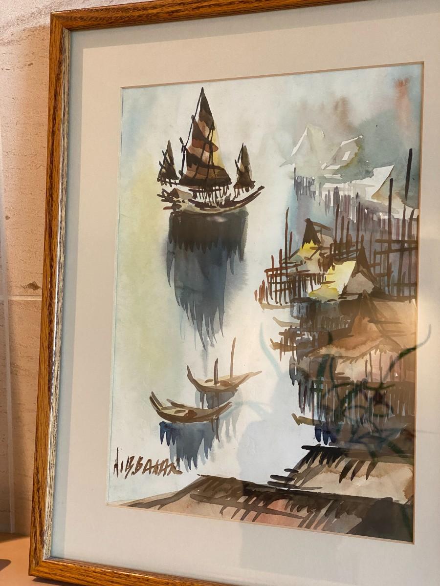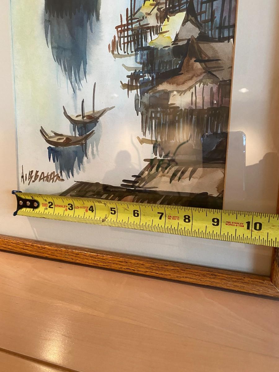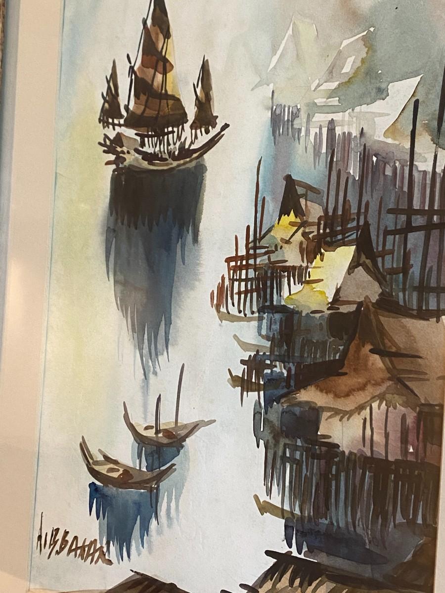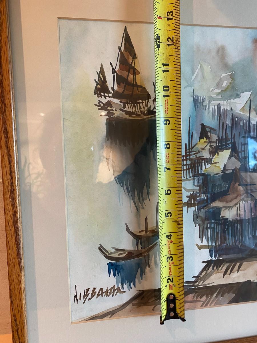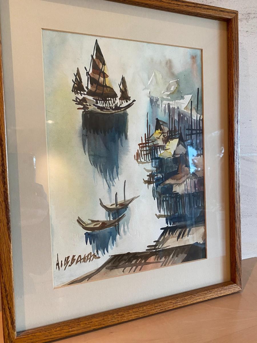 Signed and Framed watercolor painting of ships in a marina (appears Asian in style). In good condition, as shown.