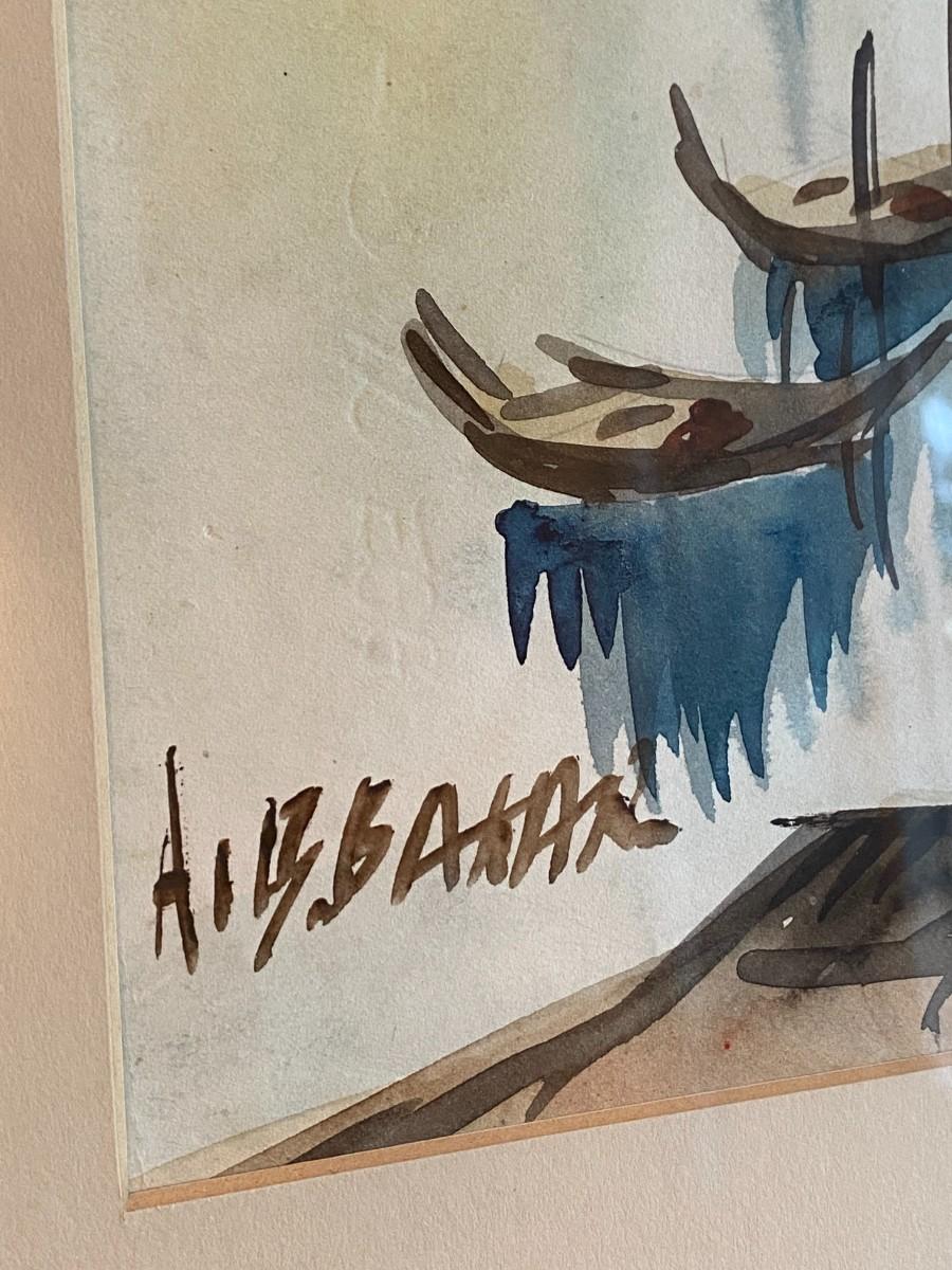 Signed Watercolor Painting of Ships in Harbor