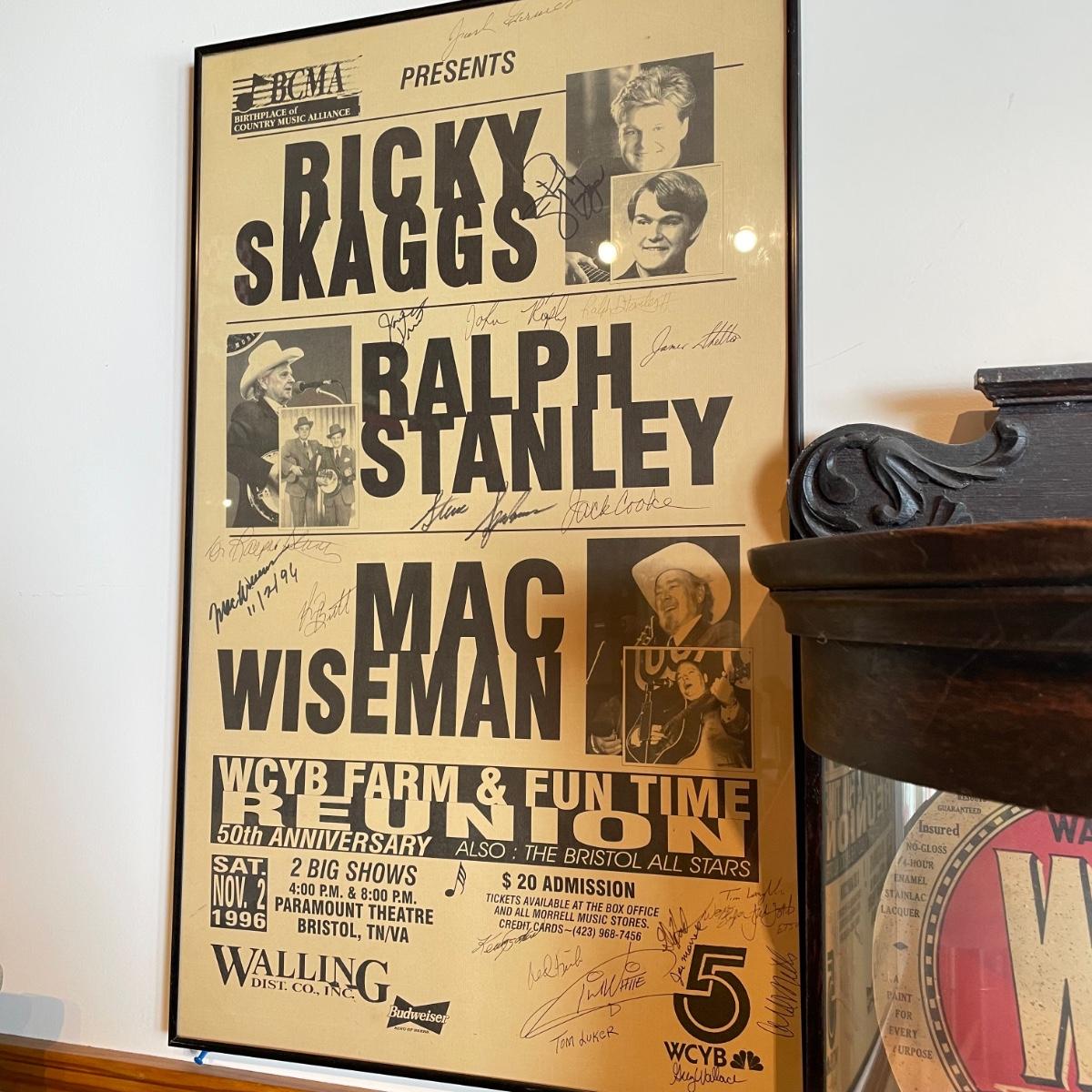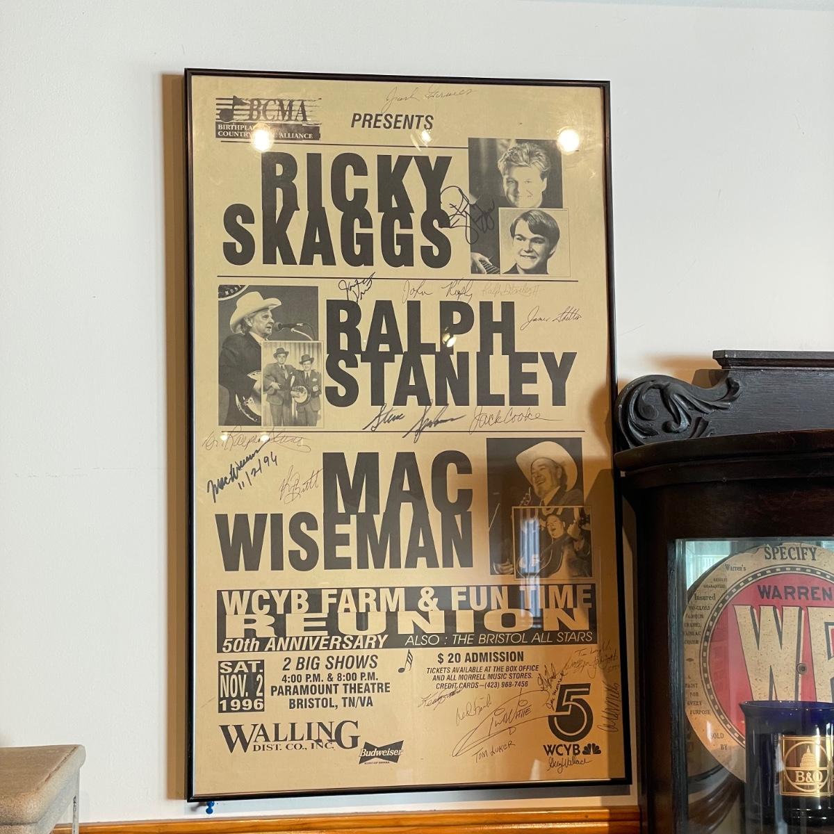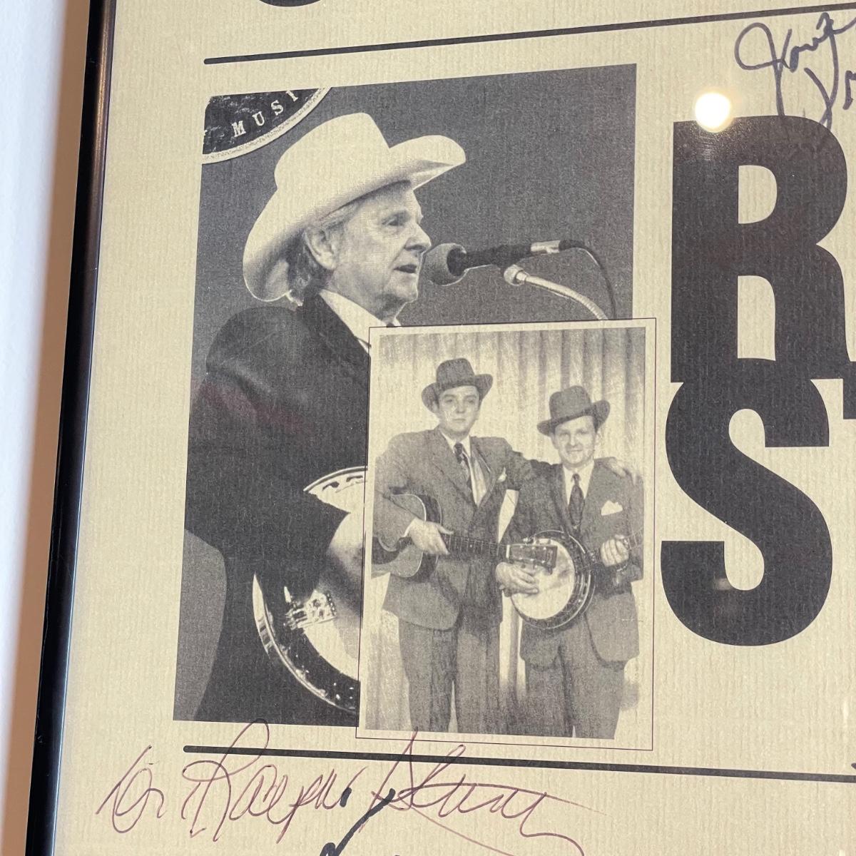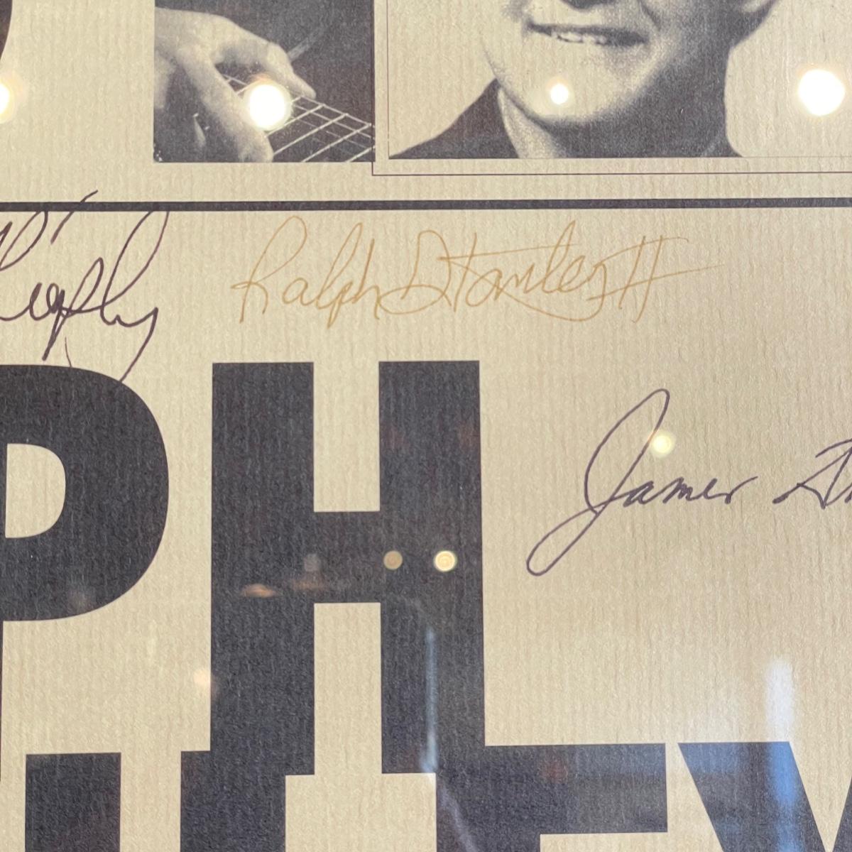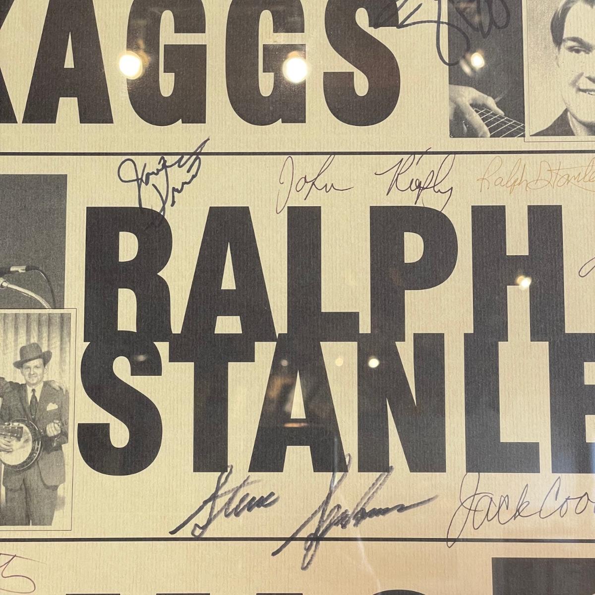 Signed and framed poster. The Birthplace of Country Music Presents Ricky Skaggs, Ralph Stanley, Mac Wiseman and the Bristol All Stars. Over twenty signatures cover the poster dated 11/2/96. The black metal frame measures 17.25” x 28.25”. Shipping available. Please call UPS with dimensions at 828-252-6930 for a shipping quote prior to bidding.