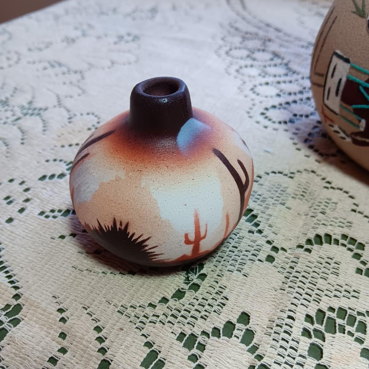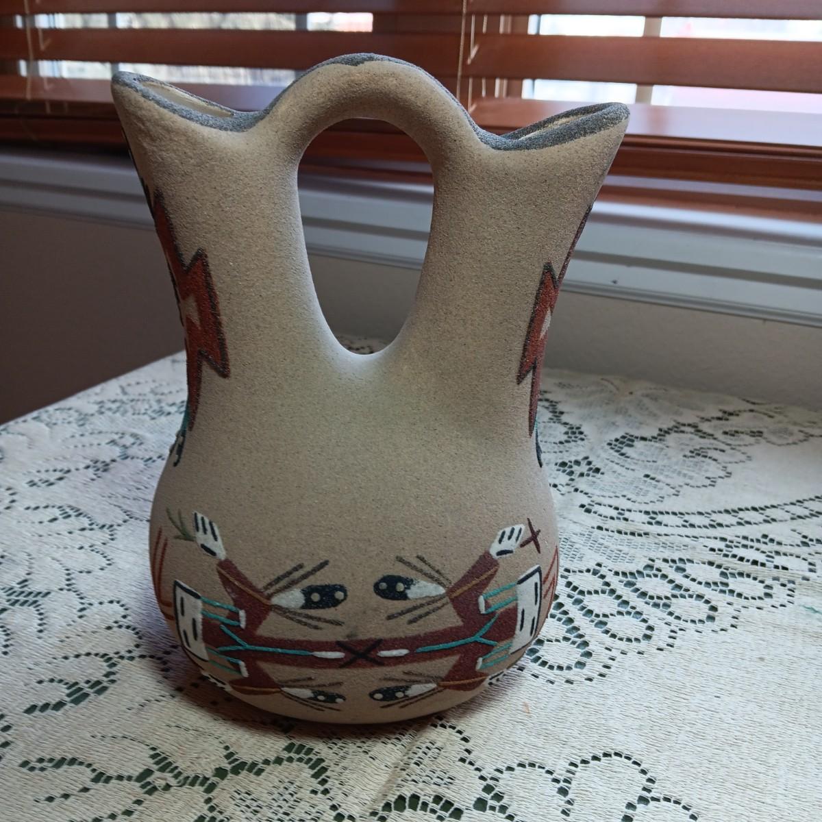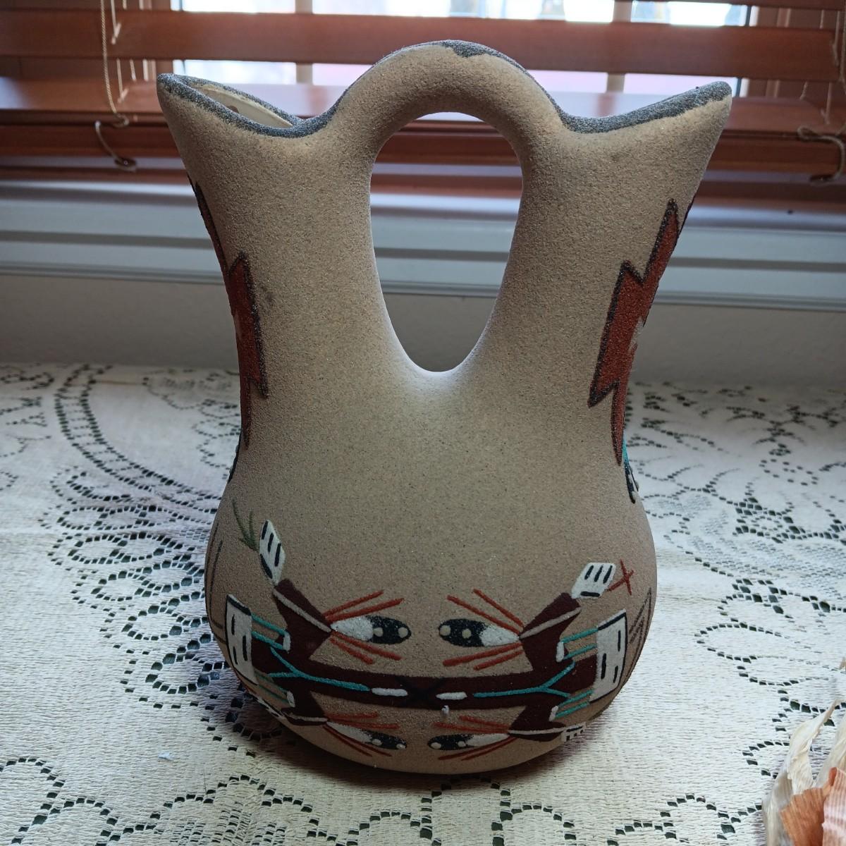 SIGNED WEDDING VASE USING SAND ART TECHNIQUE AND SIGNED SMALLER CLAY POT