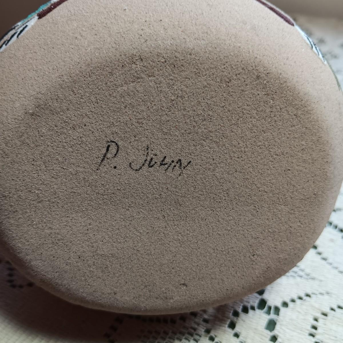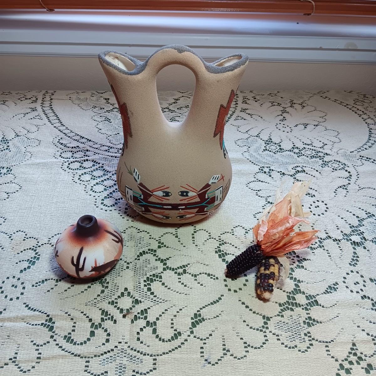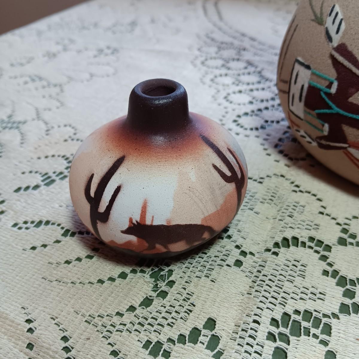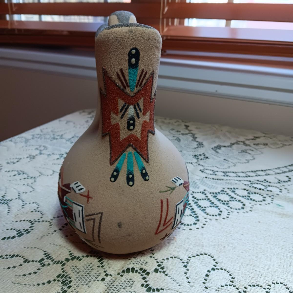 SIGNED WEDDING VASE USING SAND ART TECHNIQUE AND SIGNED SMALLER CLAY POT