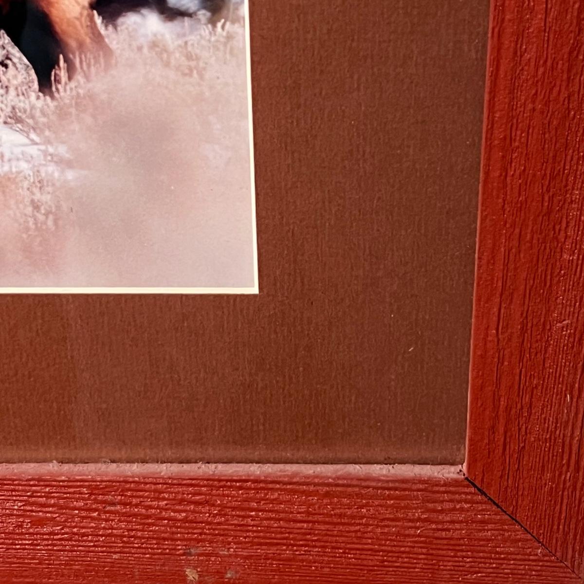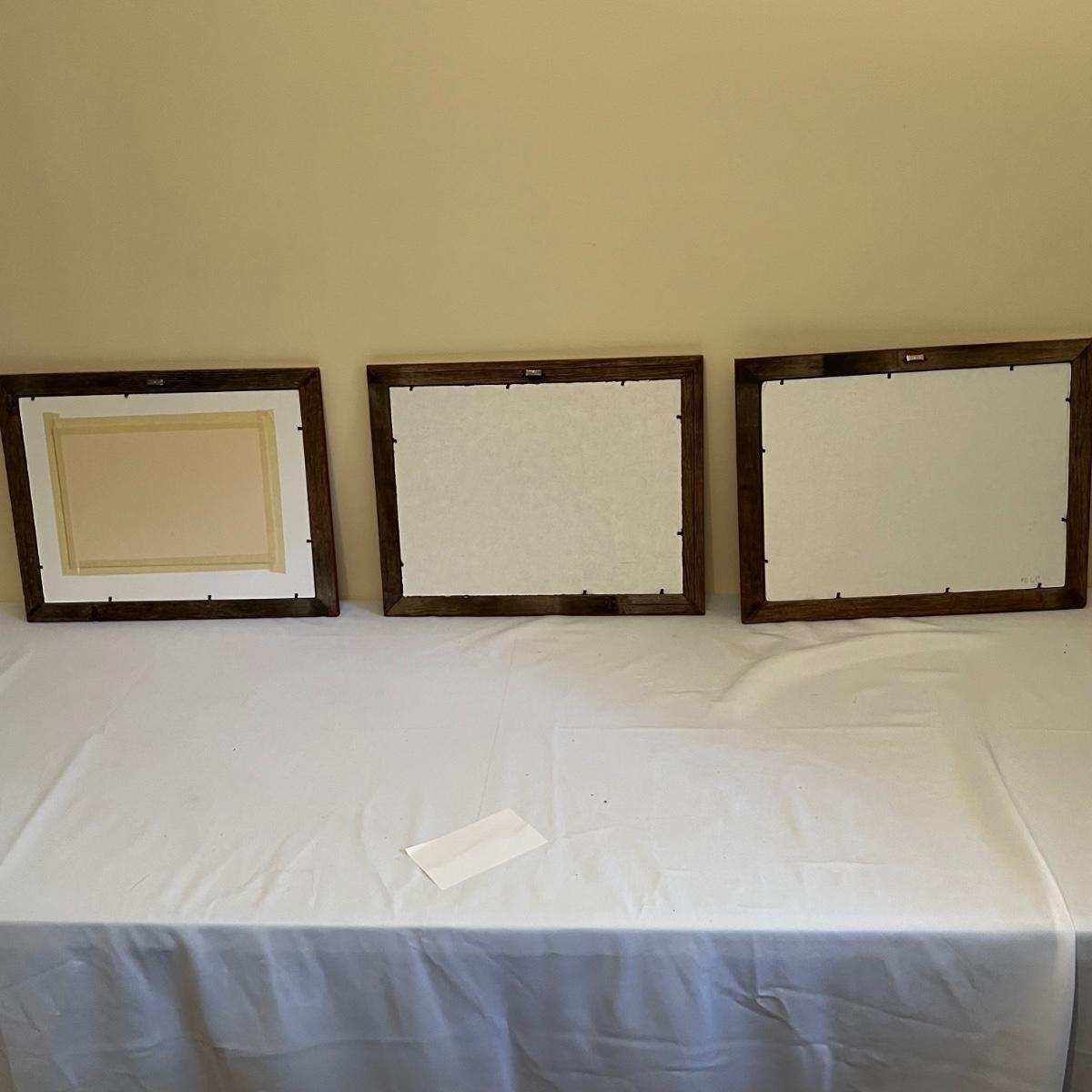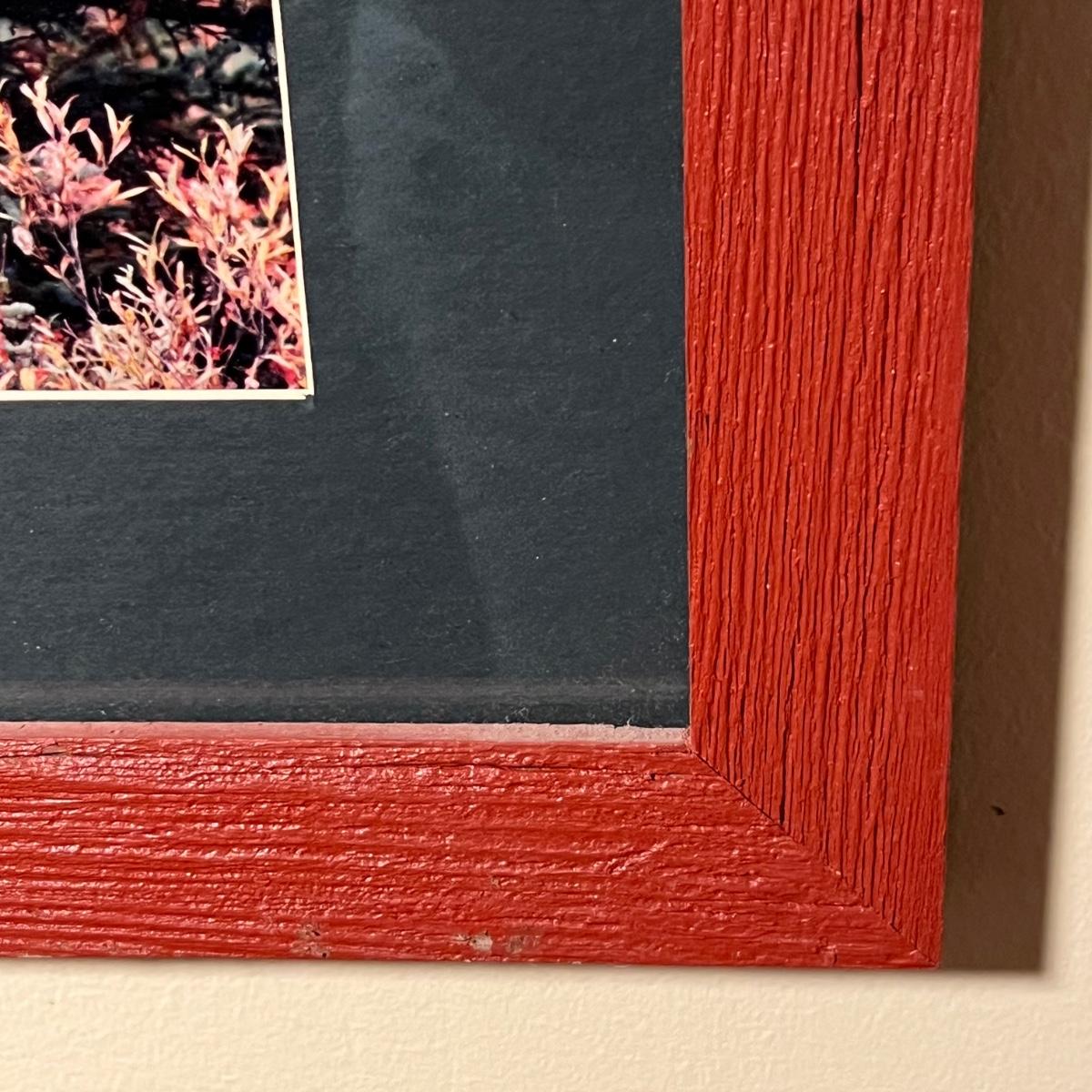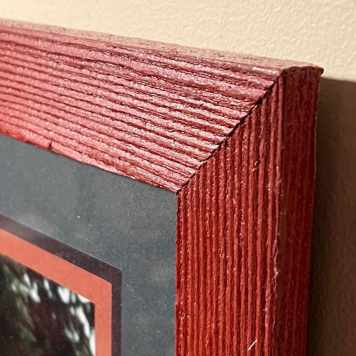 Three matching red rustic wooden frames house three pen signed photos from the same photographer. All are under glass. Signature is indecipherable, see photos.
