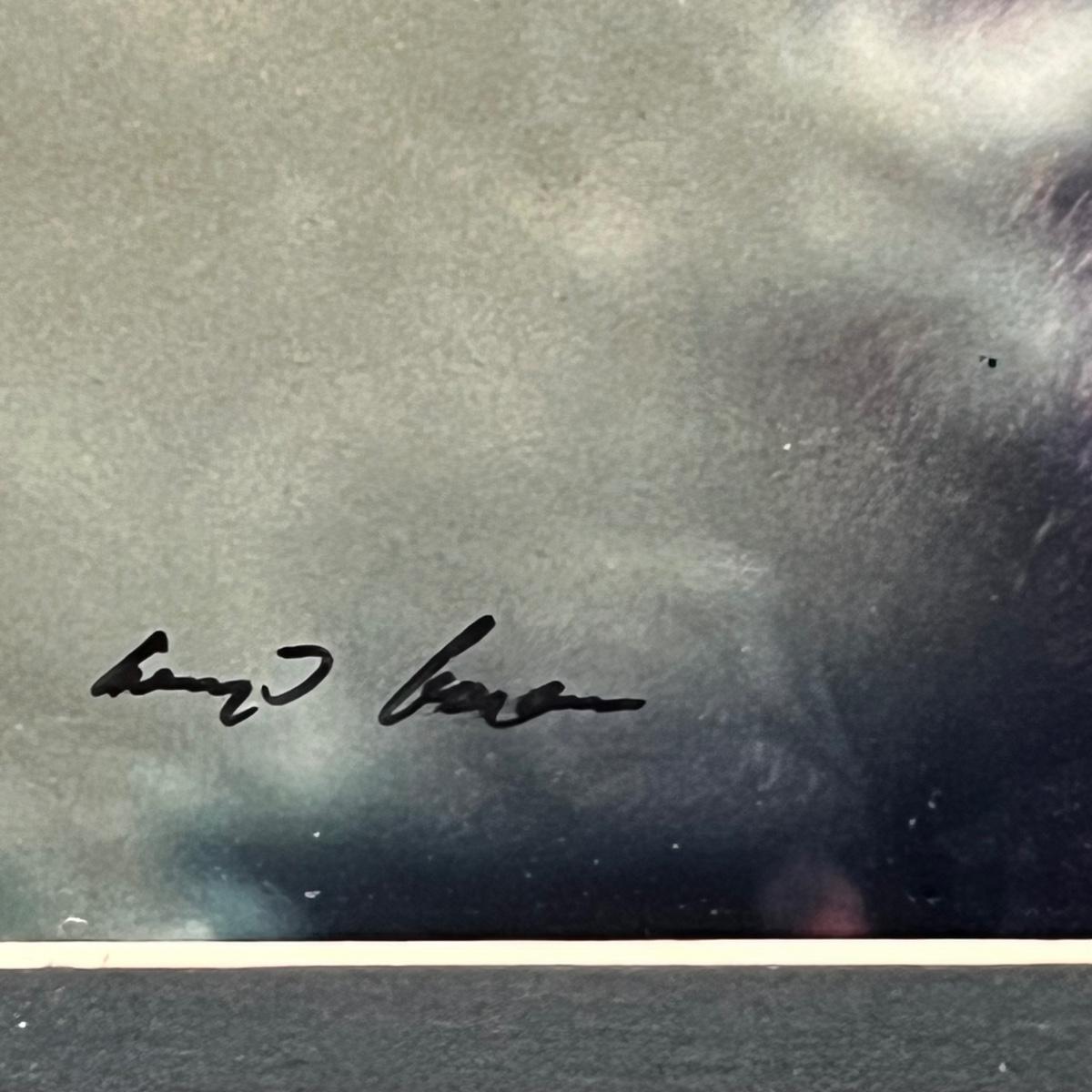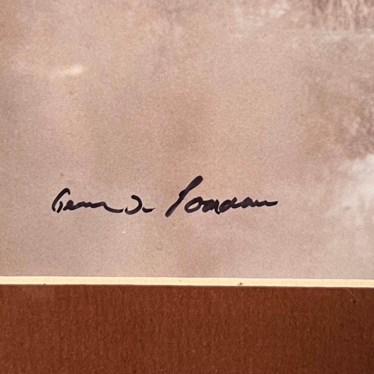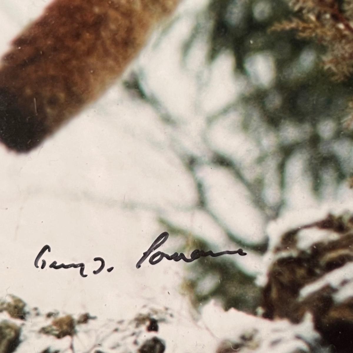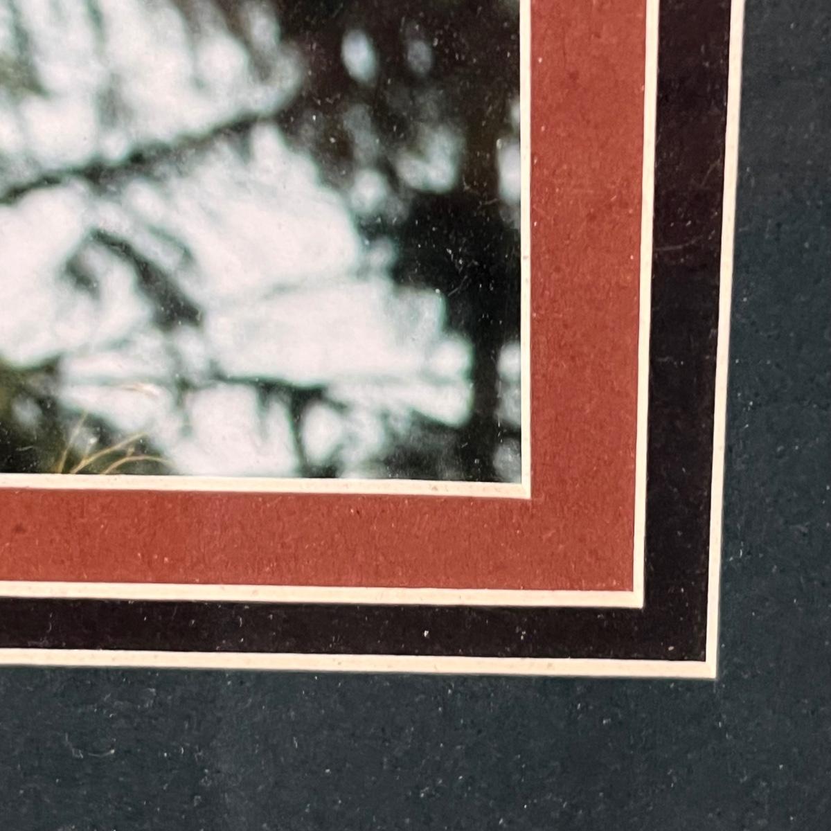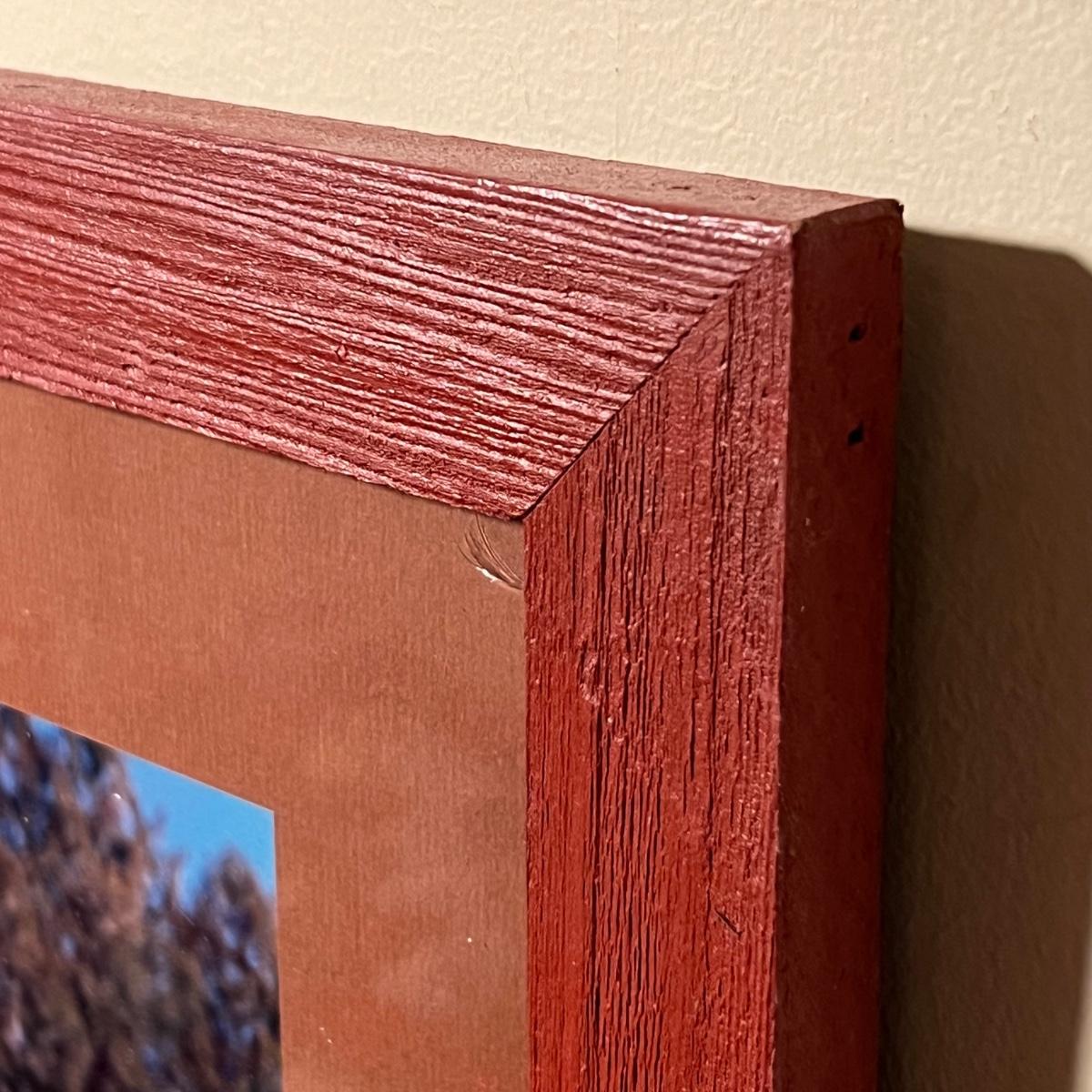Three matching red rustic wooden frames house three pen signed photos from the same photographer. All are under glass. Signature is indecipherable, see photos.