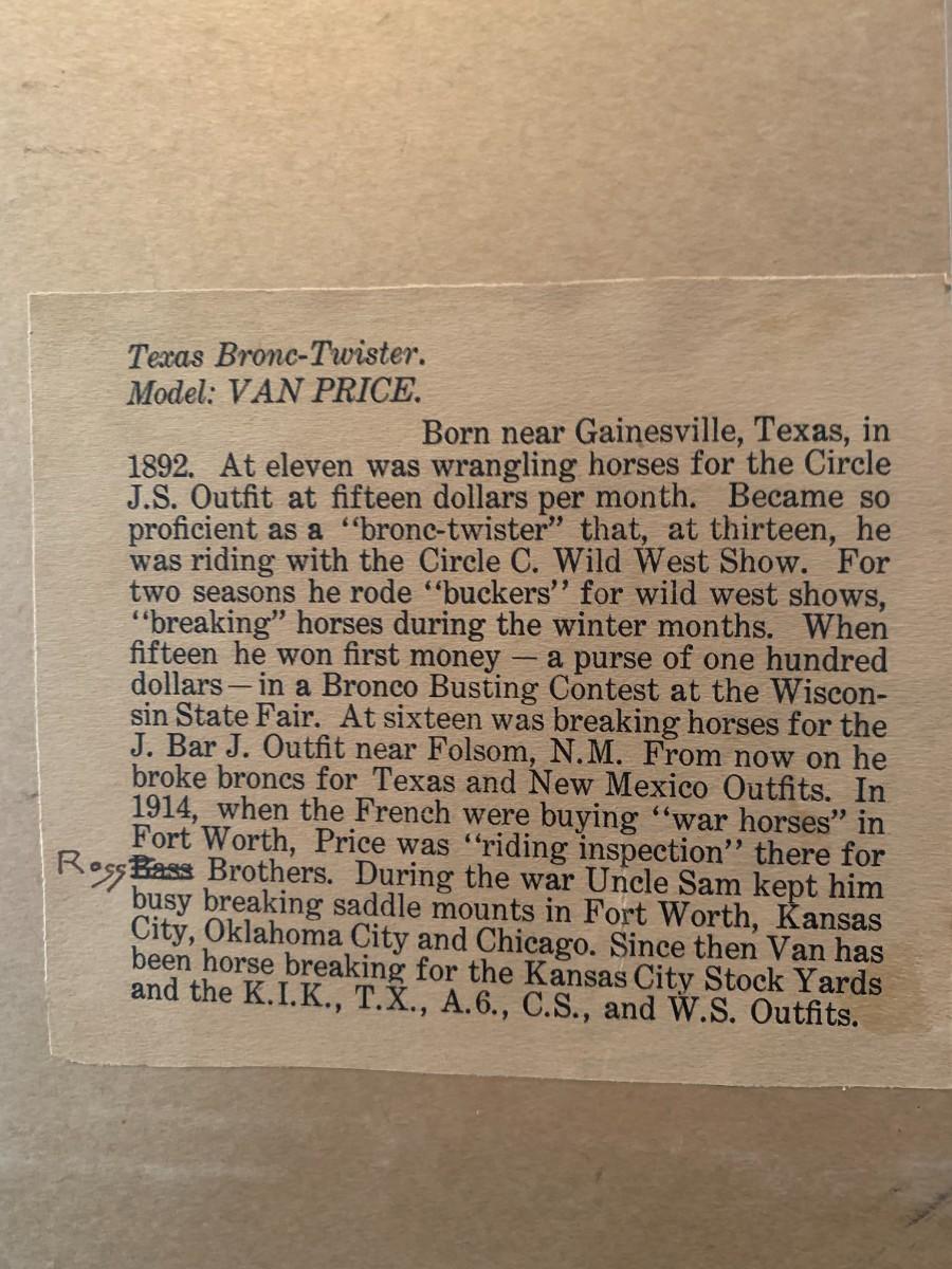 This is print 11 of 100 and features a portrait of a cowboy named Van Price. It is from Dunton's "Southwestern Series" dated 1930. Be sure and read the newspaper clippings on the back side to know the full story!!!