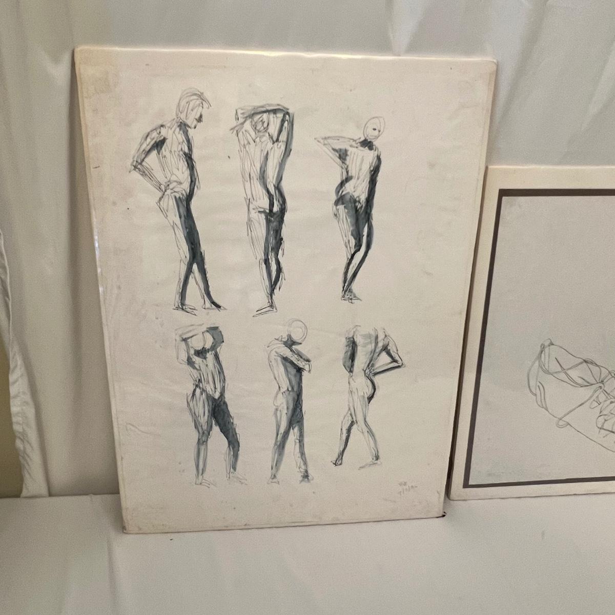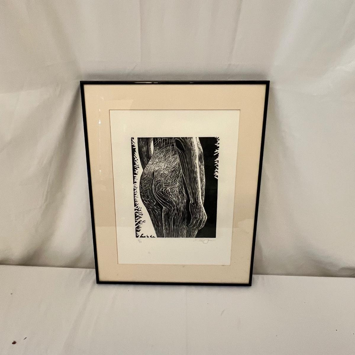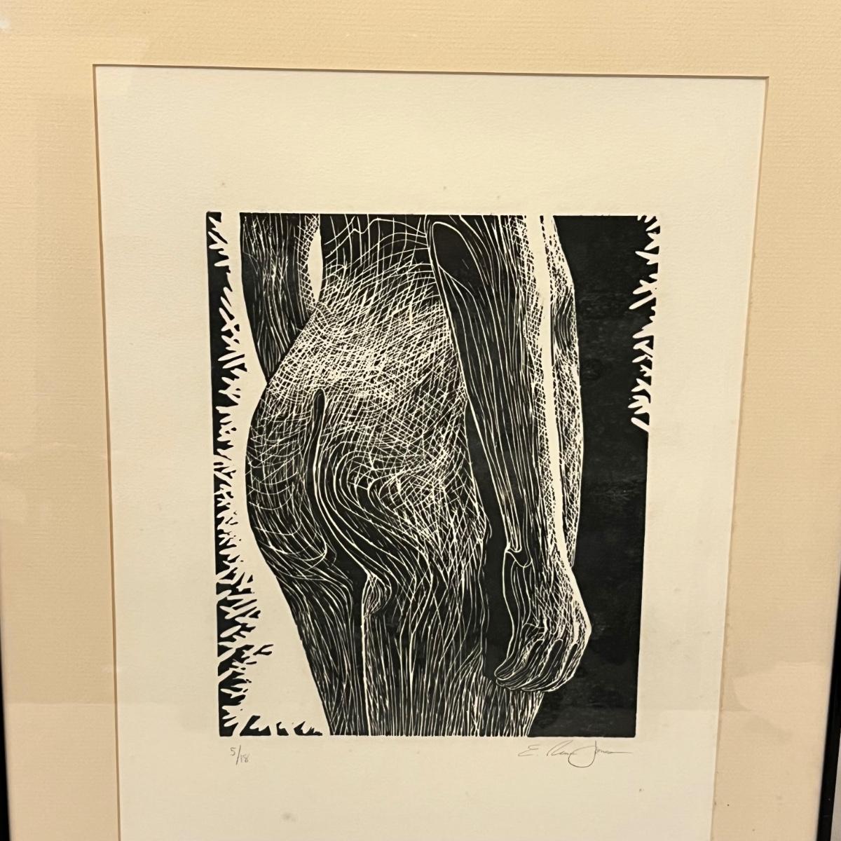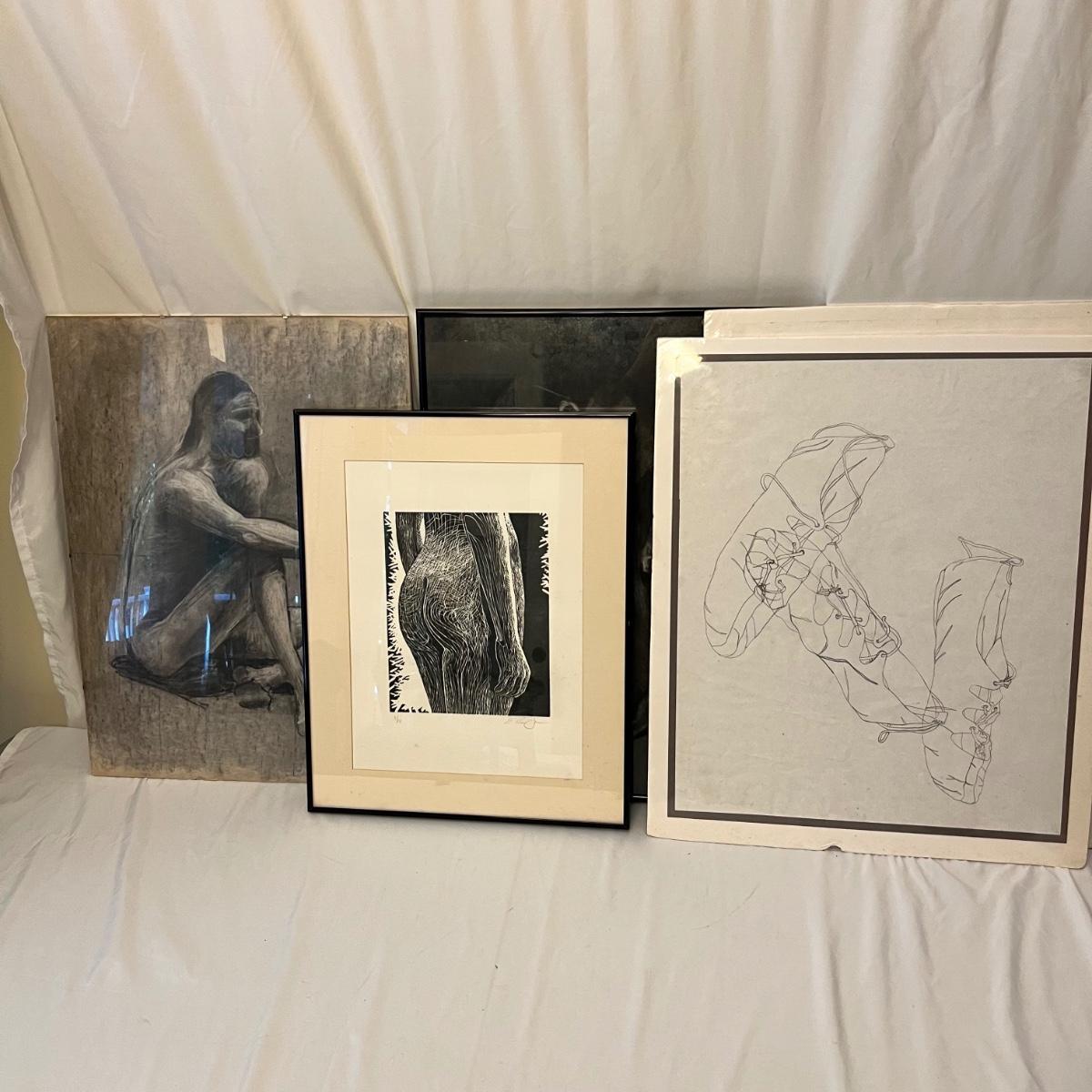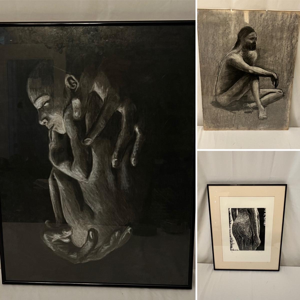 Five pieces of black, white and grayscale human form art. The female form in a black metal frame (measures 16” x 20”H) is pencil signed and numbered; signature is hard to read but is possibly E. Renee Jones. This is the only piece under glass but two more have plastic frames and plexiglass. The other two are unframed and in plastic sleeves.
