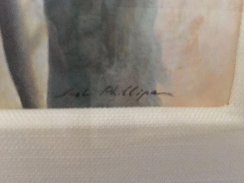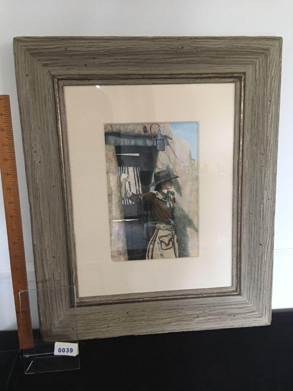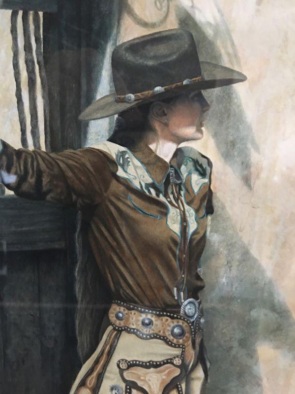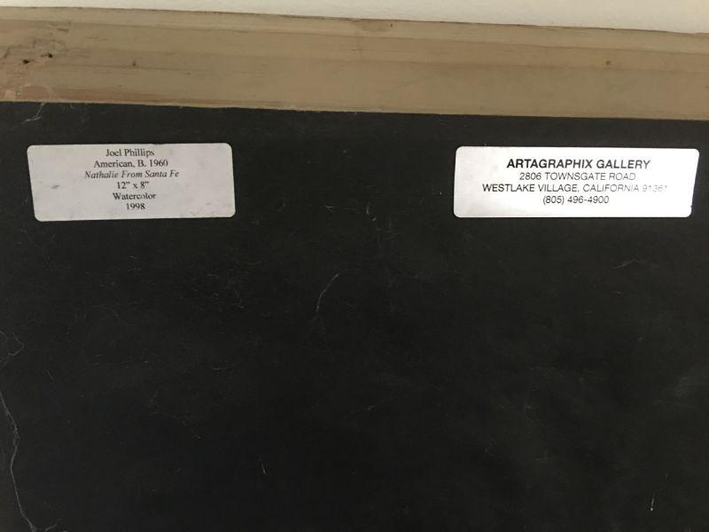 Significant original work by Joel Phillips. Watercolor of a Cowgirl by listed and noted artist. Titled "Nathalie, from Santa Fe" 1989. Highly detailed. Framed under glass. Excellent condition, wonderfully detailed.