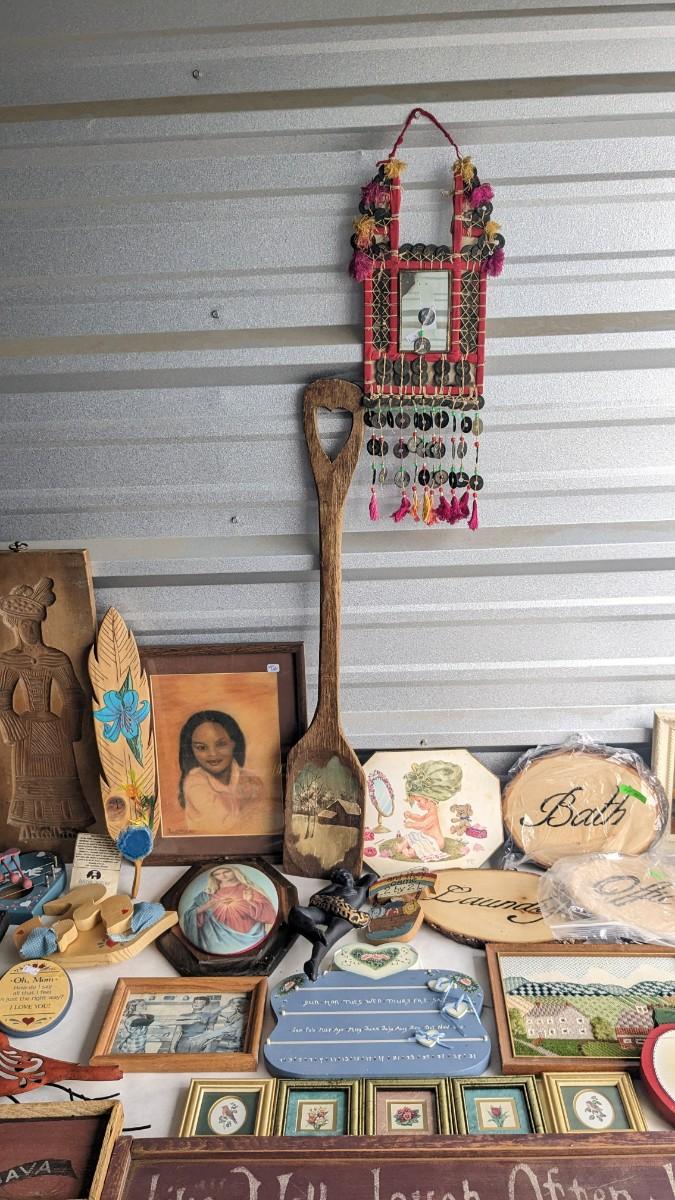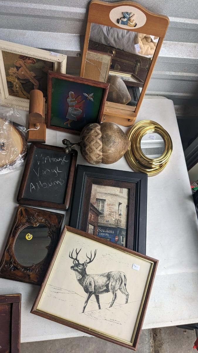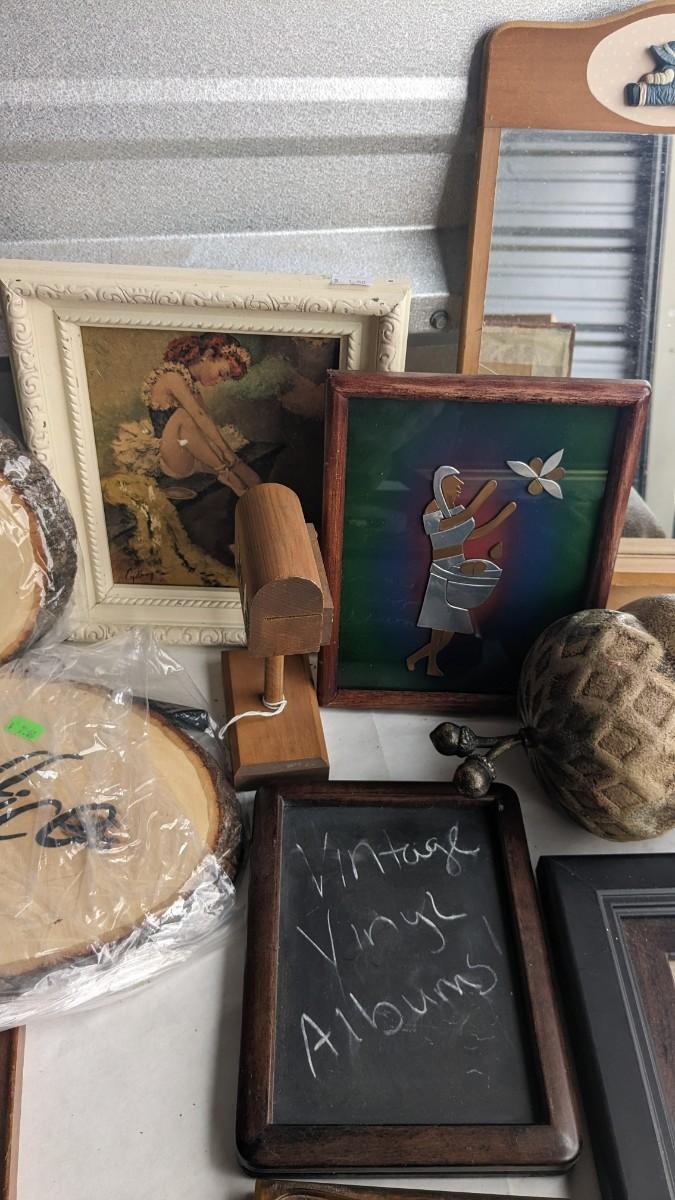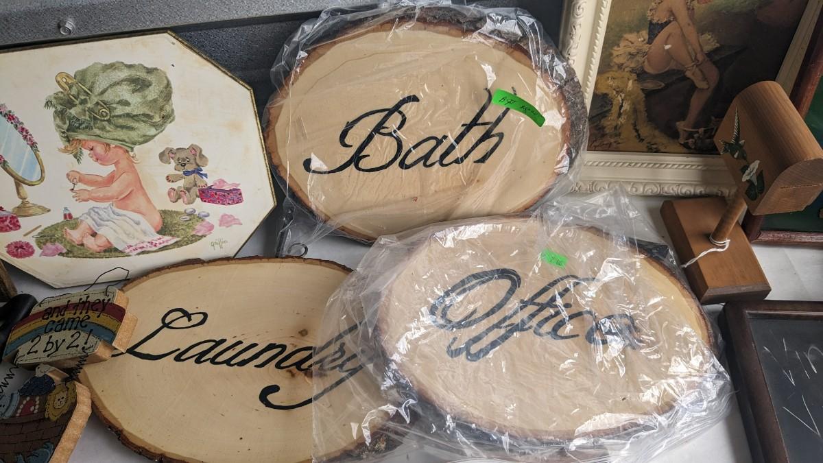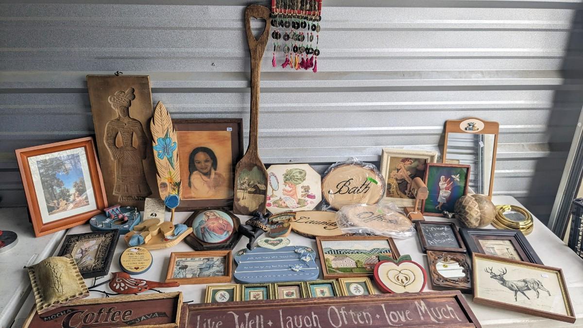 a lovely assortment of folk art type signs, framed art, and more! All in good useable condition and some fun stuff in here! No shipping. 2616