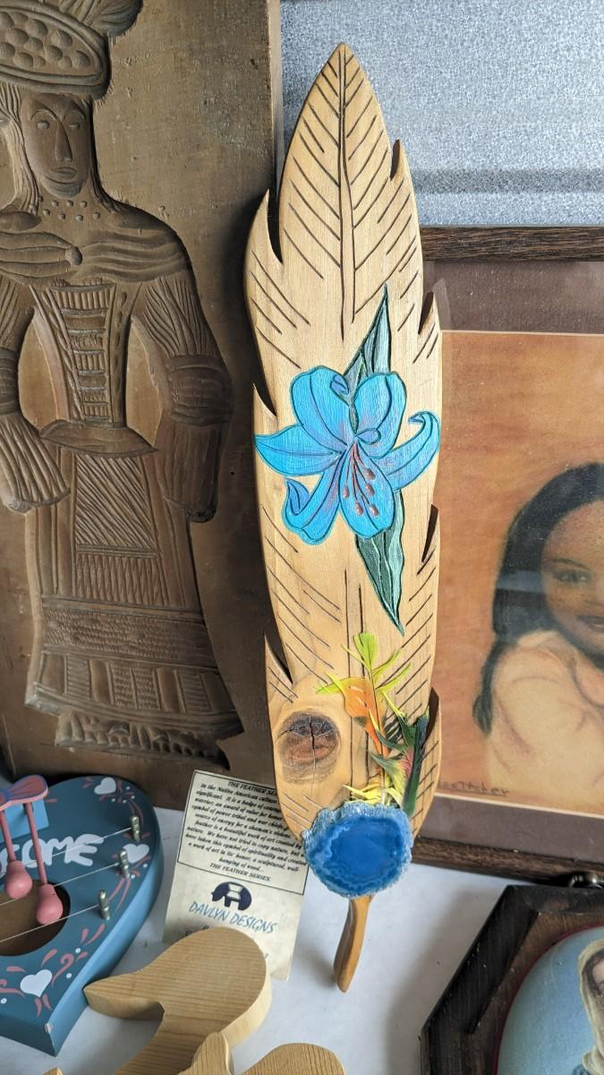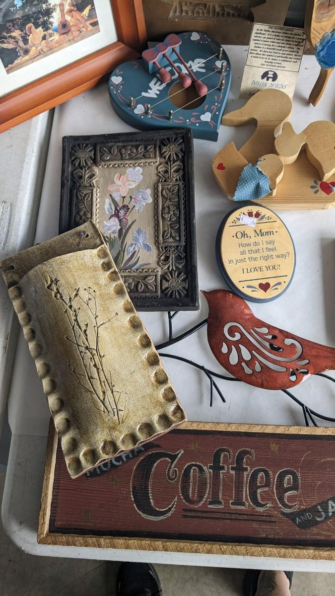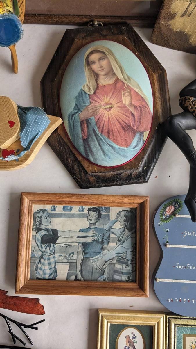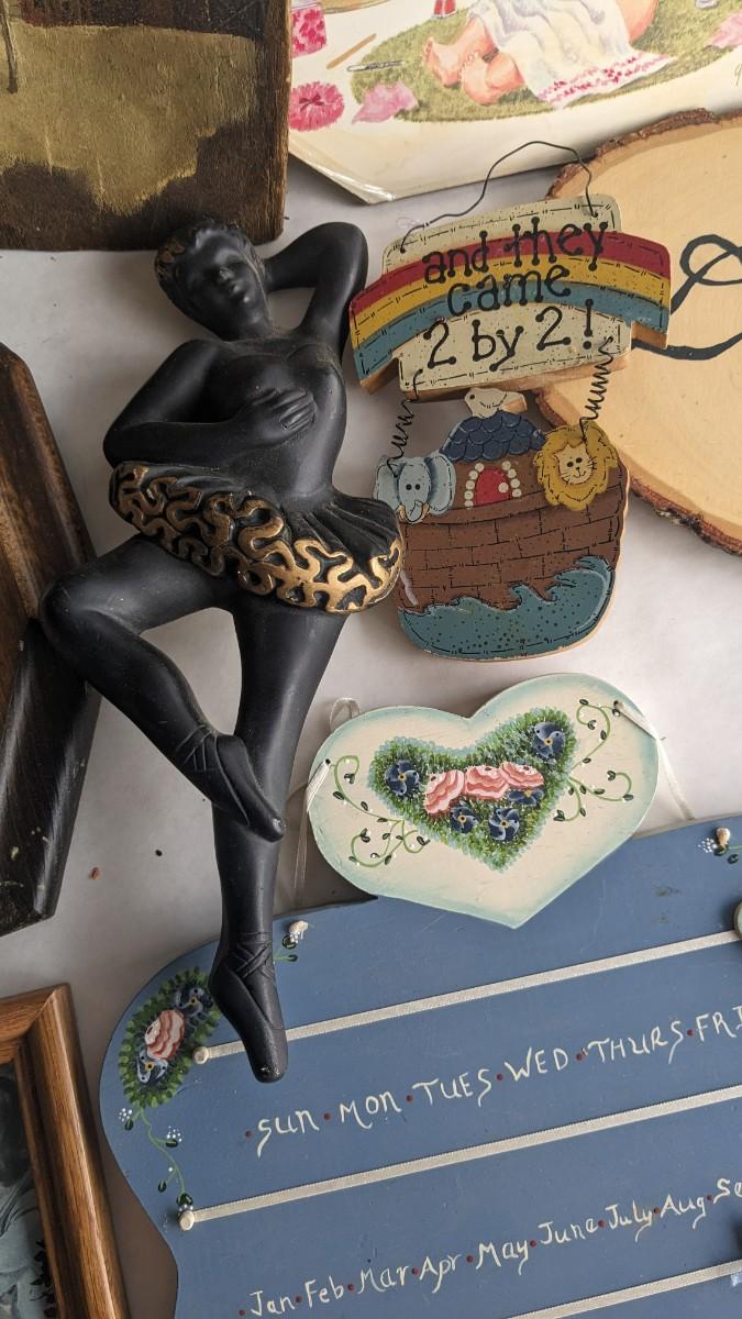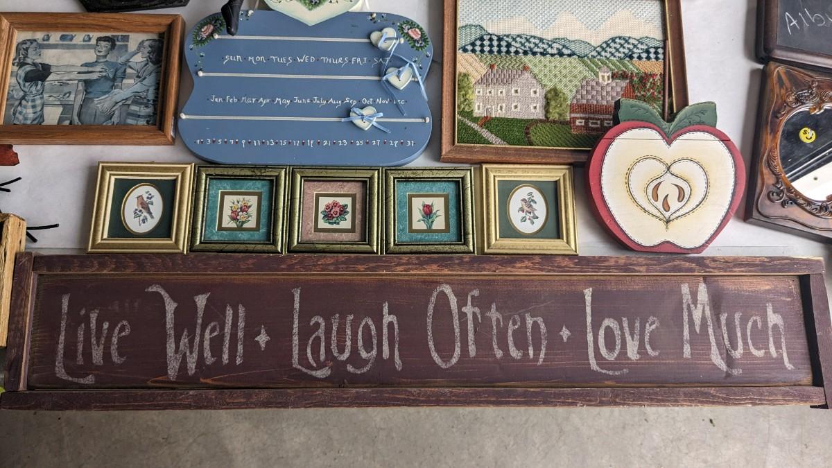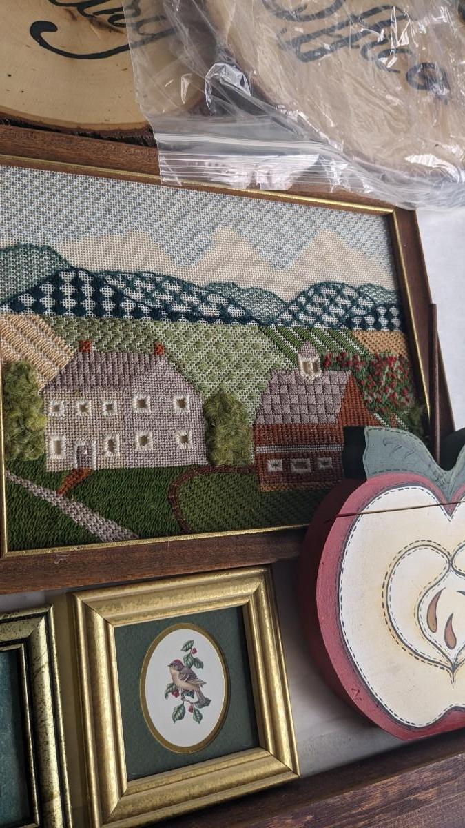 a lovely assortment of folk art type signs, framed art, and more! All in good useable condition and some fun stuff in here! No shipping. 2616